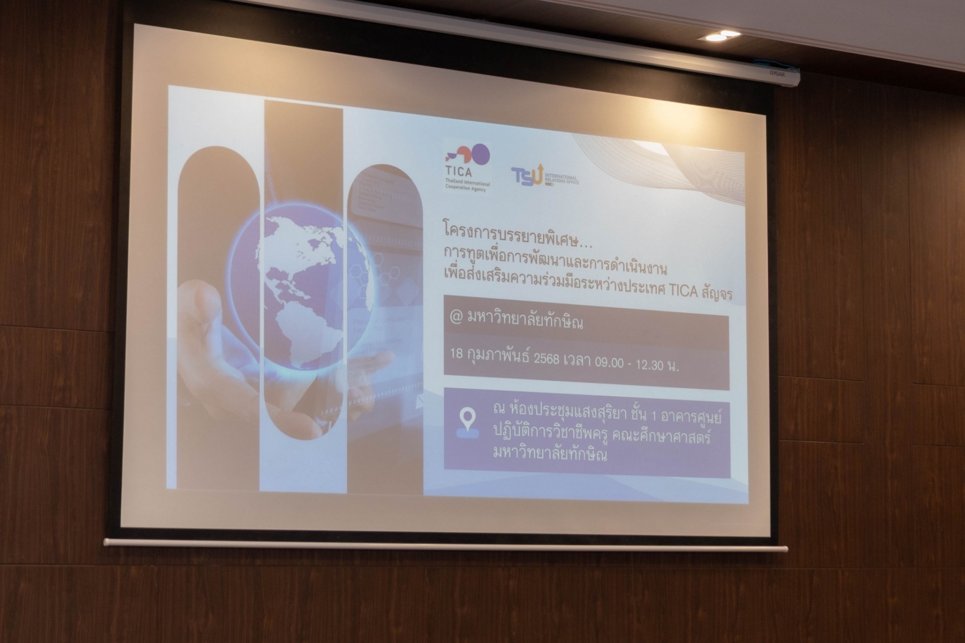 งานวิเทศสัมพันธ์ มหาวิทยาลัยทักษิณ ร่วมกับ กรมความร่วมมือระหว่างประเทศ (TICA) กระทรวงการต่างประเทศ จัดโครงการบรรยายพิเศษ “การทูตเพื่อการพัฒนาและการดำเนินงานเพื่อส่งเสริมความร่วมมือระหว่างประเทศ – TICA สัญจร” เมื่อวันที่ 18 กุมภาพันธ์ 2568 ณ ห้องประชุมแสงสุริยา คณะศึกษาศาสตร์ โดยมีรองศาสตราจารย์ ดร. สมัคร แก้วสุกแสง รองอธิการบดีฝ่ายวิจัยและนวัตกรรม เป็นประธานเปิดงาน