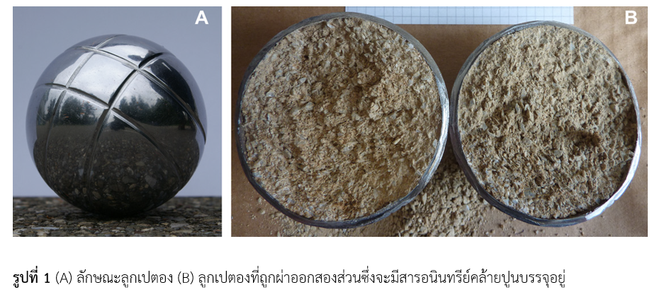 ลักษณะกายภาพของลูกเปตองที่ราคาถูกมักทำจากเปลือกโลหะทรงครึ่งวงกลมสองชิ้นที่มีความหนาประมาณ 2.5 มม. ซึ่งเชื่อมติดกัน (รูปที่ 1A) ข้างในลูกเปตองจะถูกเติมด้วยวัสดุอนินทรีย์คล้ายทราย อย่างไรก็ตาม ในบางกรณีวัสดุที่เติมจะแข็งตัวจึงดูเหมือนปูน (รูปที่ 1B) เปลือกของลูกบอลถูกเคลือบด้วยโครเมียมบาง ๆ ดังนั้น จึงมองไม่เห็นรอยเชื่อมจากภายนอก