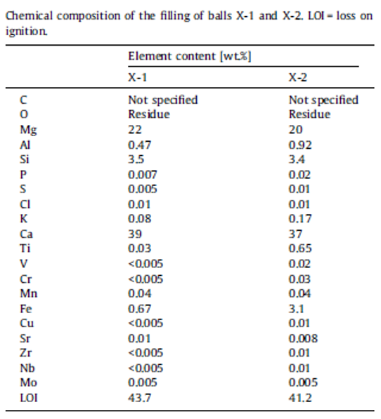 จากการศึกษาองค์ประกอบวัสดุที่บรรจุอยู่ในลูกเปตองพบว่าโดยส่วนใหญ่ประกอบด้วยควอตซ์ (SiO2) โดโลไมต์ (CaMg(CO3)2) และวูสไทต์ (FeO) และอาจมีธาตุอื่นปนอยู่ด้วยขึ้นอยู่กับบริษัทที่ผลิต ดังตัวอย่างองค์ประกอบในตาราง