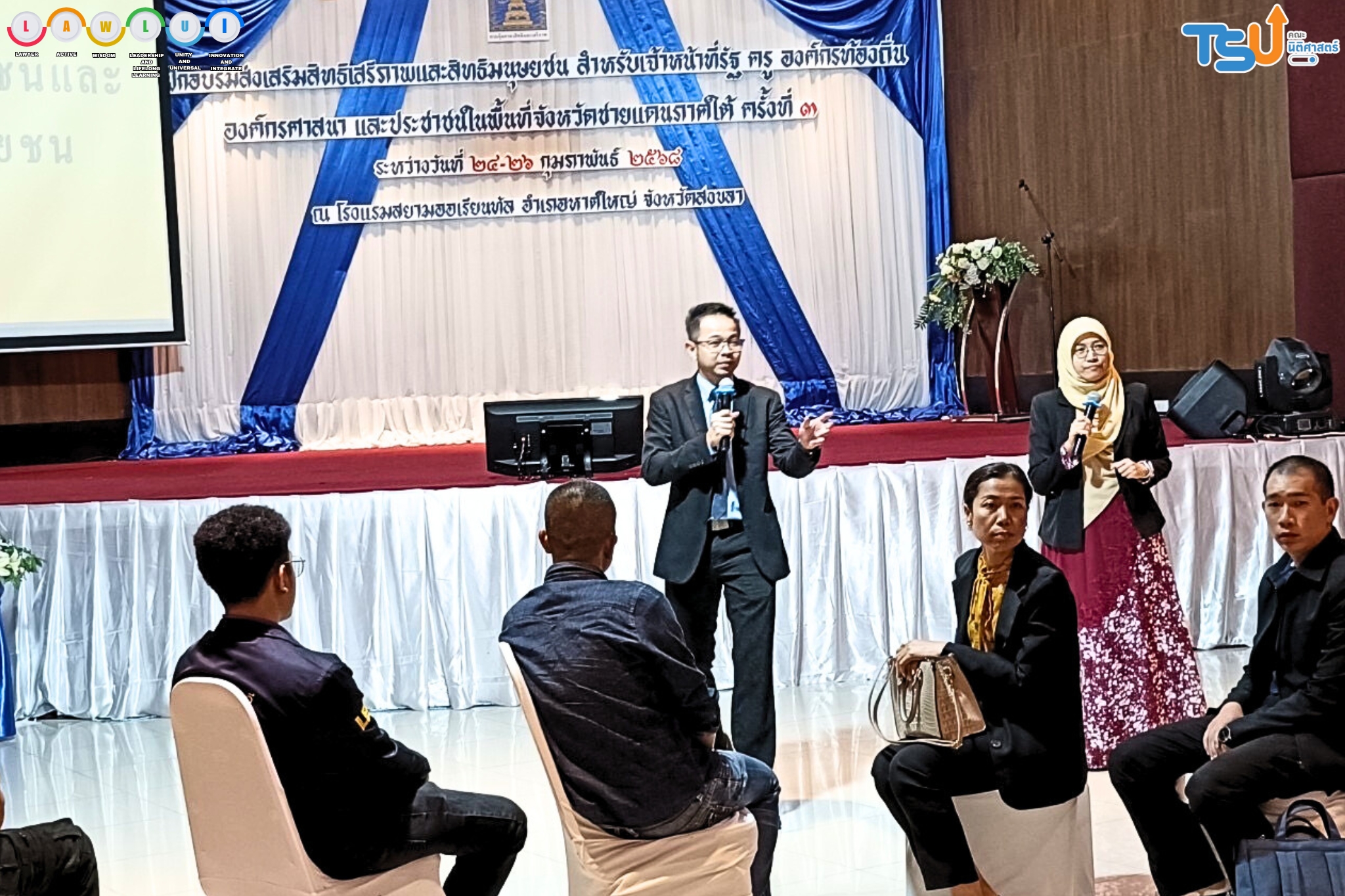 คลากรคณะนิติศาสตร์ มหาวิทยาลัยทักษิณ ผู้ช่วยศาสตราจารย์เจษฎา ทองขาว และอาจารย์นฤมล ฐานิสโร อาจารย์ประจำคณะนิติศาสตร์ ร่วมมือกับกรมคุ้มครองสิทธิและเสรีภาพ กระทรวงยุติธรรม ทำหน้าที่เป็นวิทยากรกระบวนการโครงการฝึกอบรมส่งเสริมสิทธิเสรีภาพและสิทธิมนุษยชน ในพื้นที่จังหวัดชายแดนภาคใต้ ครั้งที่ 3