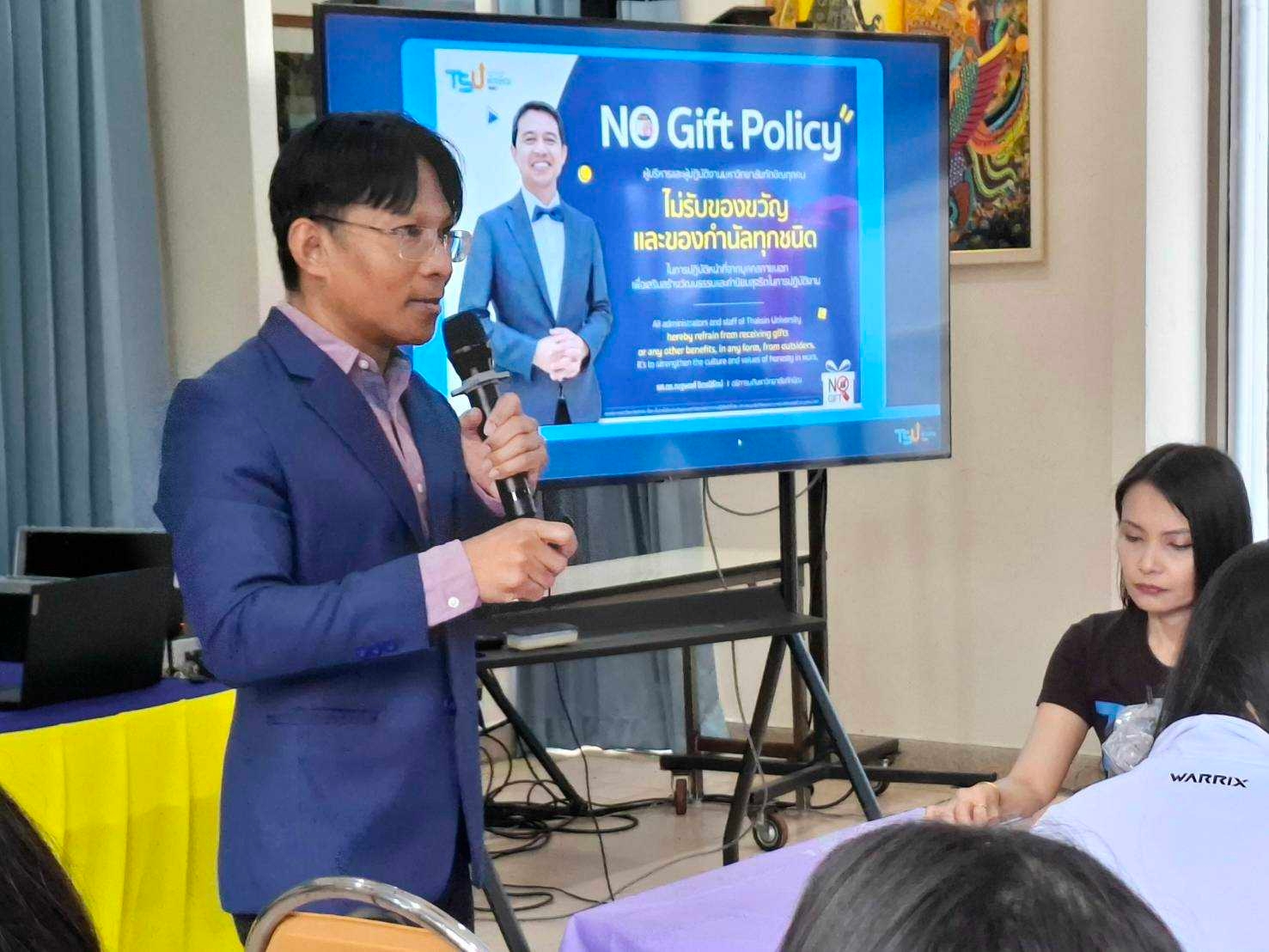 ชาวมหาวิทยาลัยทักษิณ ยืนหยัด ประกาศเจตนารมณ์ No Gift Policy จัดอบรมปลุกจิตสำนึกและสร้างวัฒนธรรมองค์กรในการปฏิเสธการรับของขวัญและของกำนัลทุกชนิดจากการปฏิบัติหน้าที่