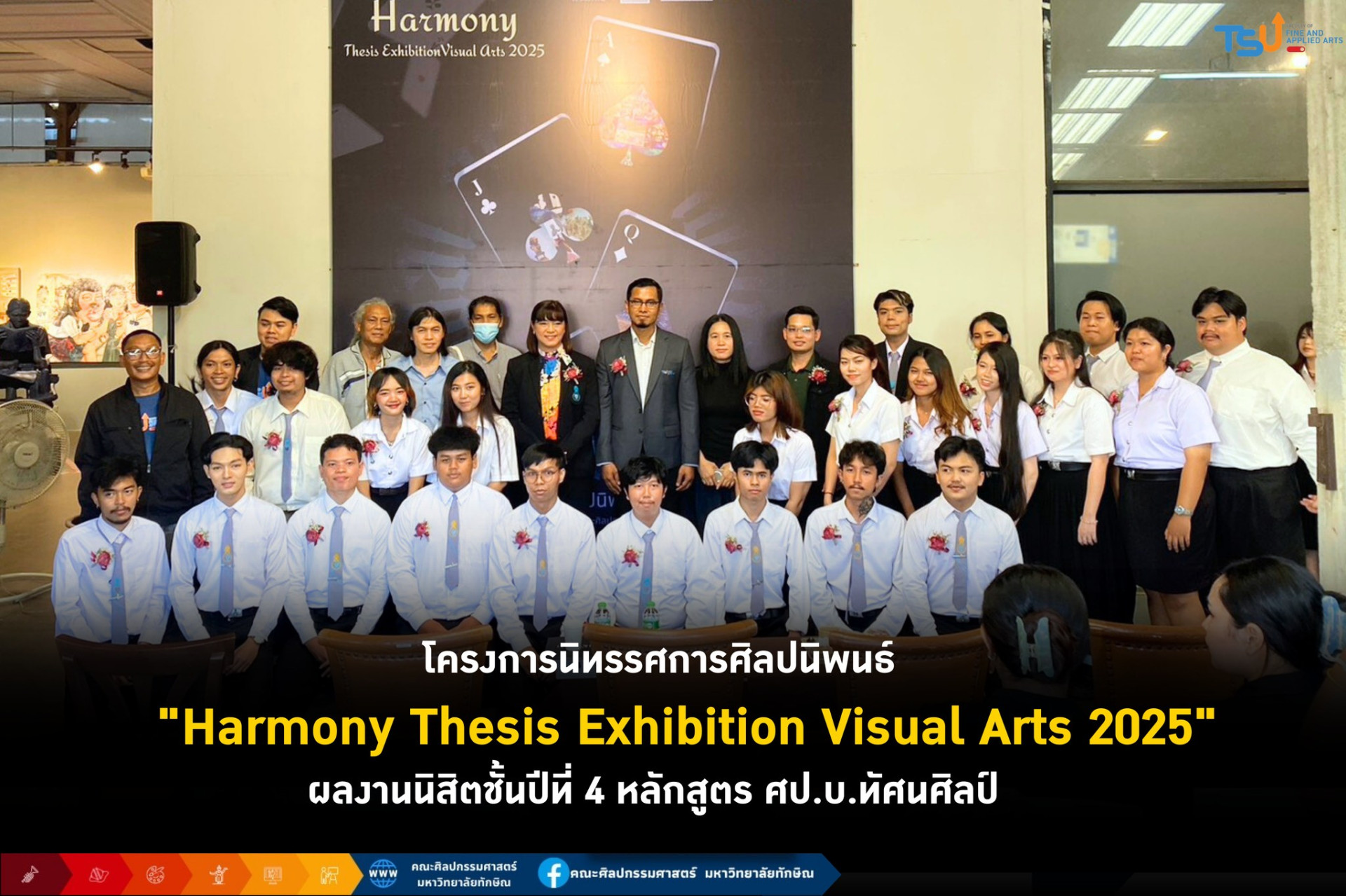 หลักสูตร ศป.บ. ทัศนศิลป์ คณะศิลปกรรมศาสตร์ มหาวิทยาลัยทักษิณ จัดโครงการนิทรรศการศิลปนิพนธ์ "Harmony Thesis Exhibition Visual Arts 2025" ครั้งที่ 28 จัดแสดงผลงานนิสิตชั้นปีที่ 4 หลักสูตร ศป.บ.ทัศนศิลป์ โดยมีอาจารย์วีณา ลีลาประเสริฐศิลป์ รองอธิการบดีวิทยาเขตสงขลา เป็นประธานกล่าวเปิดงาน มีผู้บริหาร คณาจารย์ และนิสิตคณะศิลปกรรมศาสตร์ นำโดย รองศาสตราจารย์ยอดชาย พรหมอินทร์ รองคณบดีฝ่ายวิชาการ วิจัยและนวัตกรรม กล่าวต้อนรับ โดยภายในงานมีศิลปินทางด้านศิลปะ รวมถึงบุคลากรทั้งภายในและภายนอกสถาบัน เข้าร่วมรับชมผลงาน โดยมีพิธีเปิดในวันศุกร์ที่ 7 มีนาคม 2568 ณ Songkhal Art Center 1 Songkhal Art Mill. หอศิลป์ จังหวัดสงขลา