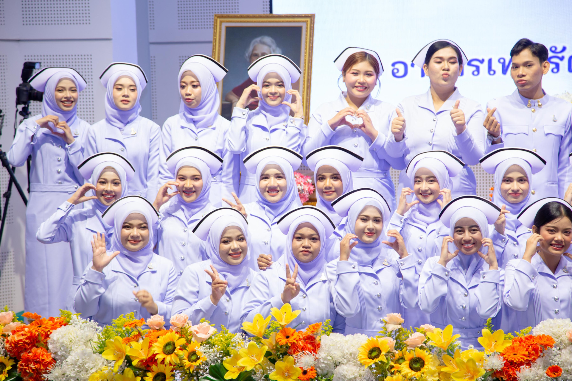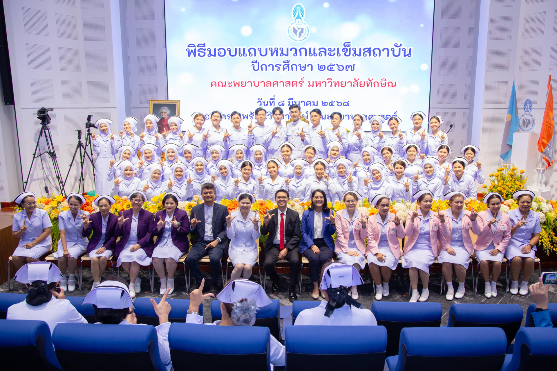 คณะพยาบาลศาสตร์ มหาวิทยาลัยทักษิณ จัดพิธีมอบแถบหมวกและเข็มสถาบัน แก่ผู้สำเร็จการศึกษาหลักสูตรพยาบาลศาสตรบัณฑิต ประจำปี 2567 พร้อมทั้งคณะผู้บริหาร คณาจารย์ บุคลากร นิสิตและผู้ปกครองเข้าร่วมงานอย่างอบอุ่น บรรยายกาศในห้องประชุม 300 เต็มไปด้วยรอยยิ้มแห่งความยินดี และน้ำตาแห่งความภาคภูมิ กับบัณฑิตจำนวนผู้สำเร็จหลักสูตรทั้งหมด 46 คน พร้อมทั้งคุณธรรมจริยธรรม รวมถึงความรับผิดชอบของตนเองที่มีต่อประชนชนผู้ใช้บริการและสังคม สมกับเป็นผู้ที่มีคุณสมบัติและมีเกียรติควรแก่การสวมเครื่องแบบพยาบาลที่สมบูรณ์พร้อมด้วยแถบหมวกและเข็มสถาบัน