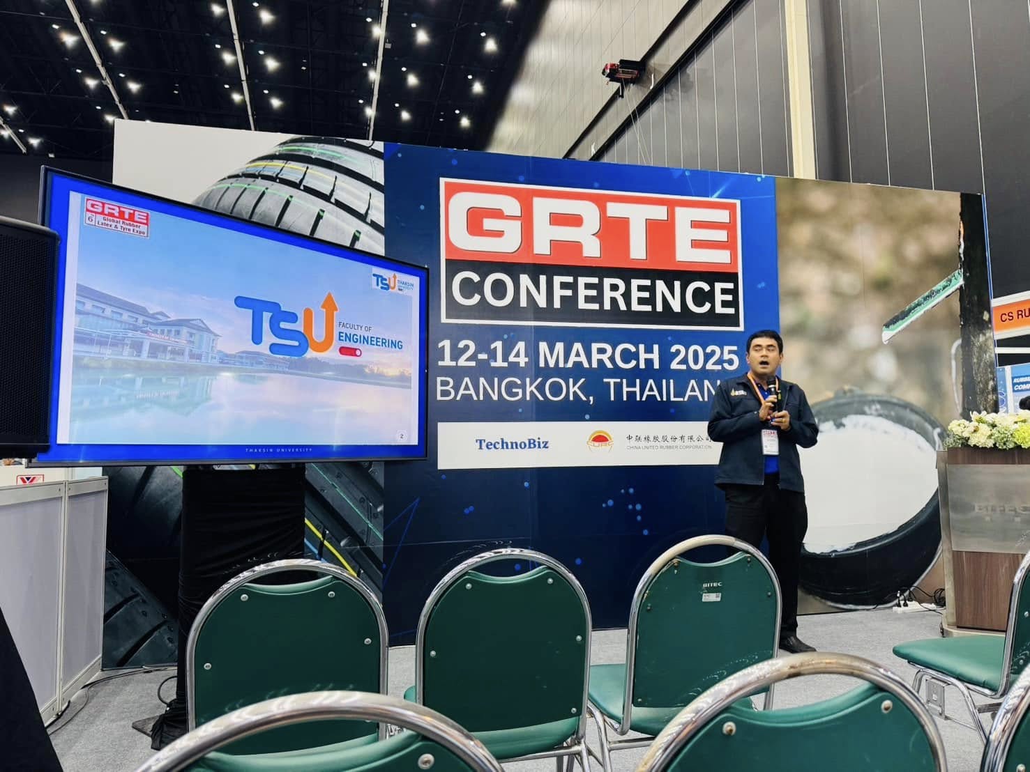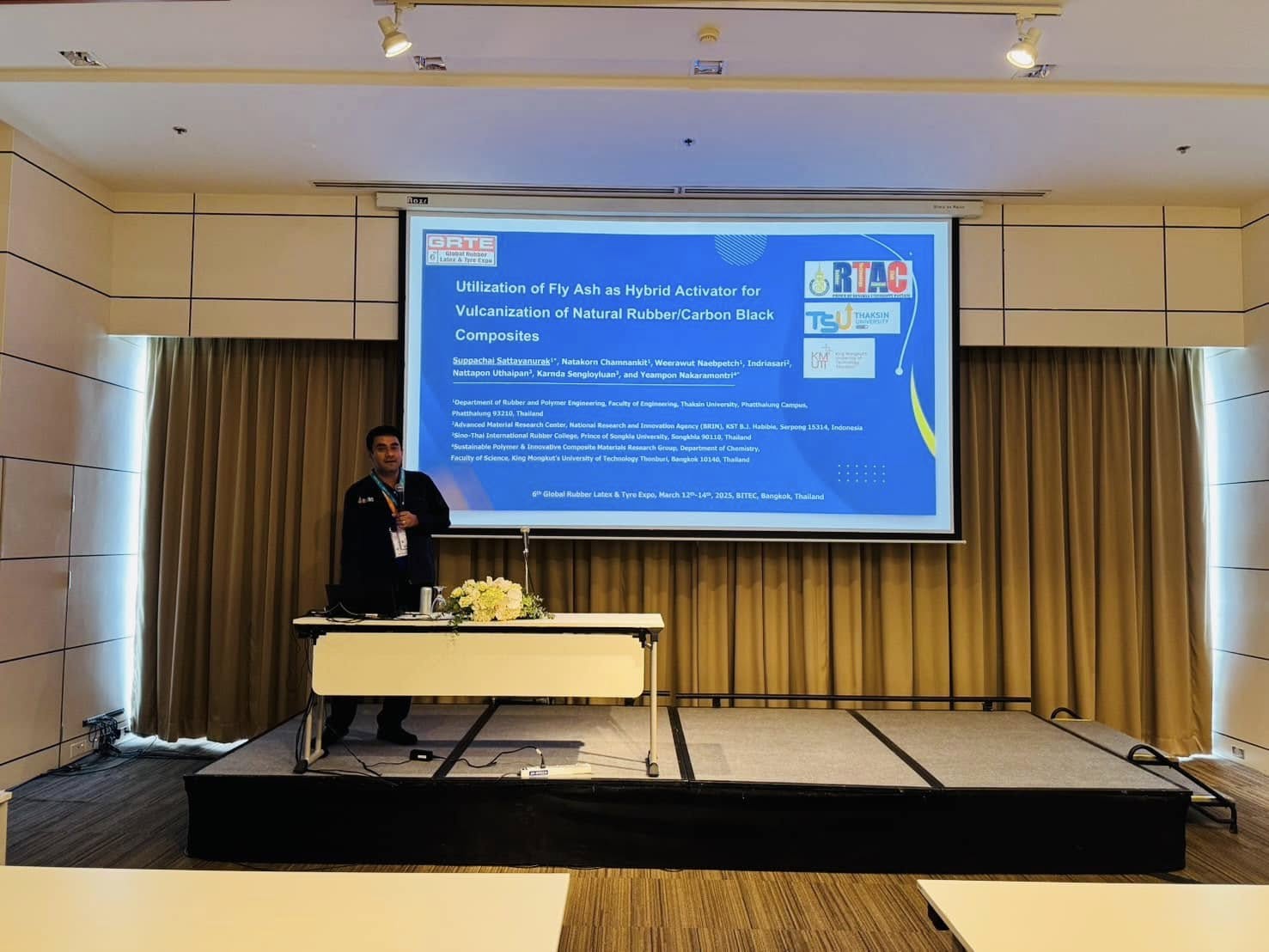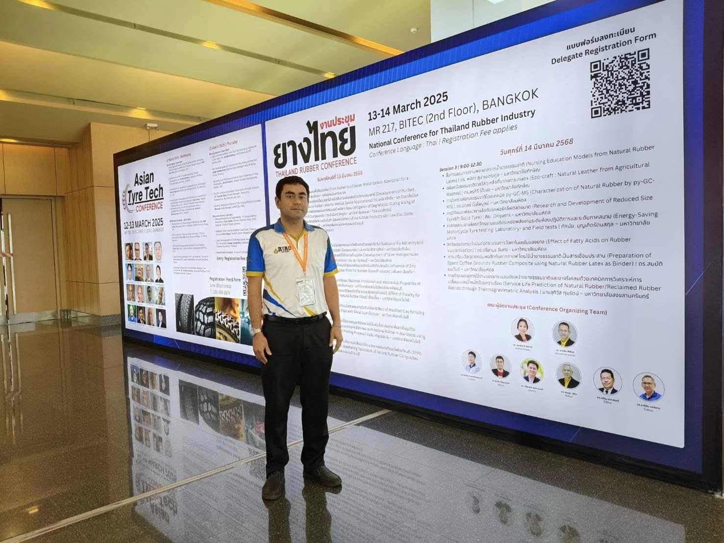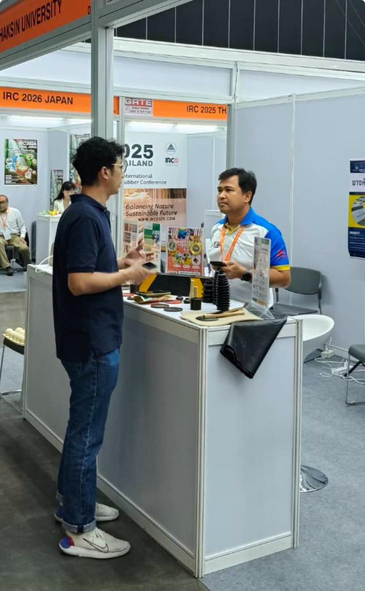 - อาจารย์ ดร. วีระวุฒิ แนบเพชร ในการนำเสนองานแบบโปสเตอร์ เรื่อง Utilization of Mixed Vulcanization in High Loading Biomass Filled NR Compounds ในงานประชุมวิชาการยางพาราไทย Thailand Rubber Conference เมื่อวันที่ 14 มีนาคม 2568 ณ ศูนย์นิทรรศการและการประชุมไบเทค บางนา กรุงเทพ ฯ มีเนื้อหาการประชุมด้านเทคโนโลยียางที่น่าสนใจ ให้ผู้เข้าร่วมประชุมได้รับข้อมูลความรู้ใหม่ ๆ เพื่อนำไปประยุกต์ใช้ในอุตสาหกรรมยางเชิงพานิชย์ได้เป็นอย่างดี นอกจากนี้ อาจารย์ ดร. ศุภชัย สัตยานุรักษ์ รองคณบดีฝ่ายวิชาการและวิเทศสัมพันธ์ ยังได้พบปะพูดคุยเพื่อสร้างความร่วมมือในเรื่องทุนวิจัยระดับบัณฑิตศึกษา รวมไปถึงสร้างความร่วมมือกับศูนย์ถ่ายทอดเทคโนโลยียางเพื่อชุมชน เป็นการสร้างงานสร้างรายได้อย่างต่อเนื่อง