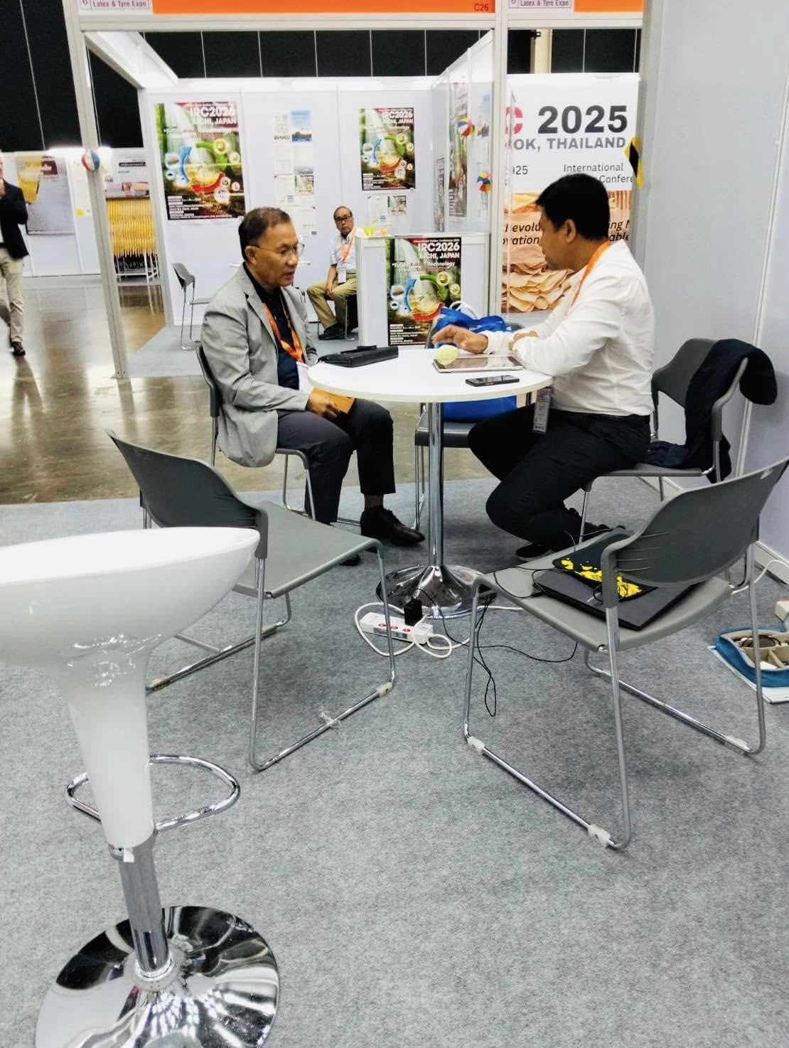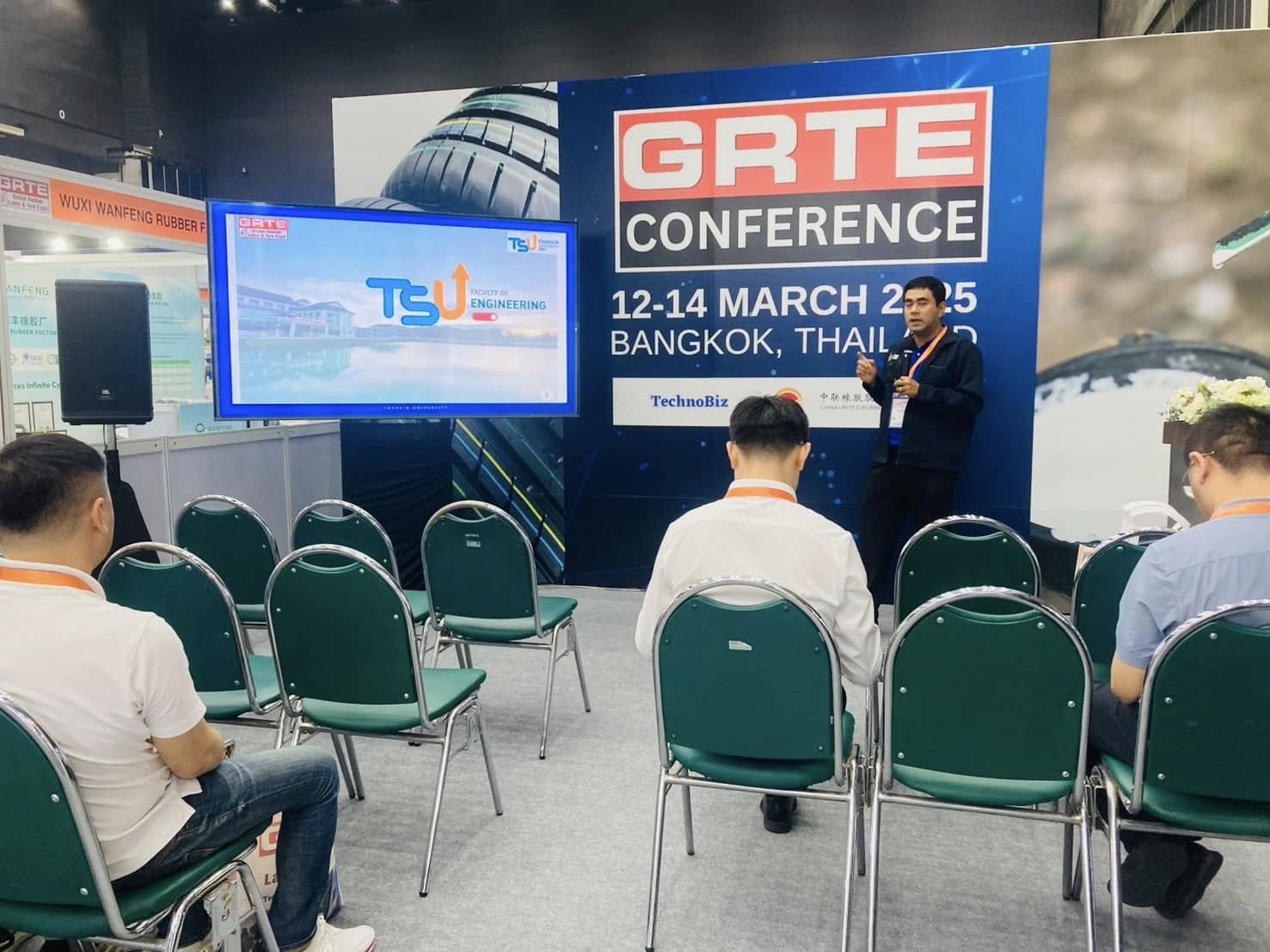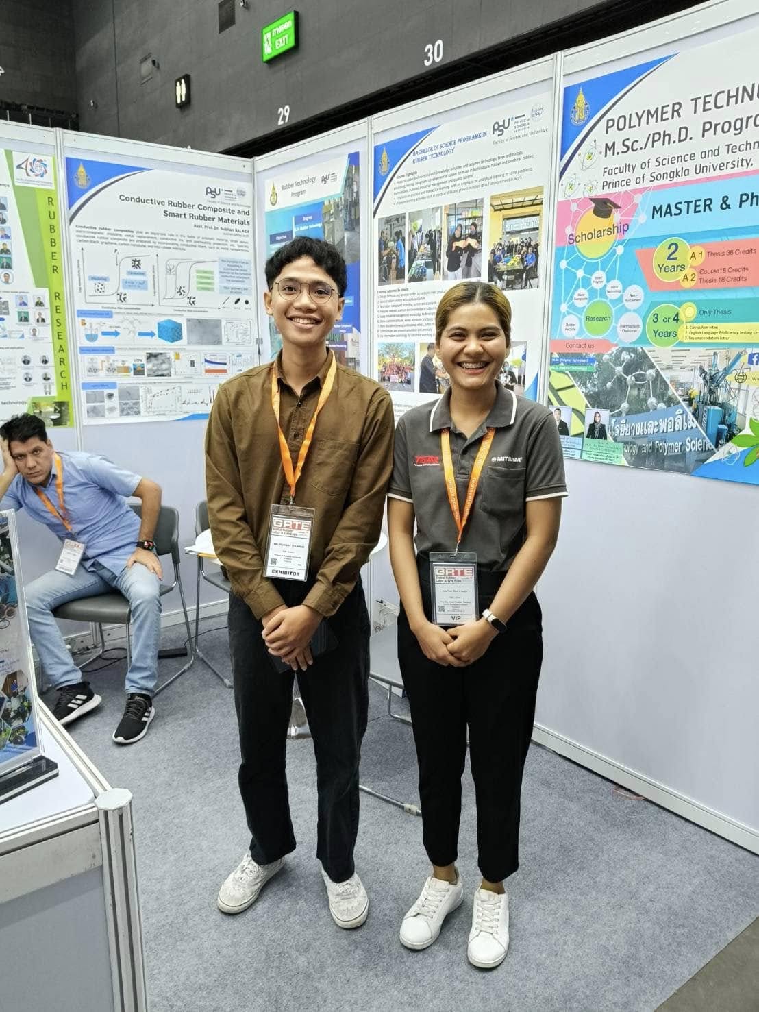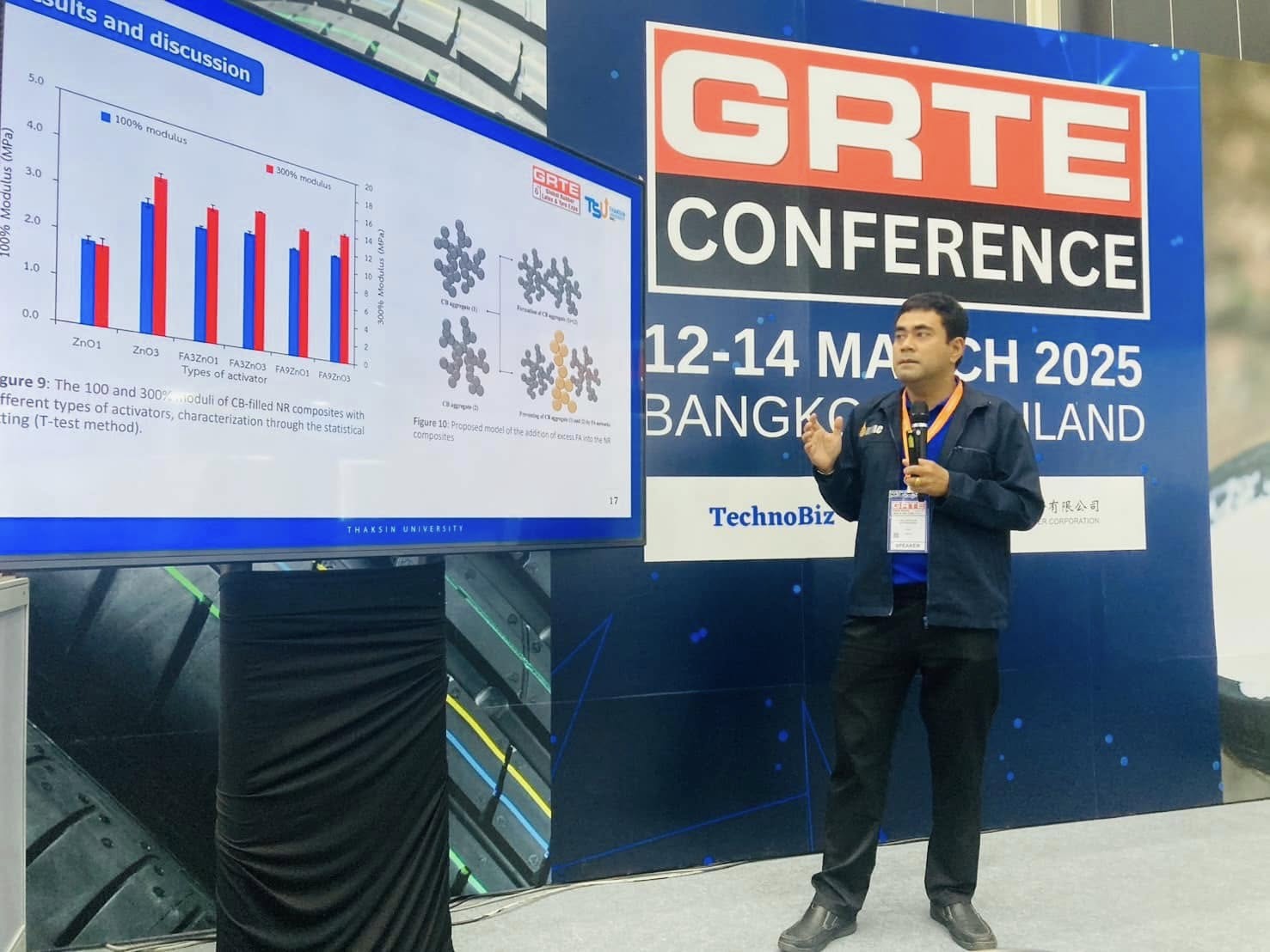 - อาจารย์ ดร. วีระวุฒิ แนบเพชร ในการนำเสนองานแบบโปสเตอร์ เรื่อง Utilization of Mixed Vulcanization in High Loading Biomass Filled NR Compounds ในงานประชุมวิชาการยางพาราไทย Thailand Rubber Conference เมื่อวันที่ 14 มีนาคม 2568 ณ ศูนย์นิทรรศการและการประชุมไบเทค บางนา กรุงเทพ ฯ มีเนื้อหาการประชุมด้านเทคโนโลยียางที่น่าสนใจ ให้ผู้เข้าร่วมประชุมได้รับข้อมูลความรู้ใหม่ ๆ เพื่อนำไปประยุกต์ใช้ในอุตสาหกรรมยางเชิงพานิชย์ได้เป็นอย่างดี นอกจากนี้ อาจารย์ ดร. ศุภชัย สัตยานุรักษ์ รองคณบดีฝ่ายวิชาการและวิเทศสัมพันธ์ ยังได้พบปะพูดคุยเพื่อสร้างความร่วมมือในเรื่องทุนวิจัยระดับบัณฑิตศึกษา รวมไปถึงสร้างความร่วมมือกับศูนย์ถ่ายทอดเทคโนโลยียางเพื่อชุมชน เป็นการสร้างงานสร้างรายได้อย่างต่อเนื่อง