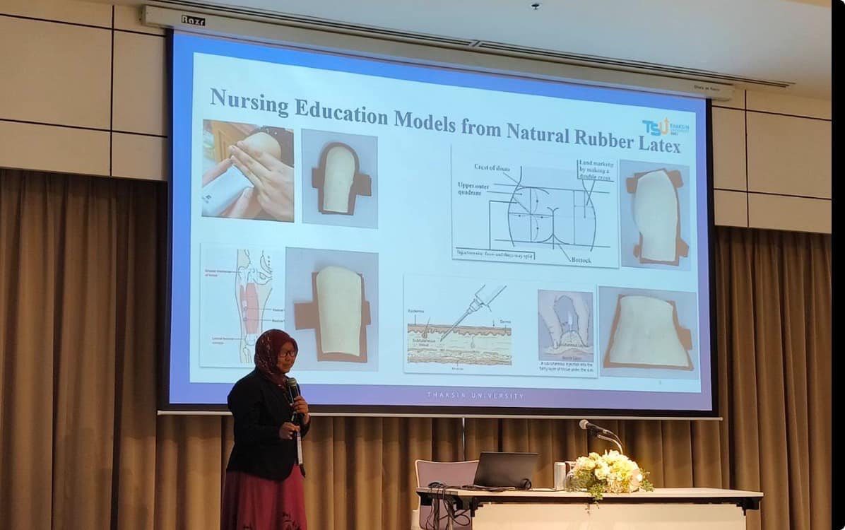 - ผศ.ดร.พนิตา สุมานะตระกูล ประธานหลักสูตรวิศวกรรมยางและพอลิเมอร์ นำเสนอผลงานทางวิชาการแบบบรรยายเรื่องสื่อการสอนทางงานพยาบาลจากน้ำยางธรรมชาติ