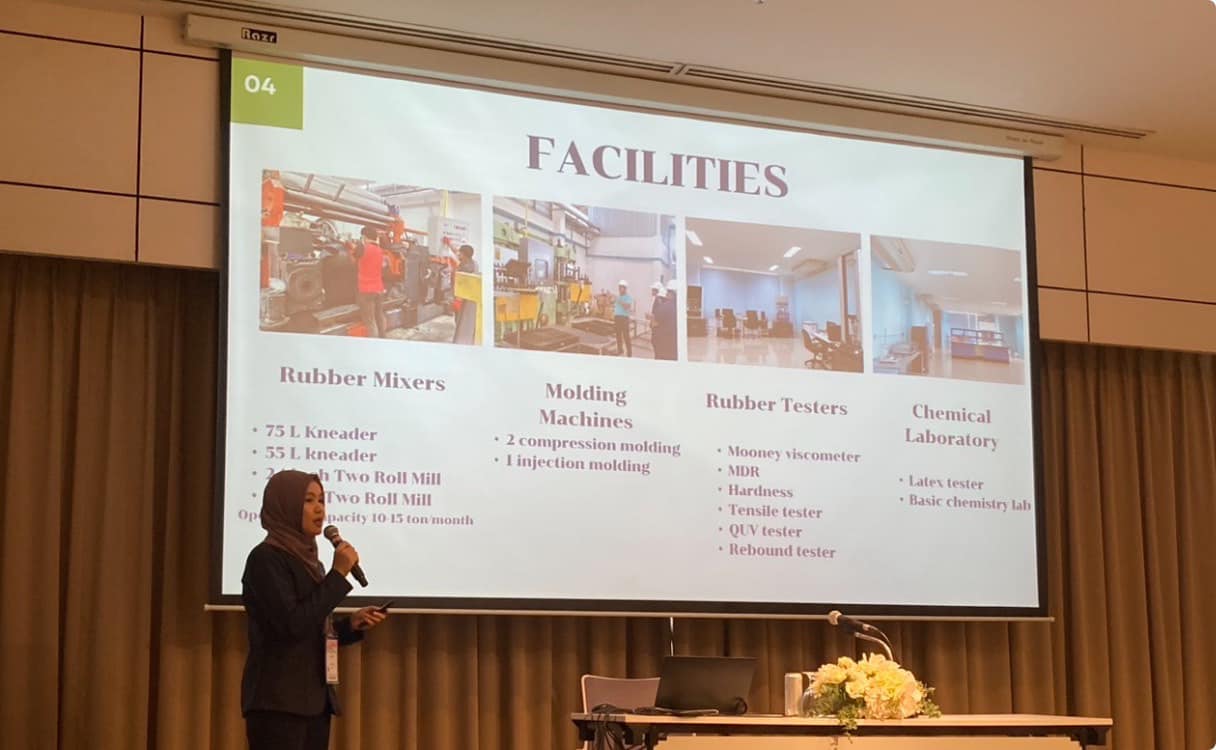- ดร. พรศิริ โต๊ะแอ รองผู้จัดการศูนย์ถ่ายทอดเทคโนโลยียาง นำเสนอผลงานทางวิชาการแบบบรรยายเรื่องแผ่นหนังธรรมชาติจากวัสดุเหลือทิ้งทางการเกษตร