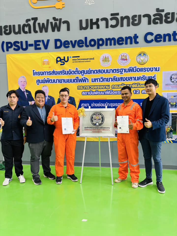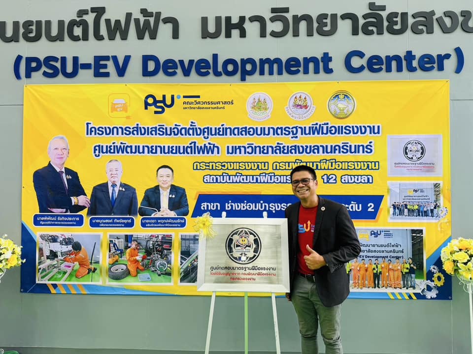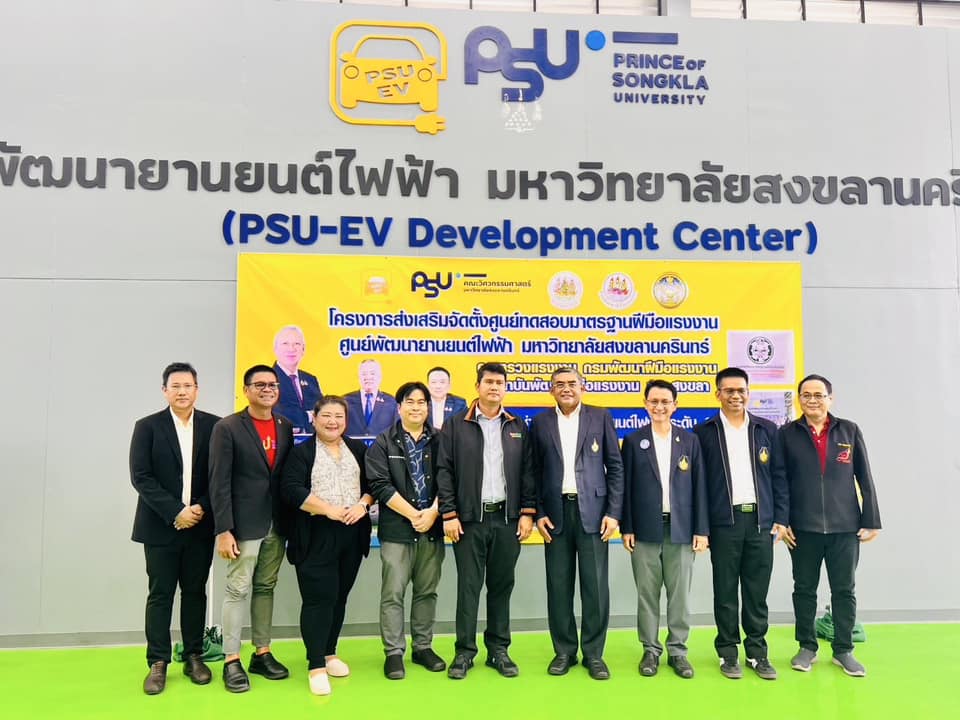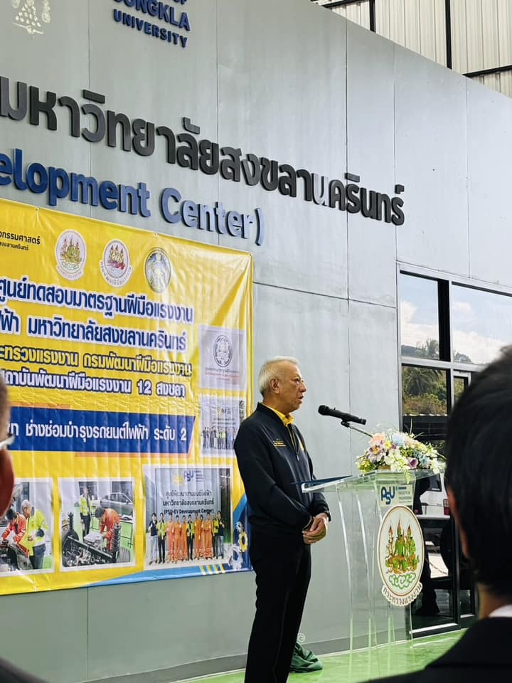 รองศาสตราจารย์ ดร.จตุพร แก้วอ่อน คณบดี คณะวิศวกรรมศาสตร์ มหาวิทยาลัยทักษิณ ร่วมกับเครือข่ายเข้าร่วมพิธีมอบป้ายศูนย์ทดสอบมาตฐานฝีมือแรงงาน สาขาช่างซ่อมบำรุงรถยนต์ไฟฟ้า ระดับ 2 และร่วมเป็นเกียรติในพิธี มอบวุฒิบัตรทดสอบมาตรฐานฝีมือแรงงาน ซึ่งมหาวิทยาลัยสงขลานครินทร์ ได้จัดพิธีรับมอบใบอนุญาตเป็นผู้ดำเนินการทดสอบมาตรฐานฝีมือแรงงาน สาขาช่างรถยนต์ไฟฟ้า ระดับที่ 2 โดยได้รับเกียรติจากนายพิพัฒน์ รัชกิจประการ รัฐมนตรีว่าการกระทรวงแรงงาน เป็นประธานและเป็นผู้มอบใบอนุญาต โดยมีผู้ช่วยศาสตราจารย์ ดร.นิวัติ แก้วประดับ อธิการบดีมหาวิทยาลัยสงขลานครินทร์ กล่าวต้อนรับ ผู้ช่วยศาสตราจารย์ ดร. นิคม สุวรรณวร คณบดีคณะวิศวกรรมศาสตร์กล่าวถึงพันธกิจของศูนย์ PSU – EV ภายใต้การดำเนินของคณะวิศวกรรมศาสตร์ และนายเดชา พฤกษ์พัฒนรักษ์ อธิบดีกรมพัฒนาฝีมือแรงงาน เมื่อวันที่ 14 มีนาคม 2568 ที่ผ่านมา ณ ศูนย์พัฒนายานยนต์ไฟฟ้า มหาวิทยาลัยสงขลานครินทร์ (PSU-EV Development Center)