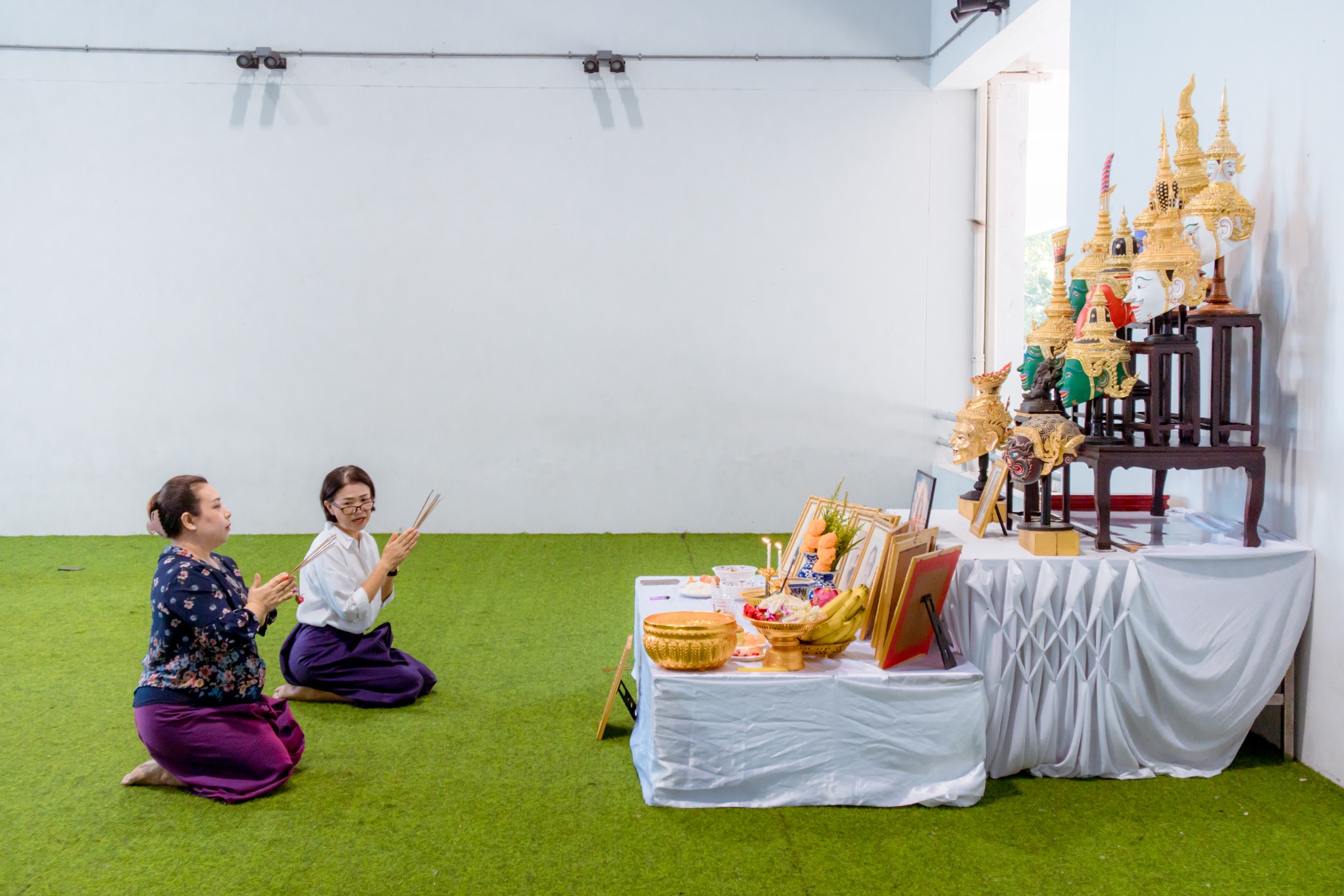 หลักสูตรศิลปกรรมศาสตรบัณฑิต สาขาวิชาศิลปะการแสดง จัดพิธีบวงสรวงครูก่อนการนำเสนอผลงานศิลปะการแสดงนิพนธ์ของนิสิตชั้นปีที่ 4 "วิถีคนบก กินไข่ เลี้ยงเป็ด เดือน 11 ไปลากพระ"