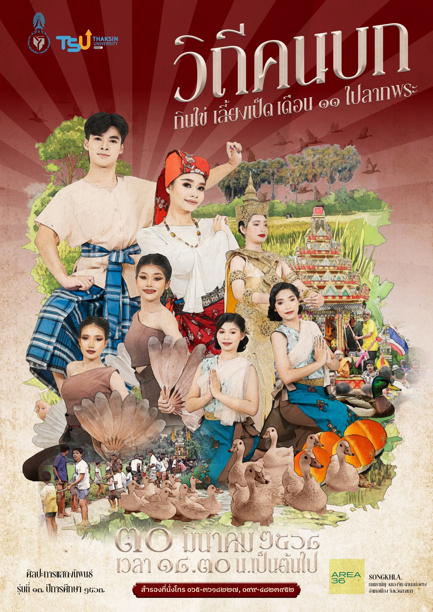 สำหรับการแสดงศิลปนิพนธ์ ประจำปีการศึกษา 2567 เป็นการนำเสนอศิลปะการแสดงนิพนธ์ ของนิสิตชั้นปีที่ 4 วิชาเอกนาฏศิลป์ไทย รุ่นที่ 17 ภายใต้ธีม "วิถีคนบก กินไข่ เลี้ยงเป็ด เดือน 11 ไปลากพระ" กำหนดจัดขึ้นในวันอาทิตย์ที่ 30 มีนาคม 2568 เวลา 18.30 น. เป็นต้นไป ณ Area36 Songkhla ถนนรามัญ-หนองจิก ตำบลบ่อยาง อำเภอเมือง จังหวัดสงขลา (โรงเรียนสตรีวชิรานุกูลเก่า สงขลา) ความเกี่ยวเนื่องของชุดการแสดงจะเป็นการนำเสนอเรื่องราววิถีคนบกในลุ่มน้ำทะเลสาบสงขลา ที่จะนำเสนอผ่านรูปแบบศิลปะการแสดง จำนวน 3 ชุดการแสดง ประกอบด้วย