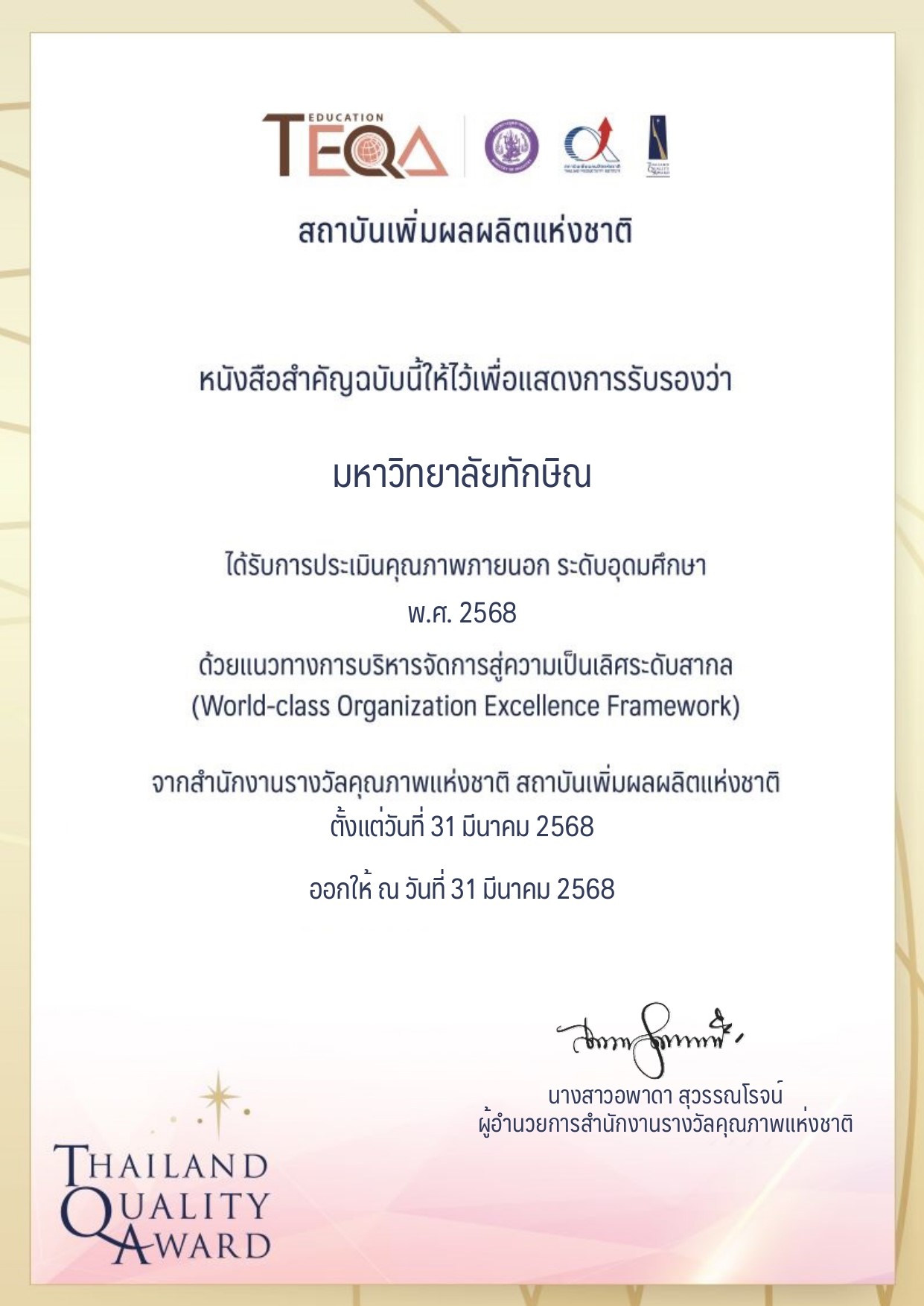 มหาวิทยาลัยทักษิณ ผ่านการรับรองรายงานการประเมินคุณภาพภายนอกระดับอุดมศึกษา ประจำปี พ.ศ. 2568 จากสถาบันเพิ่มผลผลิตแห่งชาติ ตามกรอบแนวทาง World-class Organization Excellence Framework ซึ่งมุ่งเน้นการบริหารจัดการเพื่อความเป็นเลิศในระดับนานาชาติ