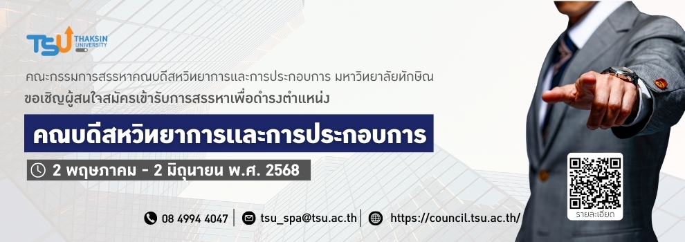 ขอเชิญผู้สนใจสมัครเข้ารับการสรรหาเพื่อดำรงตำแหน่งคณบดีคณะสหวิทยาการเเละการประกอบการ มหาวิทยาลัยทักษิณ