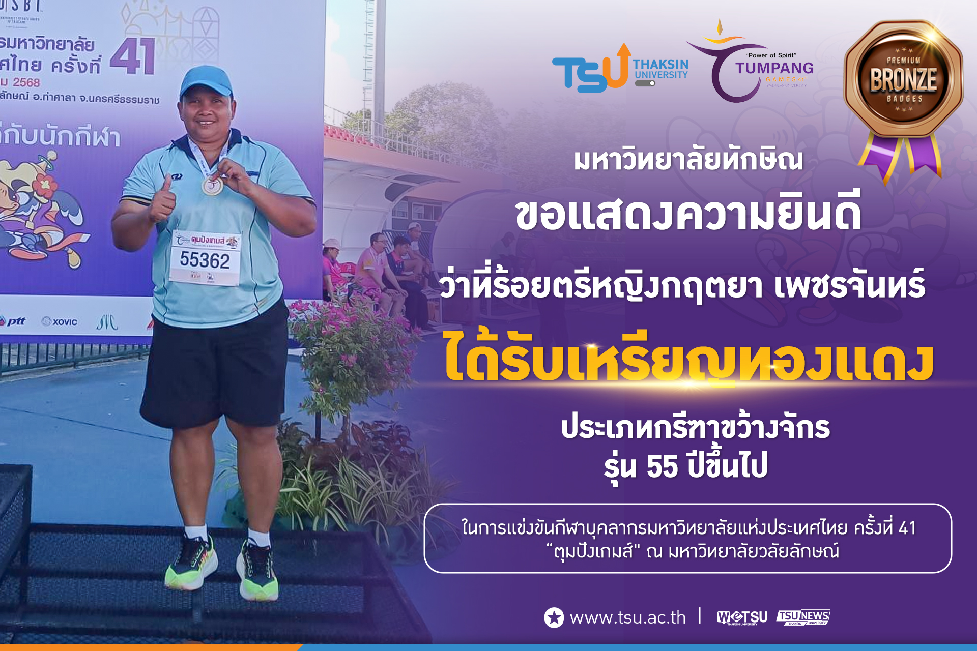 มหาวิทยาลัยทักษิณขอแสดงความยินดีกับนักกีฬาที่ได้รับเหรียญรางวัลจากการแข่งขันกีฬาบุคลากรมหาวิทยาลัยแห่งประเทศไทย ครั้งที่ 41 “ตุมปังเกมส์"  ณ มหาวิทยาลัยวลัยลักษณ์