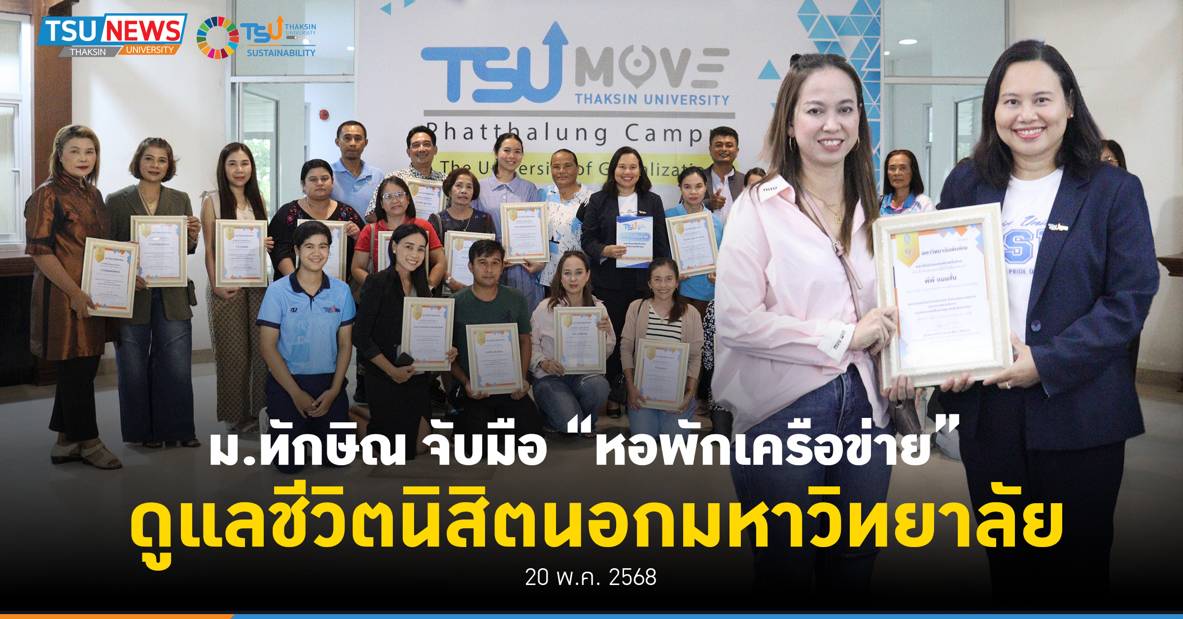 มหาวิทยาลัยทักษิณจับมือผู้ประกอบการสร้างเครือข่ายหอพัก ร่วมกันพัฒนาระบบดูแลนิสิตที่พักอาศัยนอกพื้นที่มหาวิทยาลัยแบบรอบด้านให้มีคุณภาพชีวิตความเป็นอยู่ที่ดี ปลอดภัย สร้างความมั่นใจให้กับผู้ปกครองเพื่อรองรับนิสิตที่มีจำนวนเพิ่มขึ้น