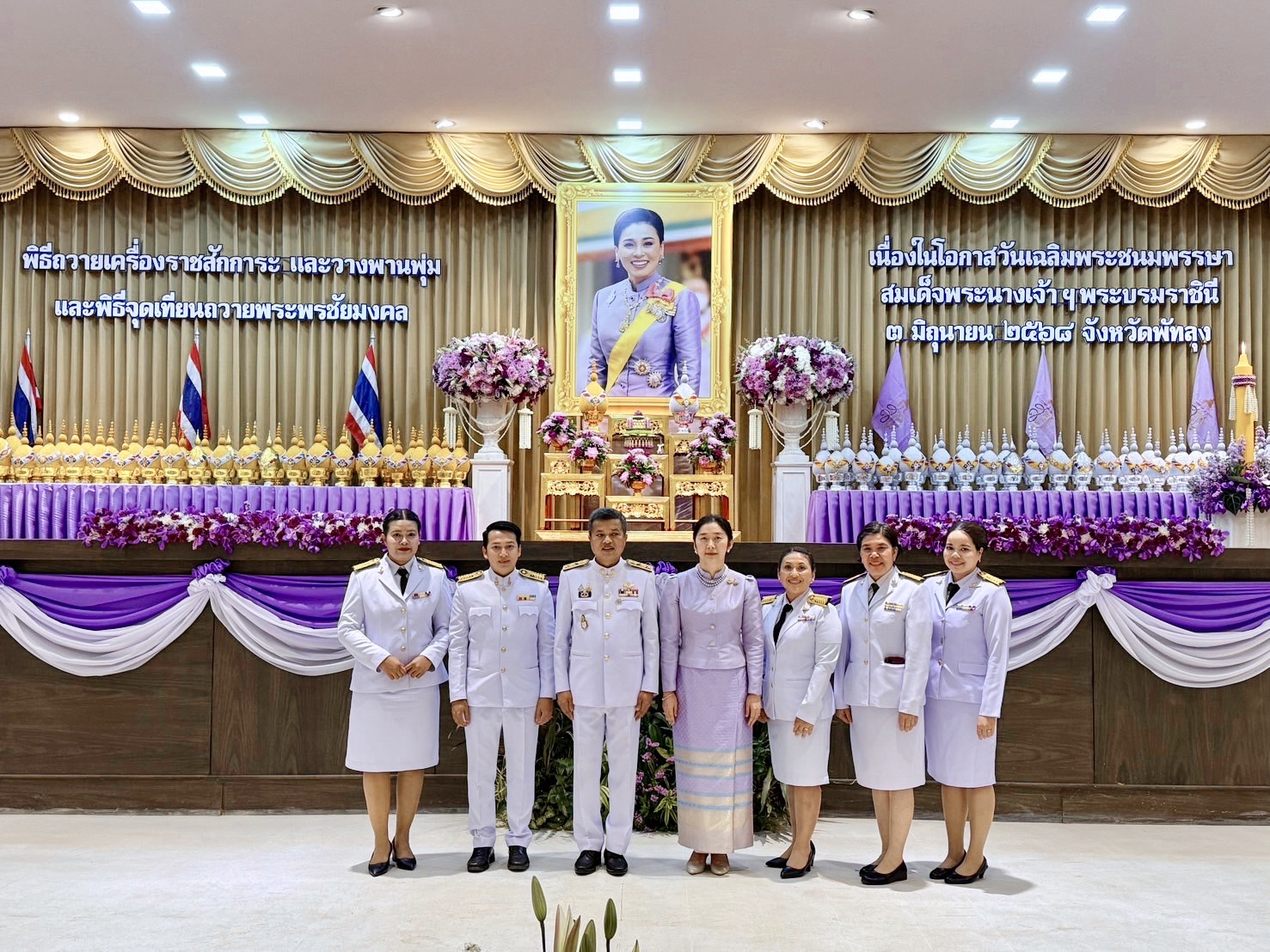 จังหวัดสงขลา และจังหวัดพัทลุง จัดพิธีถวายเครื่องราชสักการะ และจุดเทียนถวายพระพรชัยมงคล เนื่องในโอกาสวันเฉลิมพระชนมพรรษา สมเด็จพระนางเจ้าฯ พระบรมราชินี เมื่อวันที่ 3 มิถุนายน 2568 ในโอกาสนี้ผู้แทน มหาวิทยาลัยทักษิณ วิทยาเขตสงขลา นำโดย ผู้ช่วยศาสตราจารย์ ดร.เสริมศักดิ์ ขุนพล ผู้ช่วยคณบดีฝ่ายวิจัยและบริการวิชาการ คณะมนุษยศาสตร์และสังคมศาสตร์ และ มหาวิทยาลัยทักษิณ วิทยาเขตพัทลุง นำโดยอาจารย์ปุญณพัฒน์ ชำนาญเพาะ อาจารย์ประจำกลุ่มวิชาการพยาบาลผู้ใหญ่และผู้สูงอายุ คณะพยาบาลศาสตร์ พร้อมบุคลากร เข้าร่วมกิจกรรมเฉลิมพระเกียรติฯ พิธีถวายเครื่องราชสักการะและวางพานพุ่ม และพิธีจุดเทียนถวายพระพรชัยมงคล ในเวลา 17.30 น. และเวลา 19.19 น. ตามลำดับ