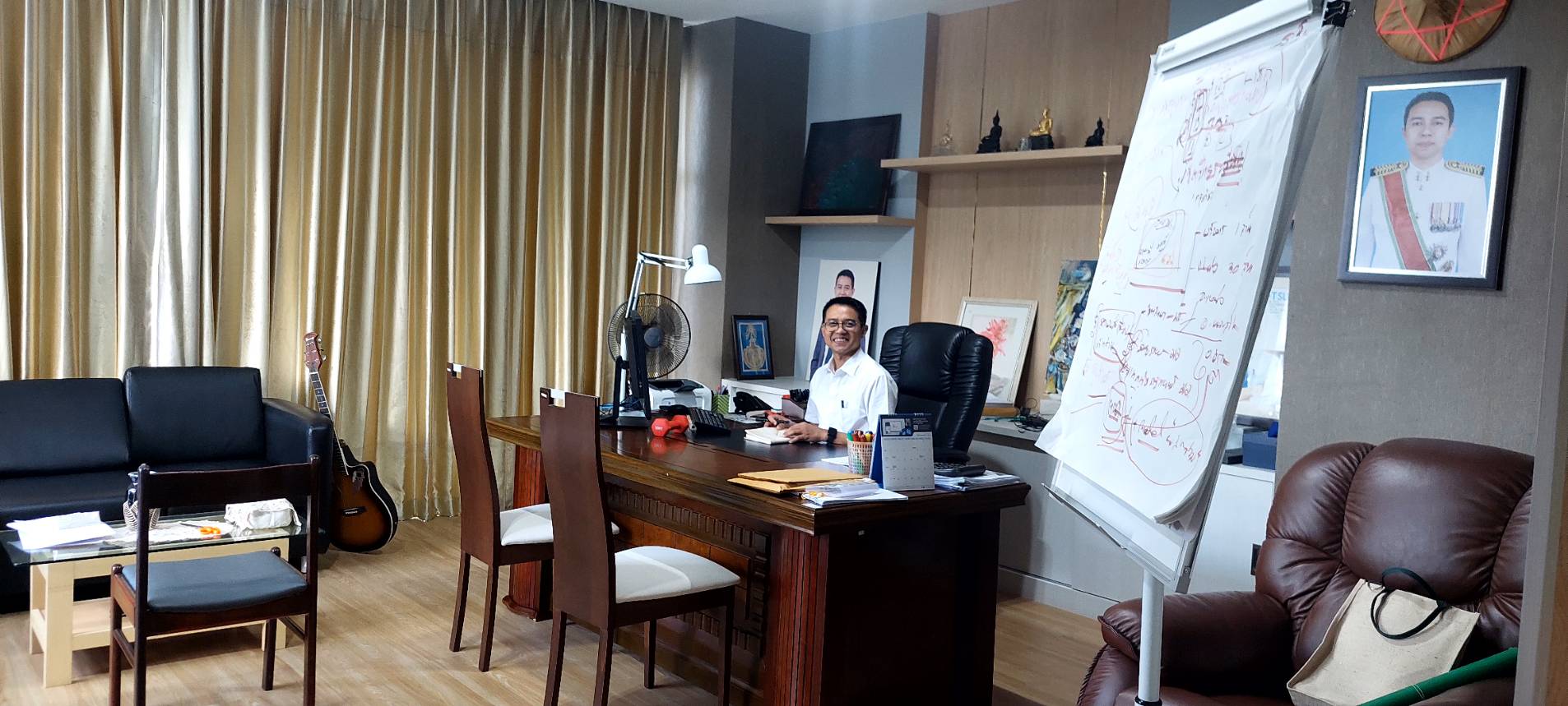 ข้าพเจ้าสังเกตได้ เขามองไปบนโต๊ะทำงานที่เต็มไปด้วยแฟ้มซีดจางรอการลงนาม กองเอกสารรออ่าน ข้างๆ กีตาร์โปร่งหลังเต่าสายสนิมเขรอะ ที่วางพิงไว้ใกล้ๆ บอนไซ และต้นไม้เรียงรายริมหน้าต่างอีก 3-4 ต้น แล้วหยุดที่กระดานฟลิปชาร์ท แบบล้อเลื่อนที่ถูกขีดเขียน โยงใยไปมาหลากสีสันในความสัมพันธ์
