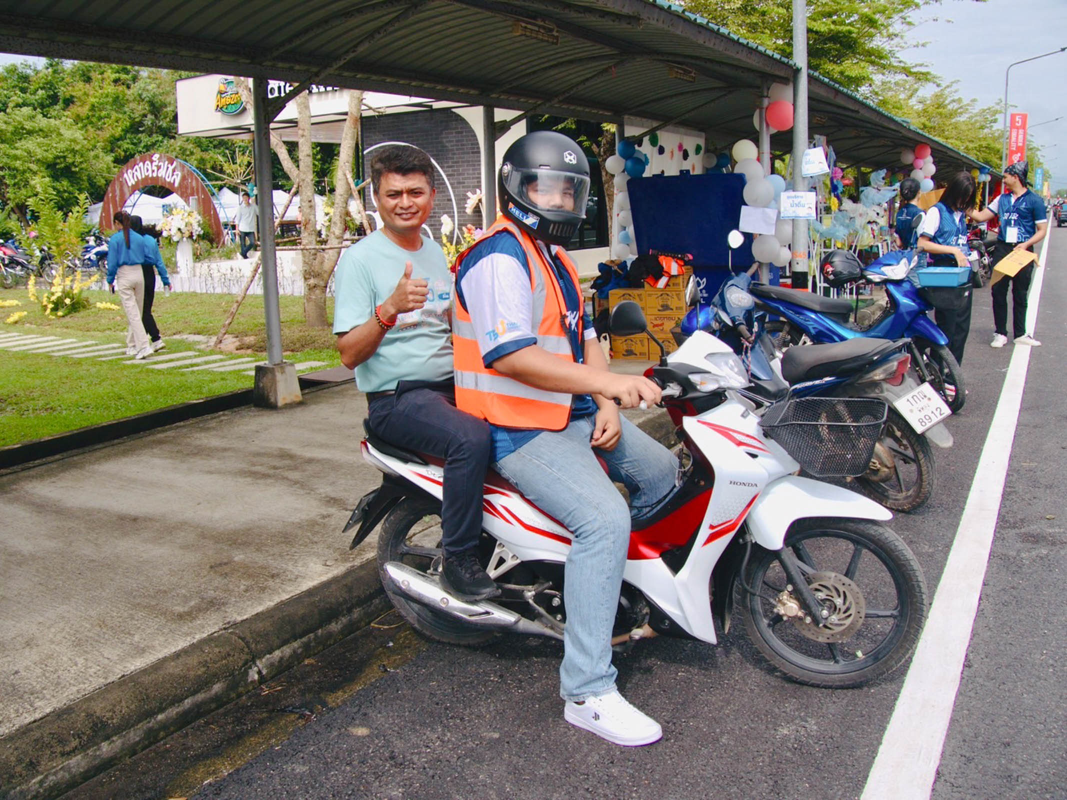 และแล้ว…ก็ปรากฏร่างของหนุ่มวินมอเตอร์ไซค์ในเสื้อสีส้มแปร๊ด พร้อมคำถามสุดคลาสสิก... “ให้พี่ไปส่งไหมน้อง?” เขาคือ วุฒติชัย จันทร์แก้ว (นิ) นิสิตปี 2 คณะนิติศาสตร์ ผู้ที่อาสานำรถมอเตอร์ไซค์ส่วนตัวมาวิ่งรับ-ส่งฟรีแก่ทุกคนในงาน ผ่านโครงการน่ารักน่าเอ็นดูที่ชื่อว่า “องค์การ พัทลุง แง๊นๆ”