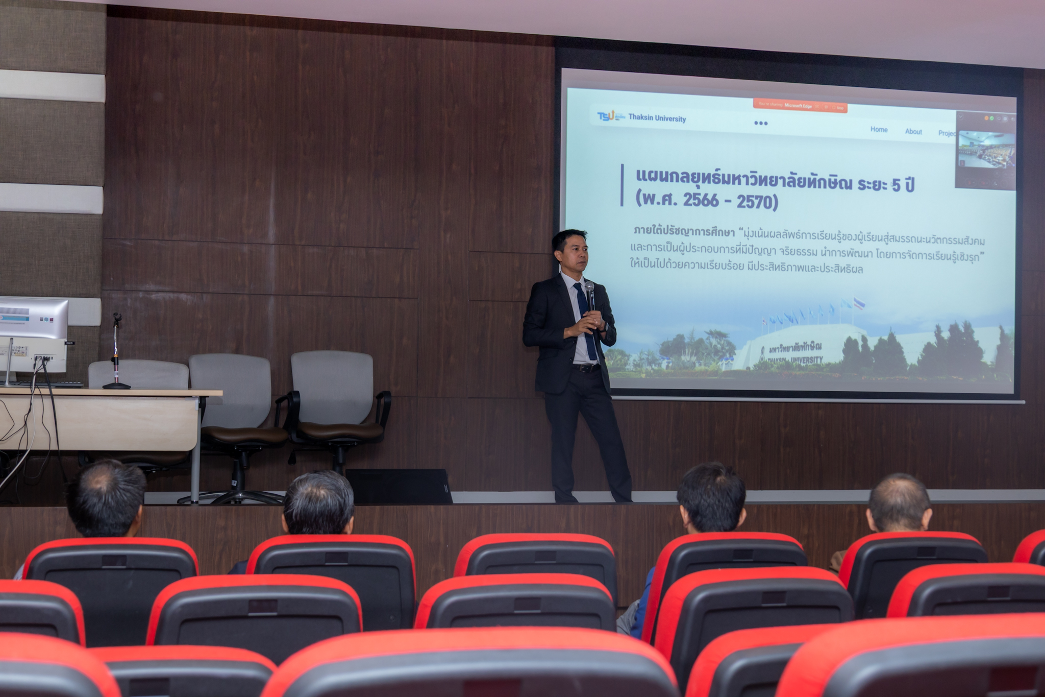 นอกจากนี้รองศาสตราจารย์ ดร.สุทธิพร บุญมาก รองอธิการบดีฝ่ายวิชาการและการเรียนรู้ ได้บรรยายและให้ข้อมูล เพื่อให้อาจารย์ที่ปรึกษาทางวิชาการได้เรียนรู้เข้าใจเกี่ยวกับการจัดการศึกษาเพื่อพัฒนากำลังคน ในการขับเคลื่อนการพัฒนาประเทศ และประกาศต่าง ๆ ที่เกี่ยวข้อง พร้อมทั้งเปิดโอกาสให้ผู้บริหารและอาจารย์ที่ปรึกษาทางวิชาการได้แลกเปลี่ยนความคิดเห็นและประสบการณ์ในงานที่เกี่ยวข้องกับการจัดการศึกษาและการให้คำแนะนำแก่นิสิต ผ่านการจัดกิจกรรมต่าง ๆ การประชุมในครั้งนี้จัดขึ้น ณ ห้องประชุมแสงสุริยา คณะศึกษาศาสตร์ มหาวิทยาลัยทักษิณ วิทยาเขตสงขลา และห้อง MF 1200 อาคารเรียนรวม 1 มหาวิทยาลัยทักษิณ วิทยาเขตพัทลุง