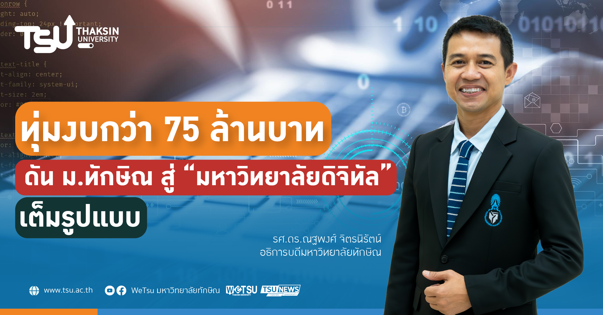 มหาวิทยาลัยทักษิณทุ่มงบกว่า 75 ล้านบาท พัฒนาโครงสร้างพื้นฐานดิจิทัล พร้อมก้าวสู่ “มหาวิทยาลัยดิจิทัล”เต็มรูปแบบ เพิ่มประสิทธิภาพระบบสารสนเทศ รองรับการใช้งานของนิสิต และบุคลากร สามารถเรียนรู้ได้ทุกที่ทุกเวลา ครอบคลุมทั้งสองวิทยาเขต เสริมการบริหารจัดการ การเรียนการสอน การวิจัย และบริการชุมชนโดยใช้เทคโนโลยีดิจิทัลเป็นกลไก ทันต่อการเปลี่ยนแปลงของโลก หวังเป็นแหล่งผลิตบัณฑิตและองค์ความรู้ตอบโจทย์สังคม สร้างระบบการศึกษาแห่งอนาคต เปิดโอกาสให้ทุกคนสามารถเข้าถึงความรู้ได้อย่างเท่าเทียมและทั่วถึง