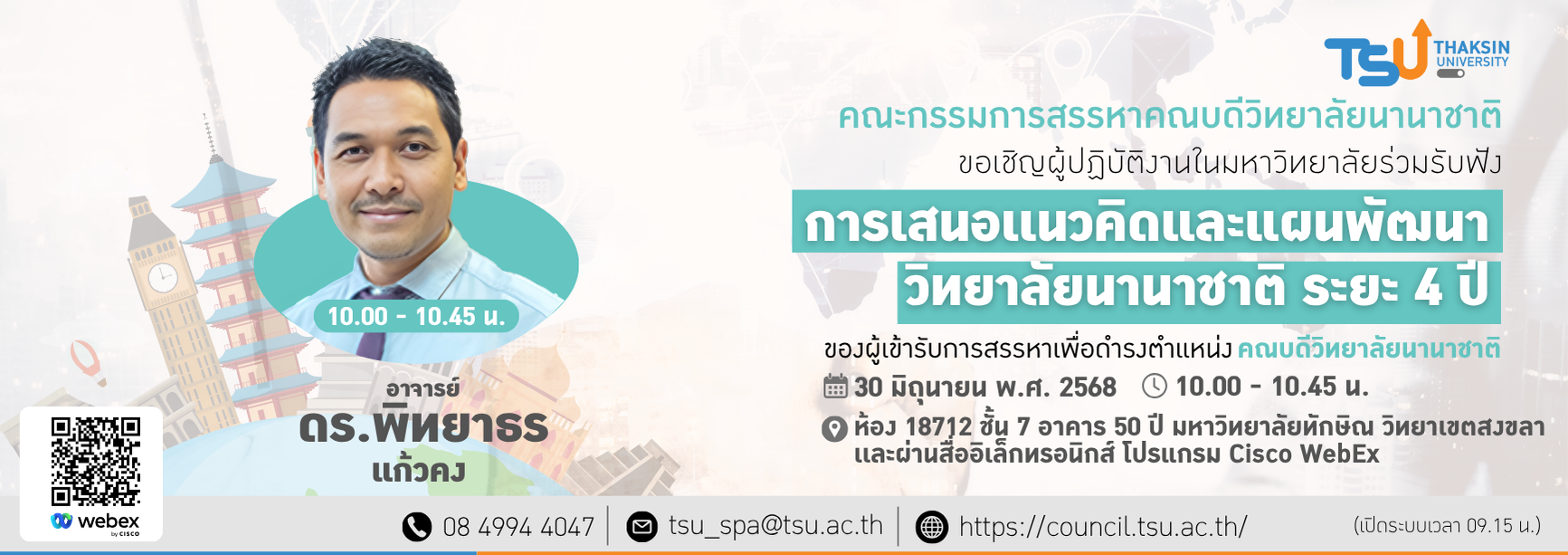 ณ ห้องประชุม 18712 ชั้น 7 อาคาร 50 ปี มหาวิทยาลัยทักษิณ วิทยาเขตสงขลา เเละผ่านโปรแกรมอิเล็กทรอนิกส์ Cisco WebEx