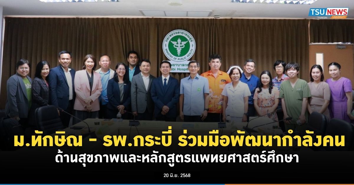 มหาวิทยาลัยทักษิณหารือกับโรงพยาบาลกระบี่ เพื่อร่วมมือการเป็นสถาบันร่วมผลิตหลักสูตรแพทยศาสตร์ศึกษา และโรงพยาบาลหลัก (Teaching Hospital) สำหรับฝึกปฏิบัติงานคลินิกและชุมชนของนิสิตแพทย์ในอนาคต ความร่วมมือนี้สอดคล้องกับการจัดตั้ง “คณะแพทยศาสตร์” และ “ศูนย์การแพทย์แบบองค์รวม” ของมหาวิทยาลัยทักษิณ