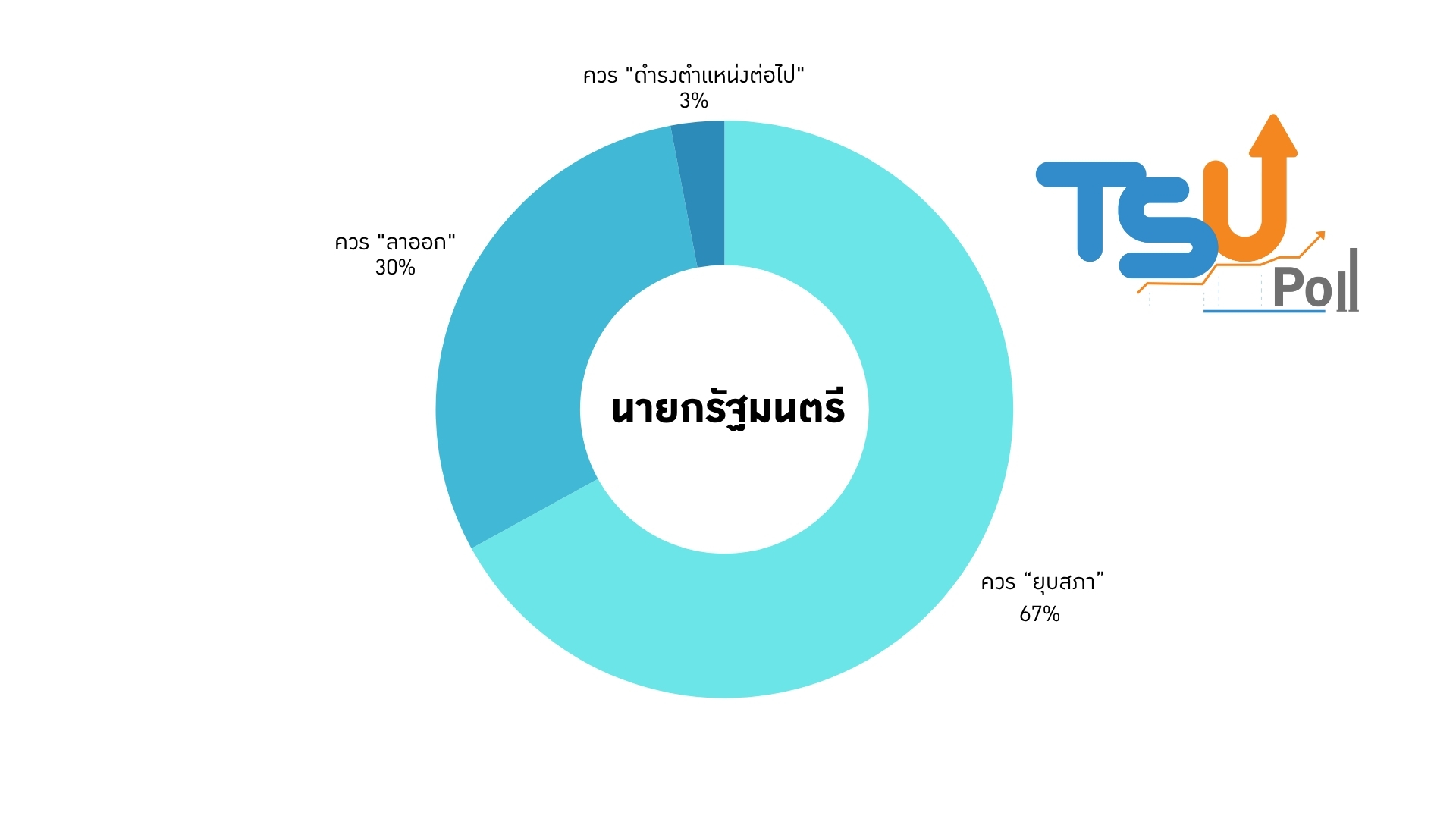 ทีเอสยูโพล มหาวิทยาลัยทักษิณ เผยผลสำรวจประชาชนจำนวน 411 คน ส่วนใหญ่กว่า 67% ของกลุ่มตัวอย่าง เห็นว่าควร “ยุบสภา” เพื่อคืนอำนาจให้ประชาชนสู่การเลือกตั้งใหม่ 30% เห็นว่านายกรัฐมนตรีควรลาออก และให้สภาผู้แทนราษฎรเลือกนายกฯ คนใหม่ และมีเพียง 3% ที่ยังสนับสนุนให้นายกรัฐมนตรีคนปัจจุบันดำรงตำแหน่งต่อไป