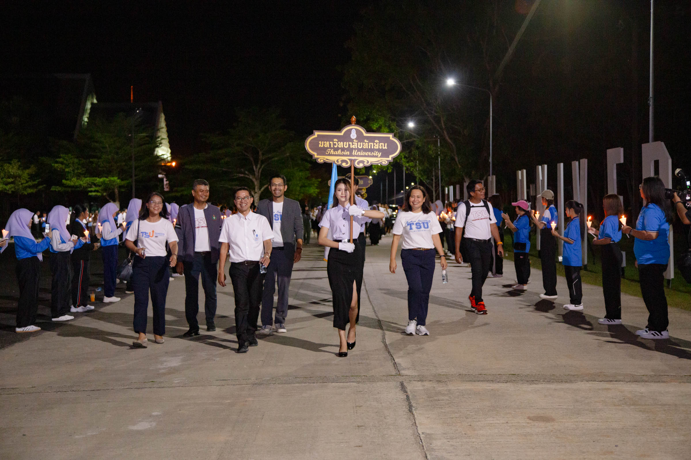 เสียงเพลงมาร์ชมหาวิทยาลัยดังกึกก้องไปทั่วลานกิจกรรม ก่อนเข้าสู่กิจกรรม "บูมนิสิตมหาวิทยาลัยทักษิณ" ที่เปี่ยมไปด้วยพลัง ความสมัครสมานสามัคคี และความรู้สึกเป็นหนึ่งเดียวของทุกคนในรั้วมหาวิทยาลัย จากนั้นนิสิตได้ร่วมกิจกรรม "พี่ส่งน้อง" โดยร้องเพลงประจำสถาบันร่วมกันอย่างซาบซึ้ง ก่อนเดินขบวนไปยังถนนทางเข้าคณะวิศวกรรมศาสตร์ ซึ่งนำโดย รองศาสตราจารย์ ดร.ณฐพงศ์ จิตรนิรัตน์ อธิการบดีมหาวิทยาลัยทักษิณ พร้อมด้วยคณะผู้บริหาร บรรยากาศสองข้างทางมีแสงเทียนน้อยจากพี่ๆคอยส่องทางให้รุ่นน้องจนถึงจุดหมาย