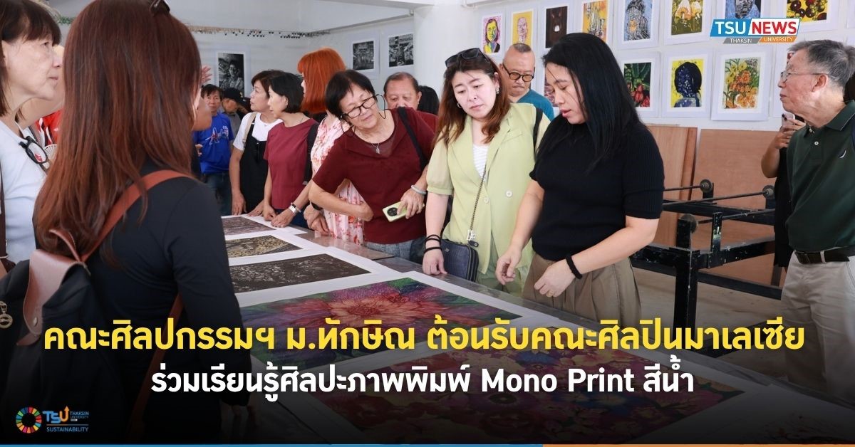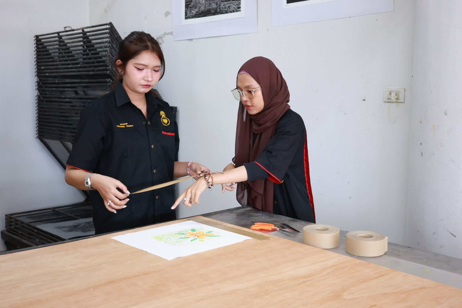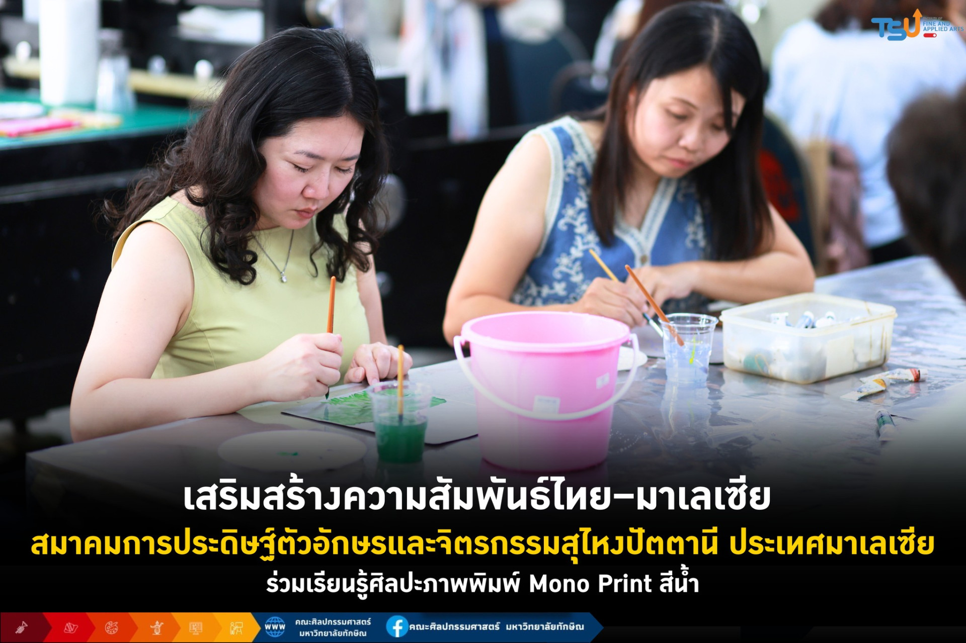 คณะศิลปกรรมศาสตร์ให้การต้อนรับสมาคมการประดิษฐ์ตัวอักษรและจิตรกรรมสุไหงปัตตานี ประเทศมาเลเซีย ร่วมเรียนรู้ศิลปะภาพพิมพ์ Mono Print สีน้ำ เสริมสร้างความสัมพันธ์ไทย–มาเลเซีย