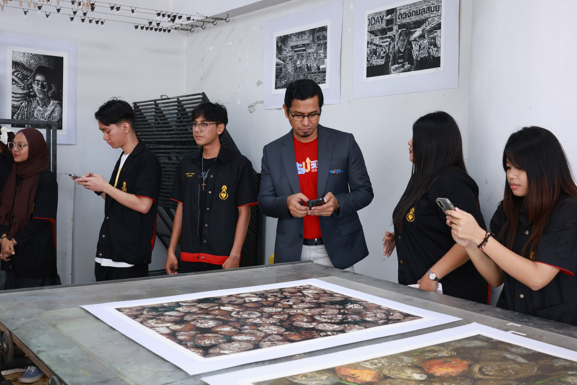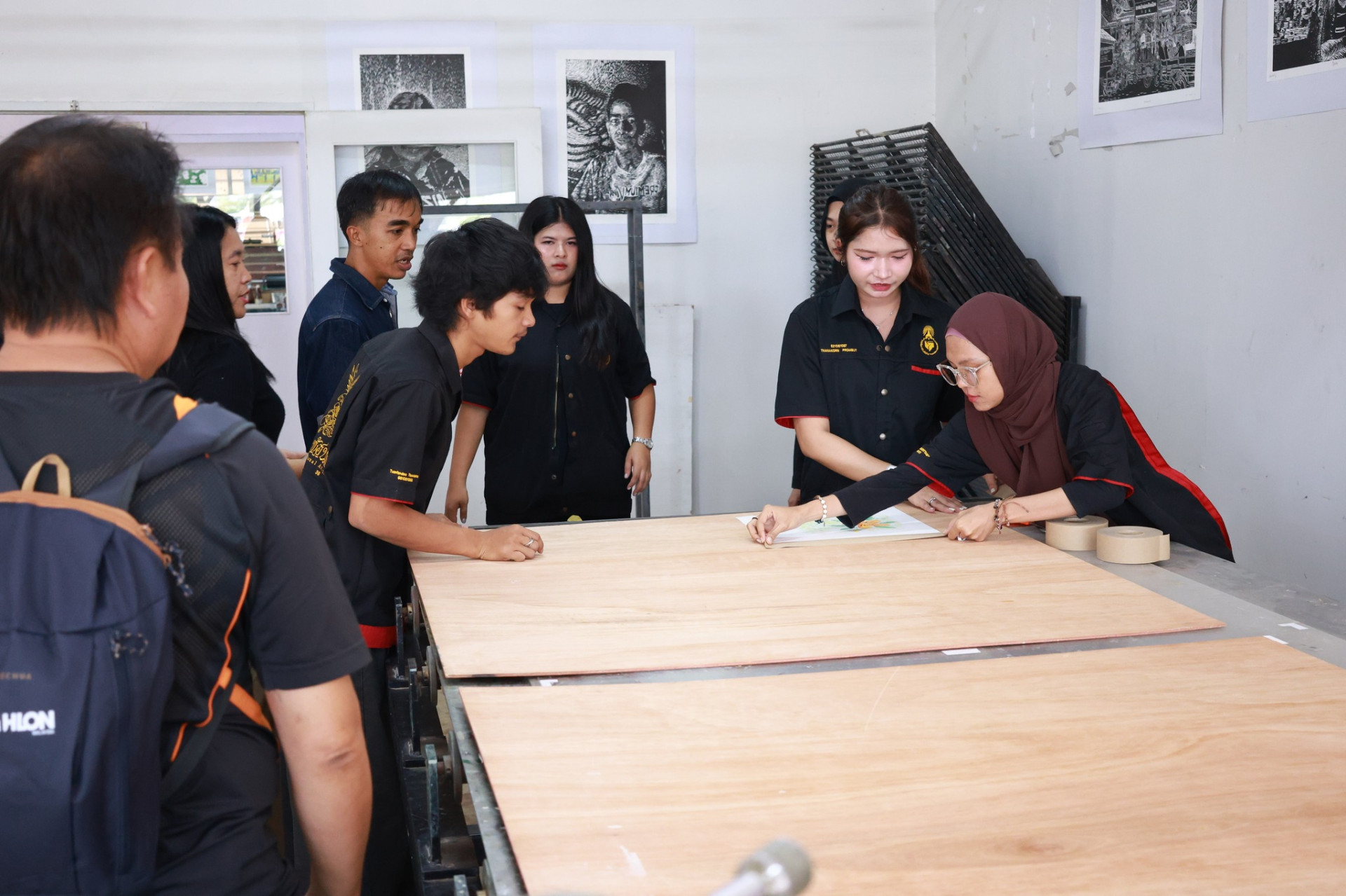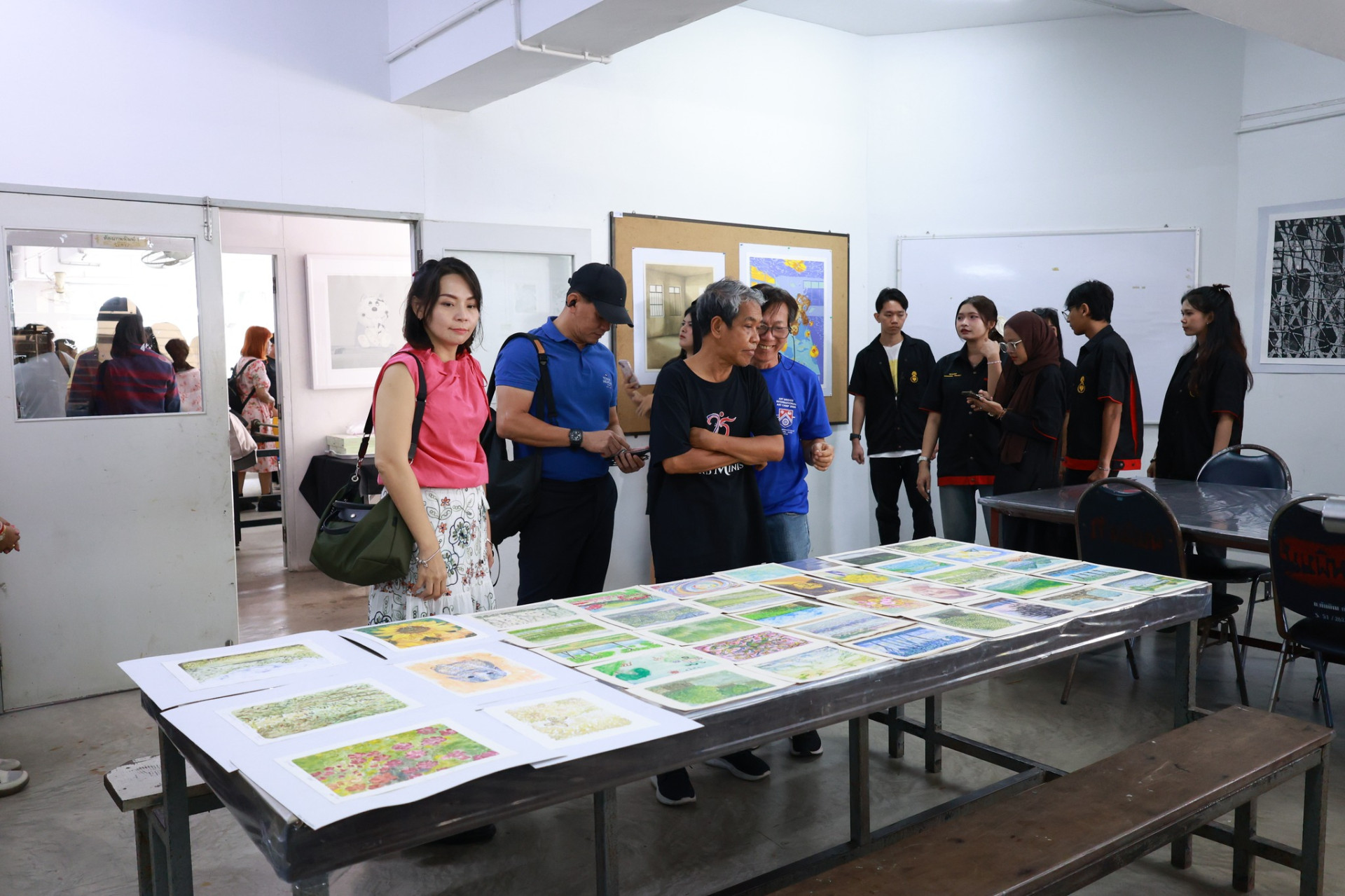ในโอกาสนี้สมาคมการประดิษฐ์ตัวอักษรและจิตรกรรมสุไหงปัตตานี ประเทศมาเลเซีย ได้เดินทางเข้าเยี่ยมชมคณะศิลปกรรมศาสตร์ และสตูดิโอภาพพิมพ์ของหลักสูตร ศป.บ.ทัศนศิลป์ ภายใต้กิจกรรม “สีสันแห่งมิตรภาพ : นิทรรศการไทย-มาเลเซีย 2025” เพื่อแลกเปลี่ยนประสบการณ์และชมผลงานของนิสิตในแขนงศิลปะภาพพิมพ์