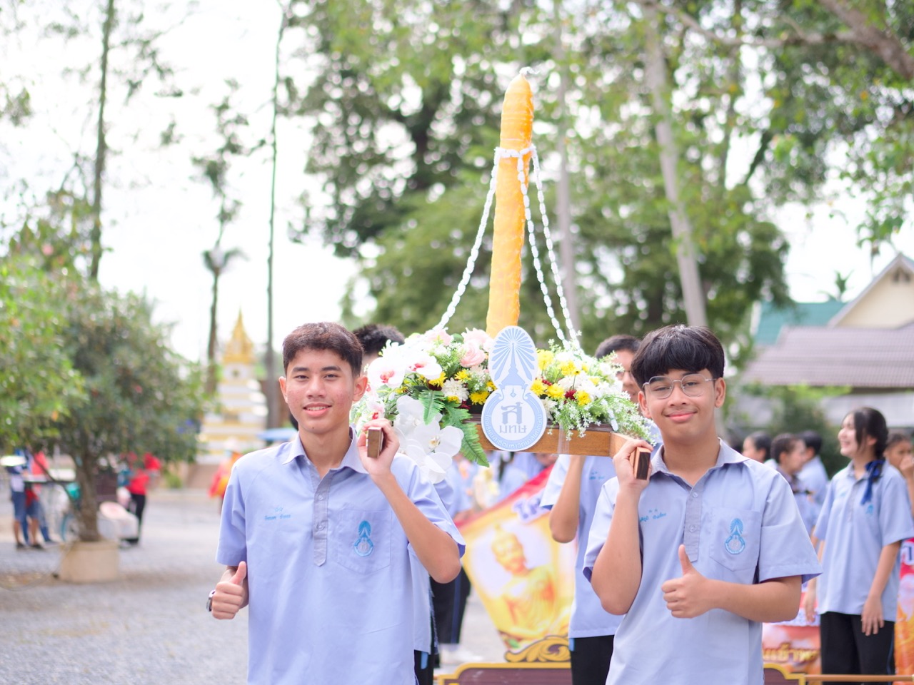 และในวันนี้ (9 กรกฎาคม 2568) ซึ่งเป็นวันสุดท้ายของโครงการ คณะผู้บริหาร นำโดย ผู้ช่วยศาสตราจารย์ ดร.สุนิสา คงประสิทธิ์ ผู้อำนวยการโรงเรียนฯ และ อาจารย์ ดร.ภรพนา บัวเพชร์ รองผู้อำนวยการฝ่ายวิชาการ คุณครู บุคลากร และนักเรียนระดับชั้นมัธยมศึกษาปีที่ 2 ได้ร่วมแรงร่วมใจจัดขบวนแห่เทียนพรรษาอย่างงดงาม นำเทียนพรรษา ผ้าไตรจีวร หลอดไฟ และปัจจัย ไปถวายแด่พระสงฆ์ ณ วัดป่าพะยอม อำเภอป่าพะยอม จังหวัดพัทลุง