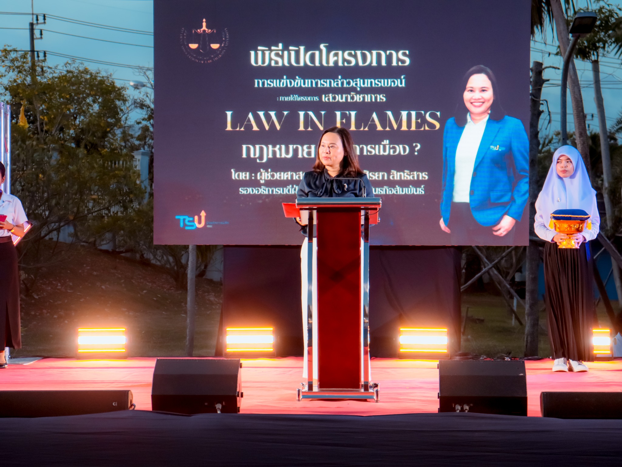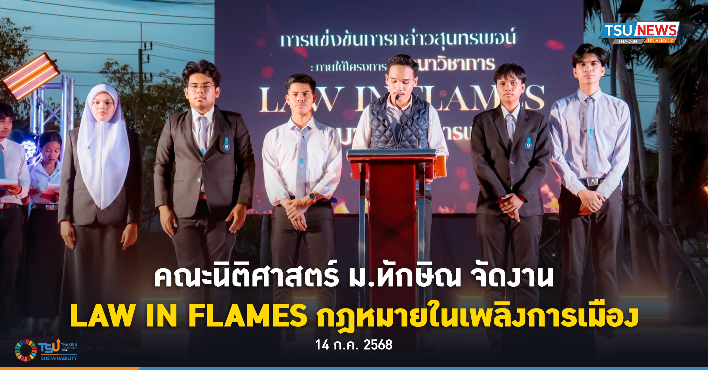 เมื่อวันที่ 14 กรกฎาคม 2568 สโมสรนิสิตคณะนิติศาสตร์ มหาวิทยาลัยทักษิณ วิทยาเขตสงขลา จัดโครงการ LAW IN FLAMES กฎหมายในเพลิงการเมือง ณ ลานแอโรบิค มหาวิทยาลัยทักษิณ วิทยาเขตสงขลา โดยมีผู้ช่วยศาสตราจารย์ ดร.สิรยา สิทธิสาร รองอธิการบดีฝ่ายกิจการนิสิตและพันธกิจสัมพันธ์ เป็นประธานเปิดงาน กิจกรรมภายในงาน มีการออกร้านจำหน่ายผลิตภัณฑ์ และกิจกรรมบนเวทีกลาง มีการแข่งขันกล่าวสุนทรพจน์ ซึ่งได้รับเกียรติจาก รองศาสตราจารย์ ดร.ณฐพงศ์ จิตรนิรัตน์ อธิการบดีมหาวิทยาลัยทักษิณ พร้อมด้วยคณะผู้บริหาร บุคลากรและนิสิตเข้าร่วมรับฟังการ