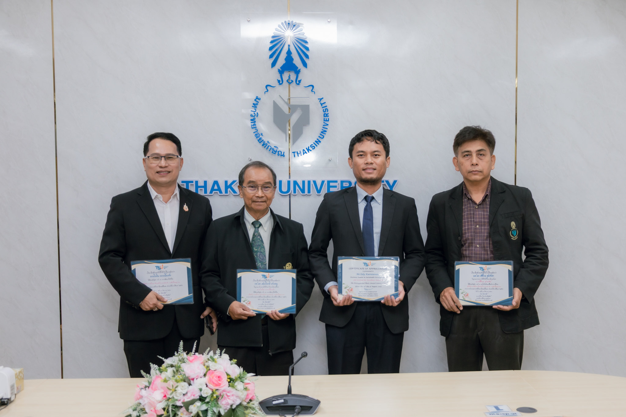 บัณฑิตวิทยาลัย มหาวิทยาลัยทักษิณ จัดพิธีมอบรางวัลวิทยานิพนธ์ดีเด่น ประจำปีการศึกษา 2566 เพื่อเชิดชูเกียรติผลงานวิชาการคุณภาพของนิสิตระดับบัณฑิตศึกษา และสนับสนุนให้เกิดการวิจัยที่สร้างคุณค่าแก่สังคม โดยพิธีจัดขึ้นเมื่อวันที่ 13 สิงหาคม 2568 ณ ห้องประชุม 18310 ชั้น 3 อาคาร 50 ปี มหาวิทยาลัยทักษิณ วิทยาเขตสงขลา และผ่านระบบออนไลน์ Cisco Webex Meeting โดยมีอาจารย์วีณา ลีลาประเสริฐศิลป์ รักษาการแทน คณบดีบัณฑิตวิทยาลัย เป็นประธานในพิธี พร้อมมอบเกียรติบัตรให้แก่นิสิตและอาจารย์ที่ปรึกษาผู้ได้รับรางวัลในแต่ละสาขา