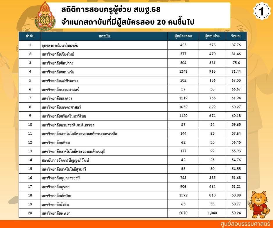 โดยสถิติจากการสอบครูผู้ช่วย สพฐ. ปี พ.ศ. 2568 จากแหล่งข้อมูลของศูนย์สอบมหาวิทยาลัยธรรมศาสตร์ พิจารณาเฉพาะสถาบันที่มีผู้สมัครสอบเกิน 20 คนขึ้นไป เปิดเผยว่า มหาวิทยาลัยทักษิณมีผู้สมัครสอบทั้งสิ้น 1,592 คน และมีผู้สอบผ่านจำนวน 810 คน คิดเป็นร้อยละ 50.88 ของผู้เข้าสอบทั้งหมด ถือเป็นอัตราสำเร็จสูงสุดในภาคใต้