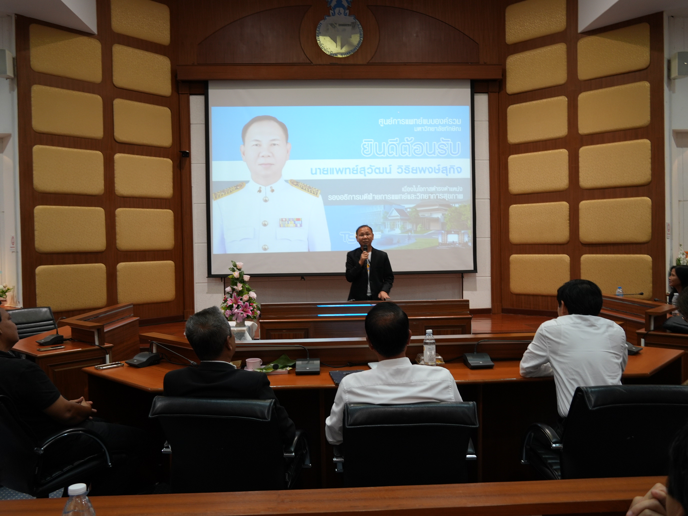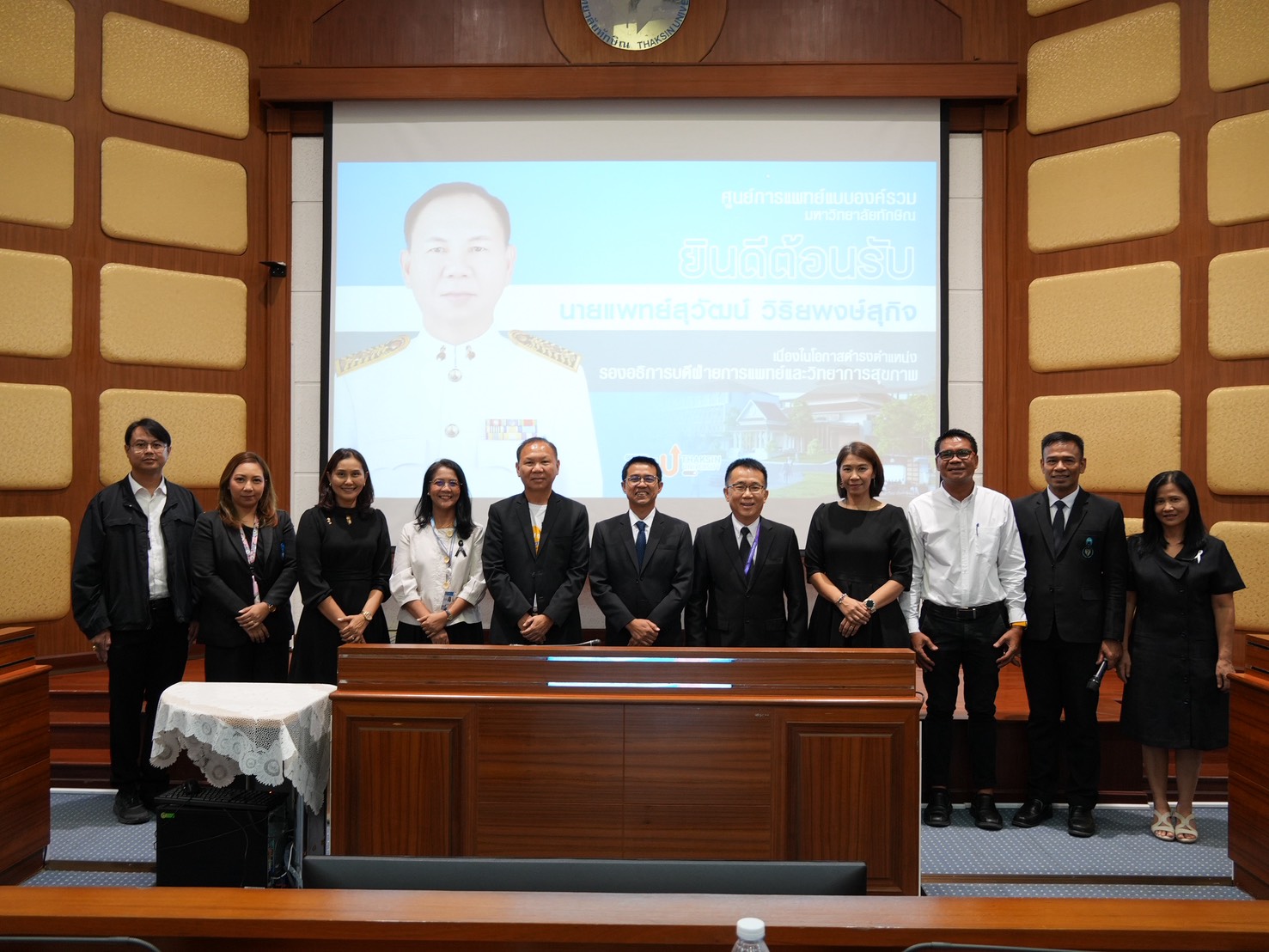 ในการนี้ รองศาสตราจารย์ ดร.ณฐพงศ์ จิตรนิรัตน์ อธิการบดีมหาวิทยาลัยทักษิณ ให้เกียรติกล่าวต้อนรับและร่วมแสดงความยินดีกับนายแพทย์สุวัฒน์ พร้อมทั้งได้กล่าวถึงทิศทางการดำเนินงานด้านการแพทย์และวิทยาการสุขภาพของมหาวิทยาลัย ซึ่งมุ่งเน้นการบูรณาการองค์ความรู้ทางการแพทย์ การพัฒนาศักยภาพบุคลากรทางสุขภาพ และการสร้างเครือข่ายความร่วมมือกับหน่วยบริการทางการแพทย์ในพื้นที่ภาคใต้ เพื่อยกระดับคุณภาพชีวิตของประชาชนอย่างยั่งยืน