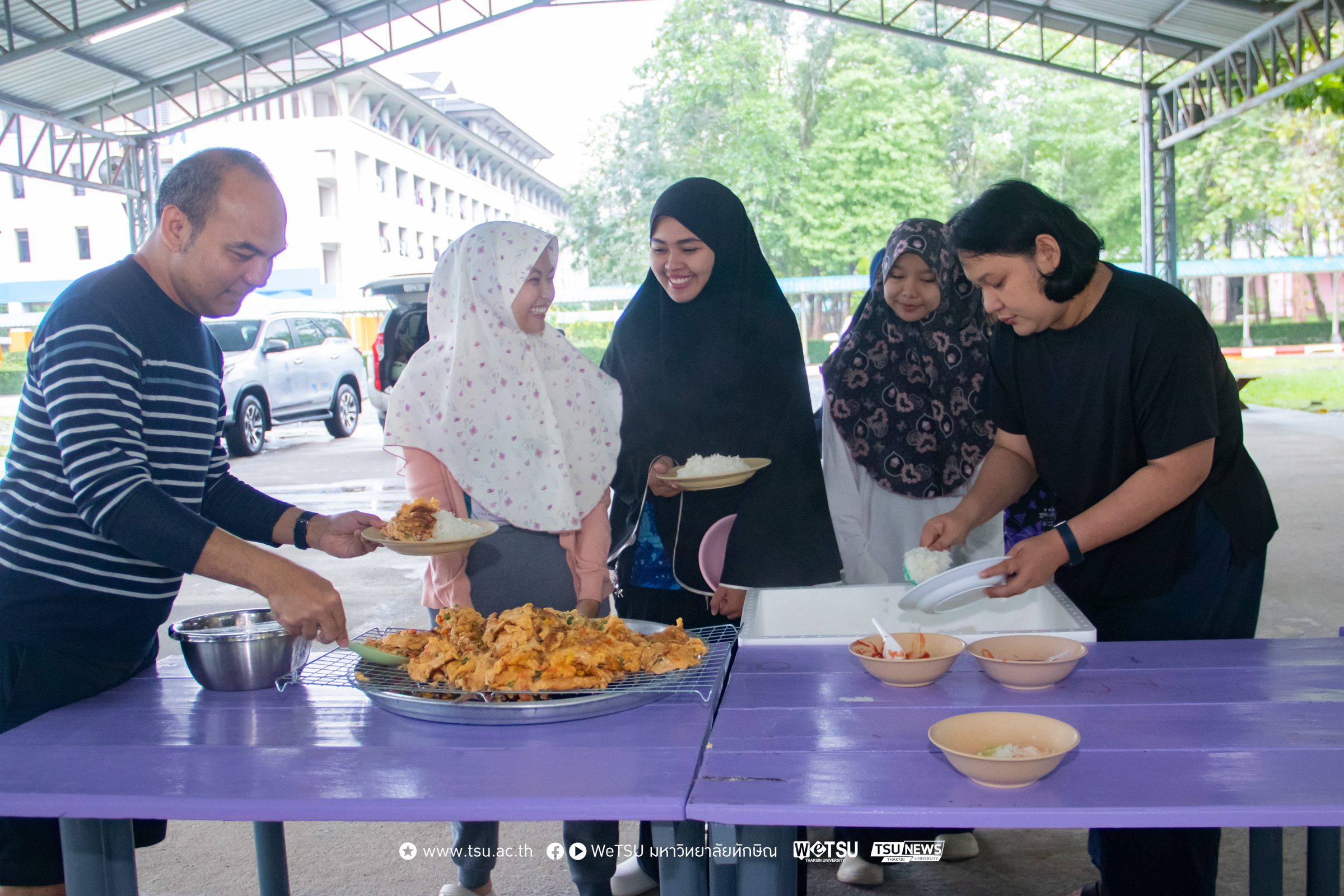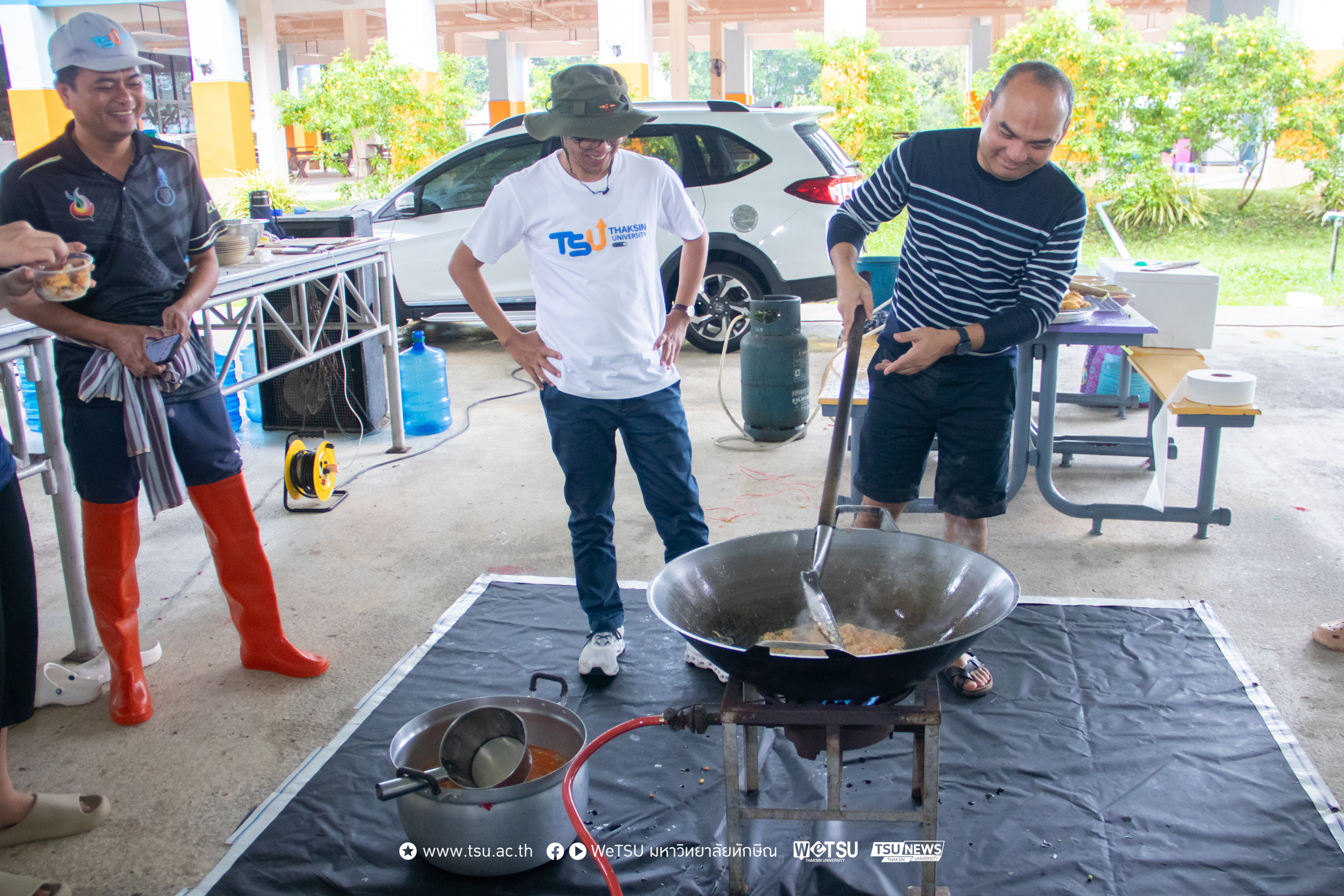 ทางด้านของวิทยาเขตพัทลุง สำหรับมื้อกลางวันยังพิเศษยิ่งขึ้น เมื่อรองศาสตราจารย์ ดร.ณฐพงศ์ จิตรนิรัตน์ อธิการบดีมหาวิทยาลัยทักษิณ ลงมือปรุงอาหารด้วยตนเองเคียงข้างรองศาสตราจารย์ ดร.สมัคร แก้วสุกแสง รองอธิการบดีฝ่ายวิจัยและนวัตกรรม พร้อมด้วยบุคลากรและนิสิตจิตอาสา ที่ร่วมแรงร่วมใจกันสร้างมื้ออุ่นใจให้กับน้อง ๆ นิสิตท่ามกลางสายฝนที่โปรยปรายตลอดทั้งวัน กับเมนูข้าวไข่เจียว มาม่าต้ม–ผัด ต่อด้วยเมนูมื้อเย็นอย่างหมี่ผัดซีอิ๊ว พร้อมไข่ไก่อารมณ์ดีต้มสุกกว่า 1,700 ฟอง จากฟาร์ม “ชัยบุรีโมเดล ไข่ไก่อารมณ์ดี–แฮปปี้ฟาร์ม” ภายใต้โครงการวิจัยและนวัตกรรมแก้ไขปัญหาความยากจนแบบเบ็ดเสร็จและแม่นยำ จังหวัดพัทลุง เพื่อให้ทุกคนอิ่มท้อง อุ่นใจ และไม่ต้องกังวลเรื่องค่าใช้จ่ายหรือการเดินทางออกไปซื้ออาหารในช่วงสภาพอากาศไม่เอื้ออำนวย