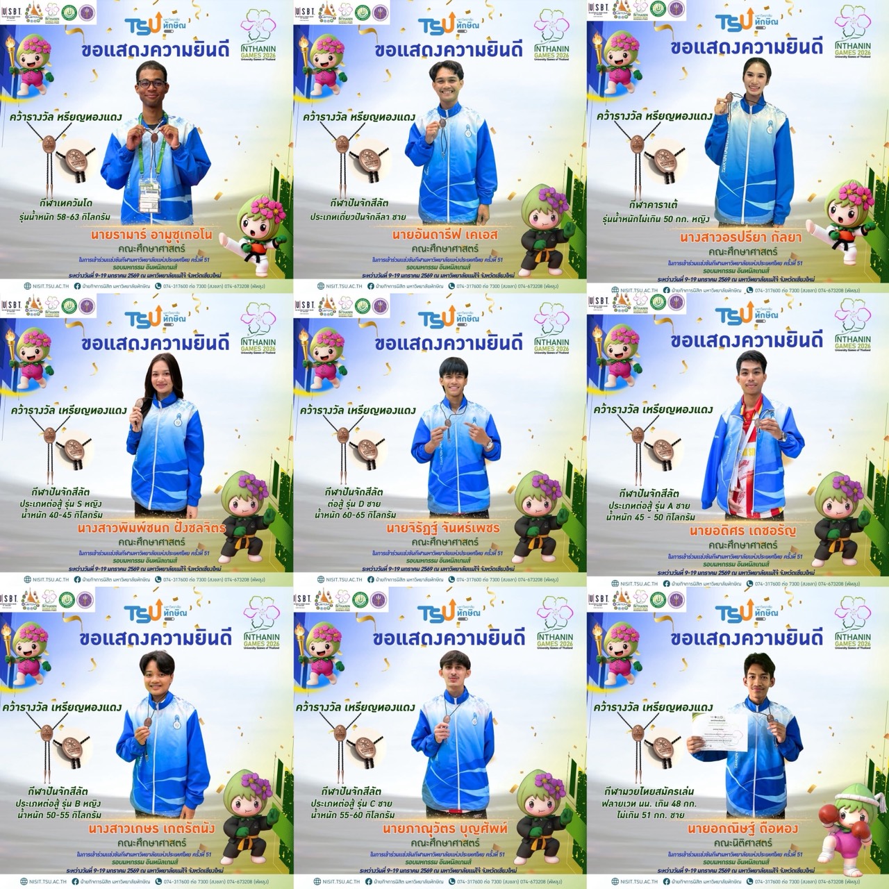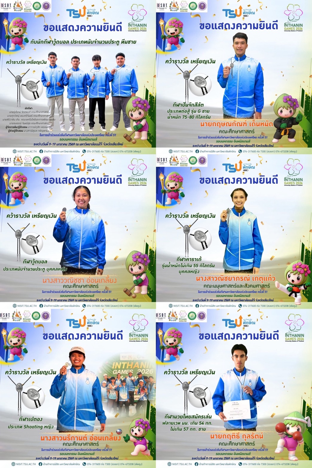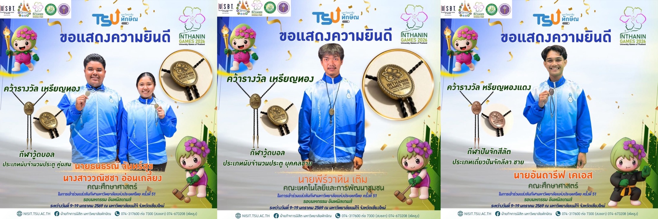 ทัพนักกีฬามหาวิทยาลัยทักษิณ สร้างผลงานน่าประทับใจในการแข่งขันกีฬามหาวิทยาลัยแห่งประเทศไทย ครั้งที่ 51 “อินทนนท์เกมส์ 2026” ณ มหาวิทยาลัยแม่โจ้ จังหวัดเชียงใหม่ โดยสามารถคว้าเหรียญรางวัลรวมทั้งสิ้น 18 เหรียญ ได้แก่ 3 เหรียญทอง 6 เหรียญเงิน และ 9 เหรียญทองแดง ท่ามกลางบรรยากาศการแข่งขันที่คึกคักและเต็มไปด้วยพลังจากสถาบันอุดมศึกษาทั่วประเทศ
