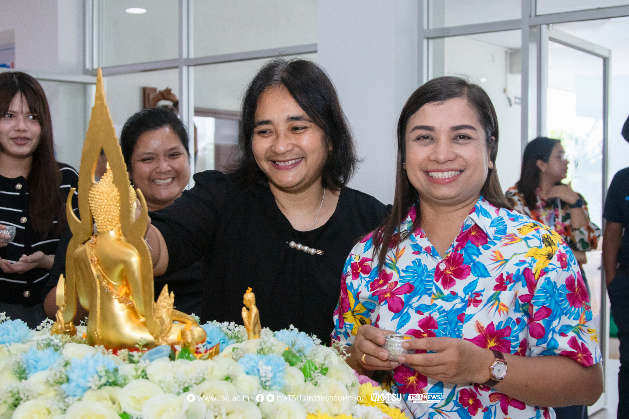 กลิ่นน้ำอบหอมห้วน ทั่วโถงกลางอาคารบริหารและสำนักงานกลาง มหาวิทยาลัยทักษิณ วิทยาเขตพัทลุง ในวันที่ 10 เมษายน 2569 ต้อนรับเทศกาลสงกรานต์ สำนักงานวิทยาเขต มหาวิทยาลัยทักษิณ จัดกิจกรรมรดน้ำดำหัว ขอพรผู้บริหาร มีบุคลากรจากทุกภาคส่วนเข้าร่วมกันอย่างพร้อมเพรียง โดยมีรองศาสตราจารย์ ดร.ณฐพงศ์ จิตรนิรัตน์ อธิการบดี พบปะและกล่าวชื่นชมในการทำงานของบุคลากรทุกฝ่ายตลอดช่วงเวลาที่ผ่าน พร้อมฝากแนวคิดในการทำงานว่า “ยิ้มสู้ อยู่เป็น เย็นพอ ไม่ท้อถอย” เพื่อเป็นแรงใจในการปฏิบัติงานต่อไป