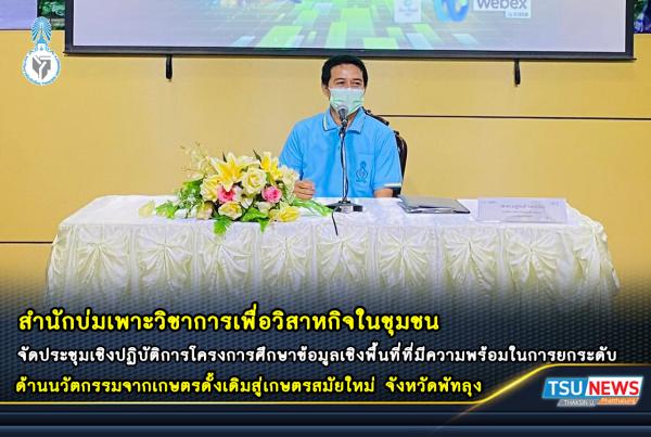วันเสาร์ ที่ 30 ตุลาคม 2564 สำนักบ่มเพาะวิชาการเพื่อวิสาหกิจในชุมชน มหาวิทยาลัยทักษิณ จัดประชุมเชิงปฏิบัติการโครงการศึกษาข้อมูลเชิงพื้นที่ที่มีความพร้อมในการยกระดับ ด้านนวัตกรรมจากเกษตรดั้งเดิมสู่เกษตรสมัยใหม่ จังหวัดพัทลุง เพื่อระดมความคิดเห็น วิเคราะห์ความต้องการและปัญหาที่เกิดขึ้น แนวทางการแก้ไขปัญหา รวมถึงการวิเคราะห์ห่วงโซ่คุณค่าจากภาคการเกษตรกรรมของจังหวัดพัทลุง ณ ห้องประชุมศิวา 1 โรงแรมศิวา รอยัล และ ผ่านระบบ Cisco Webex Meeting