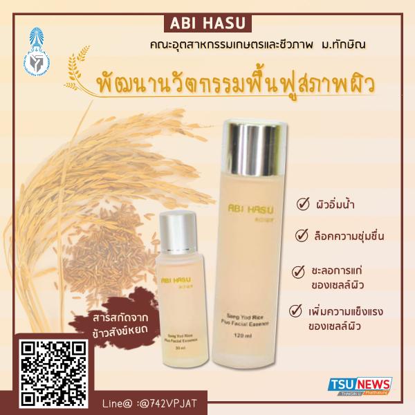 คณะอุตสาหกรรมเกษตรและชีวภาพ มหาวิทยาลัยทักษิณ ได้ดำเนินงานในรูปแบบธุรกิจเพื่อสังคม (Social Enterprise) โดยมีกิจกรรมมุ่งเน้นการแก้ไขปัญหาทางสังคมและสิ่งแวดล้อม รวมทั้งการสร้างรายได้ให้นิสิตปัจจุบันและศิษย์เก่าโดยใช้กลไกการบริหารจัดการที่ดีของภาคธุรกิจมาบวกกับความรู้และนวัตกรรมทางสังคม (Social innovation) เพื่อนำไปสู่การพัฒนาที่ยั่งยืน ผลิตภัณฑ์ “ABI HASU” (อาบิ ฮะซึ) เป็นผลิตภัณฑ์น้ำตบจากสารสกัดธรรมชาติ คือ สารสกัดจากข้าวสังข์หยดอินทรีย์ ที่เป็นอัตลักษณ์ของจังหวัดพัทลุง นำน้ำแร่เขาชัยสน และสารสำคัญอื่นๆ ที่ทรงประสิทธิที่ช่วยฟื้นฟูผิวอย่างล้ำลึก มีเซราไมด์ แกรมมาโอรีซานอลและวิตามิน E สูง บำรุงผิวให้ชุ่มชื้น สดใส ต้านอนุมูลอิสระและชะลอความเหี่ยวย่น เป็นผลิตภัณฑ์นำร่องของโครงการฯ ออกสู่ตลาด โดยมุ่งเน้นความเป็น “TSU Brand” เพื่อความ ภาคภูมิใจใน “TSU Society” สารสกัดจากข้าวสังข์หยดอินทรีย์ (Organic Sang Yod Rice extract) ผสานพลังสารสำคัญอันทรงประสิทธิภาพเพื่อดูแลผิวอย่างล้ำลึก ผ่านการวิจัยและพิสูจน์ผลลัพธ์ความพึงพอใจ โดยคณาจารย์ด้านเครื่องสำอาง