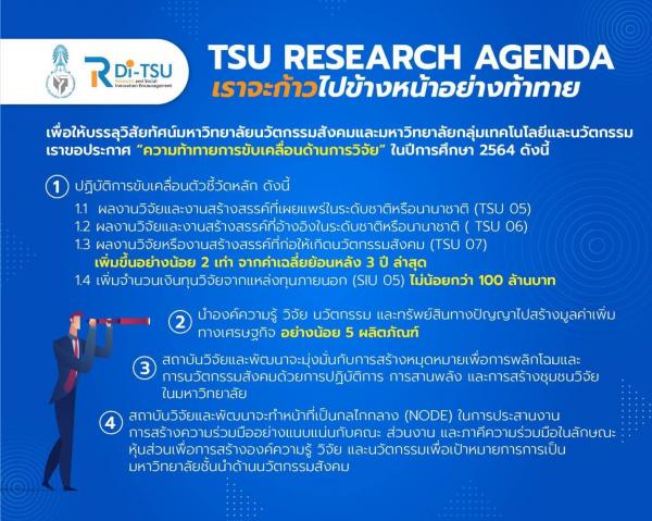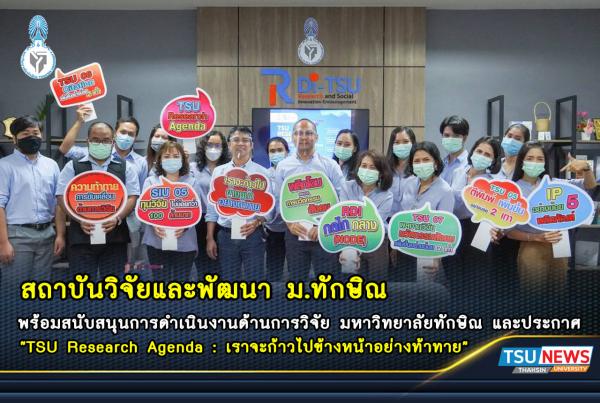 เมื่อวันที่ วันที่ 15 พฤศจิกายน 2564 สถาบันวิจัยและพัฒนา ม.ทักษิณ พร้อมสนับสนุนการดำเนินงานด้านการวิจัย มหาวิทยาลัยทักษิณ และประกาศ "TSU Research Agenda : เราจะก้าวไปข้างหน้าอย่างท้าทาย" เพื่อให้บรรลุวิสัยทัศน์มหาวิทยาลัยนวัตกรรมสังคม และมหาวิทยาลัยกลุ่มเทคโนโลยีและนวัตกรรม เราขอประกาศ “ความท้าทายการขับเคลื่อนด้านการวิจัย” ในปีการศึกษา 2564