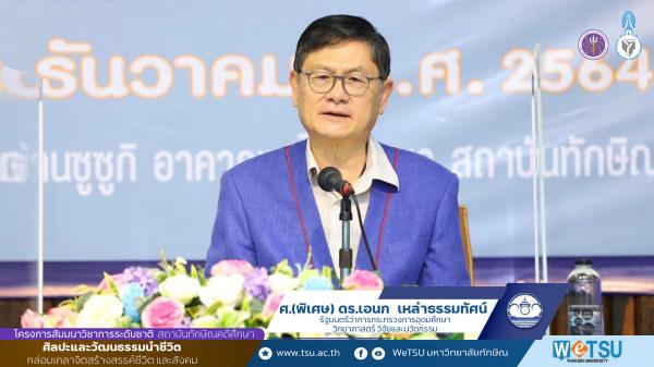 ในโอกาสนี้ ศ .(พิเศษ) ดร.เอนก เหล่าธรรมทัศน์ รัฐมนตรีว่าการ กระทรวงการอุดมศึกษา วิทยาศาสตร์ วิจัยและนวัตกรรม ปาฐกถาพิเศษ โครงการสัมมนาวิชาการระดับชาติ "ศิลปะและวัฒนธรรมนำชีวิต กล่อมเกลาจิต สร้างสรรค์ชีวิต และสังคม" กล่าวว่า การรักษาศิลปวัฒนธรรมเป็นการรักษาชาติ คำกล่าวนี้เป็นพระราชดำรัสของพระบาทสมเด็จพระบรมชนกาธิเบศร มหาภูมิพลอดุลยเดชมหาราช บรมนาถบพิตร ที่ให้ความสำคัญกับศิลปวัฒนธรรมไทยเป็นอย่างยิ่ง ผมมีความยินดีที่มาร่วมในงานวันนี้ ขอชื่นชมสถาบันทักษิณคดีศึกษา ขอชื่นชมมหาวิทยาลัยทักษิณ ซึ่งการมาตรวจเยี่ยมในครั้งนี้ผมได้มีโอกาสไปตรวจเยี่ยมทั้งวิทยาเขตพัทลุงและวิทยาเขตสงขลา ผมได้เล็งเห็นว่า ม.ทักษิณ มีบทบาทสำคัญในการสร้างนวัตกรรมทางสังคม สถาบันทักษิณคดีศึกษาเป็นสถาบันแนวหน้าที่มีการศึกษาทางด้านโบราณคดี ศิลปวัฒนธรรม ผมหวังว่าในอนาคต มหาวิทยาลัยทักษิณและมหาวิทยาลัยอื่นๆ ที่สนใจจะเข้ามามีส่วนร่วมผลักดันโครงการและดำเนินการในส่วนที่เกี่ยวข้อง เป็นส่วนหนึ่งที่สำคัญร่วมกับวิทยาสถานสังคมศาสตร์ มนุษยศาสตร์ และศิลปกรรมศาสตร์ หรือเรียกว่า ธัชชา ของ อว. ซึ่งเราศึกษาโบราณคดีประวัติศาสตร์ ศิลปวัฒนธรรม ย้อนไปสู่ยุคสุวรรณภูมิ ซึ่งเป็นโอกาสที่จะทำให้เราได้มีบทบาทสูงขึ้น ผมขอเชิญชวนนักปราชญ์ นักวิชาการหรือบุคลากรในแวดวงการศึกษา มาช่วยกันคิด ช่วยกันริเริ่ม ช่วยกันทำให้ศิลปวัฒนธรรมของไทยกลายเป็นวัฒนธรรมระดับโลกและไม่สูญหายไปกับกาลเวลา รวมทั้งมหาวิทยาลัยทักษิณ มีศักยภาพที่จะทำการศึกษา วิจัย สร้างสรรค์เกี่ยวกับศิลปวัฒนธรรม เกี่ยวกับอารยธรรมโบราณและทุกๆอย่างที่เป็นของไทย และพยายามอธิบายให้ได้ว่า ทำไมเราถึงมีมรดกทางวัฒนธรรมสูงขนาดนี้และนำมาถอดเป็นบทเรียนและเผยแพร่ต่อไป
