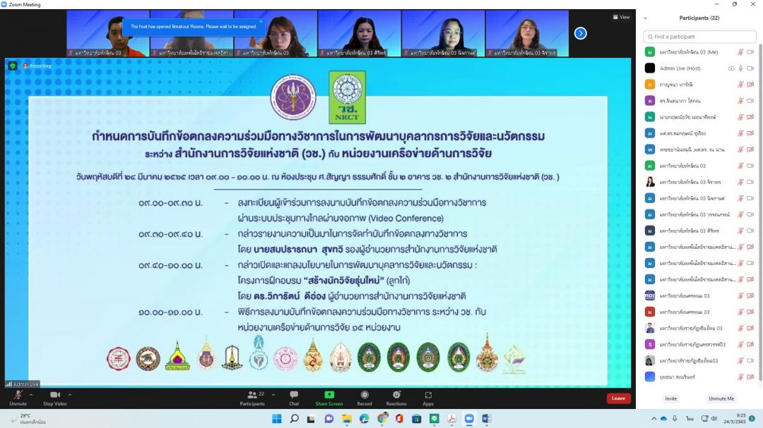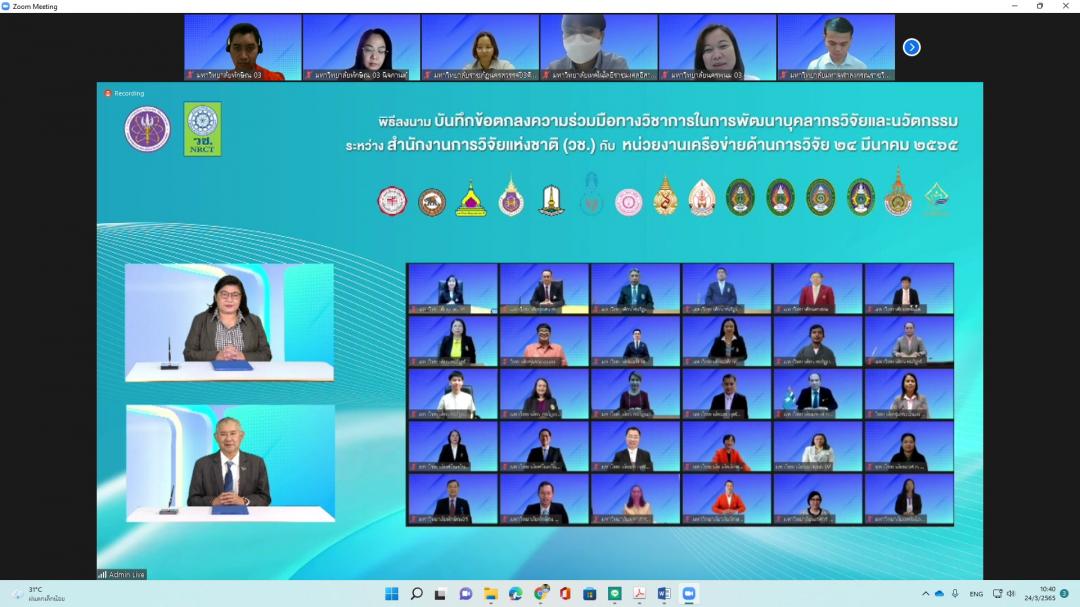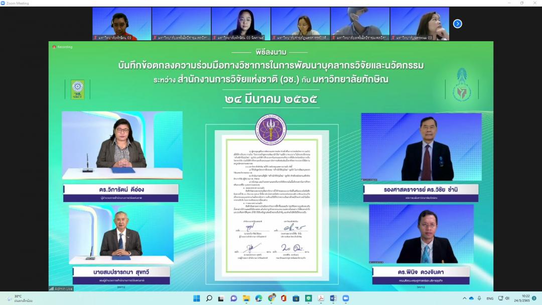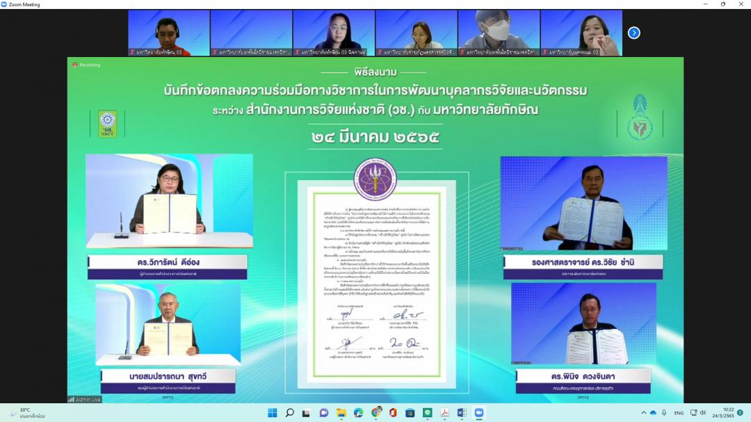 เมื่อวันที่ 24 มีนาคม 2565 มหาวิทยาลัยทักษิณ โดยคณะเศรษฐศาสตร์และบริหารธุรกิจ ร่วมกับ สำนักงานการวิจัยแห่งชาติ (วช.) ตกลงทำความร่วมมือทางวิชาการ (MOU) ในการพัฒนาบุคลากรวิจัยและนวัตกรรม ภายใต้โครงการฝึกอบรม “สร้างนักวิจัยรุ่นใหม่” (ลูกไก่) ประจำปีงบประมาณ พ.ศ. 2565โดยมีวัตถุประสงค์ เพื่อสร้าง พัฒนา และยกระดับศักยภาพนักวิจัยรุ่นใหม่ให้มีความรู้ และประสบการณ์ในการทำวิจัยอย่างมีระบบมากขึ้น ทั้งในนเชิงคุณภาพและปริมาณ และเพื่อสร้างและพัฒนาผลงานวิจัยและนวัตกรรม และเพิ่มขีดความสามารถในการแข่งขันของประเทศ โดยจัดให้มีพิธีลงนาม ผ่านระบบประชุมทางไกลผ่านจอภาพ (Video Conference)
