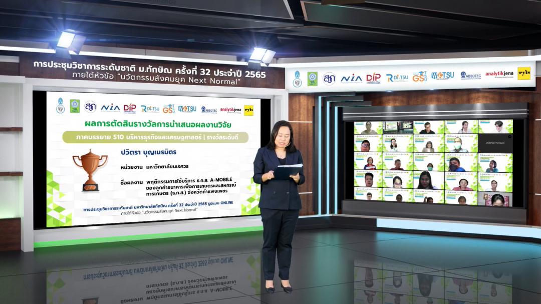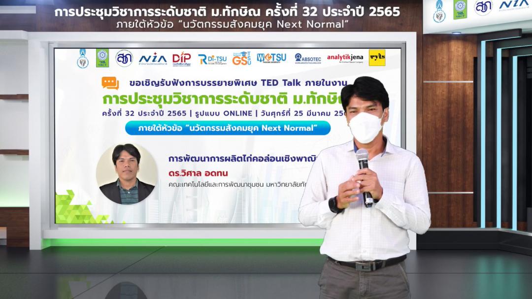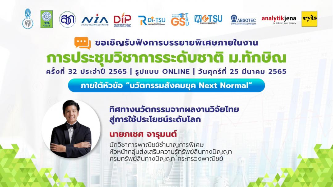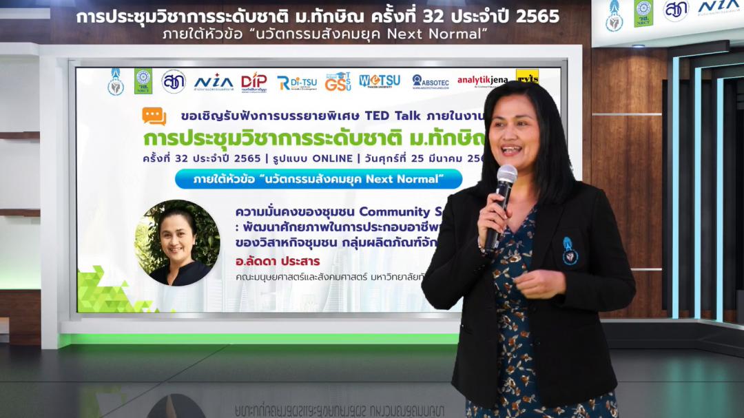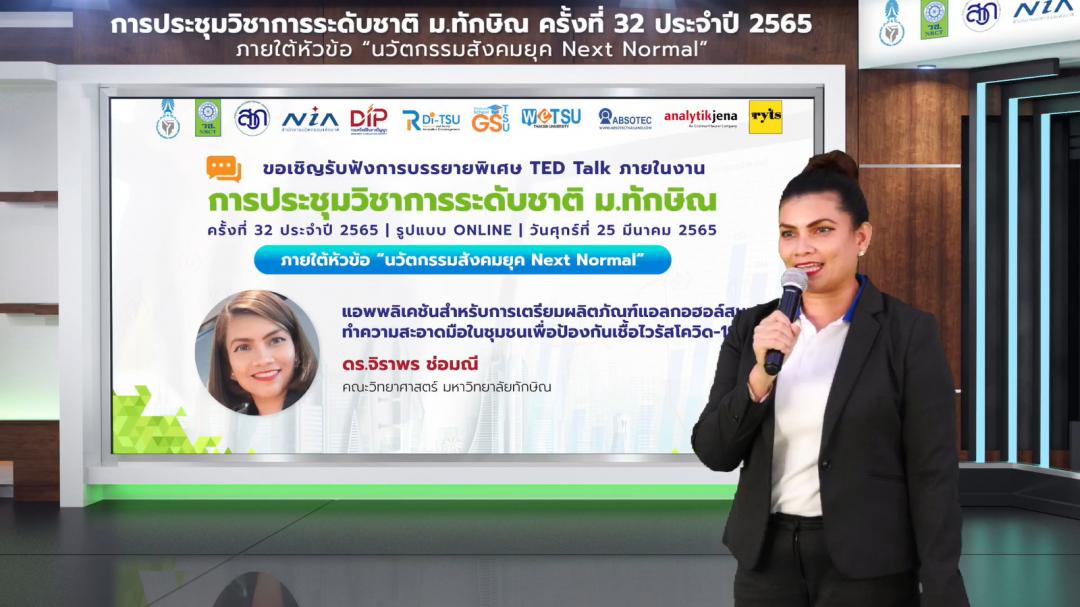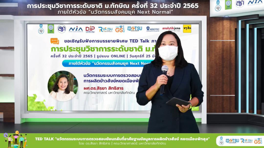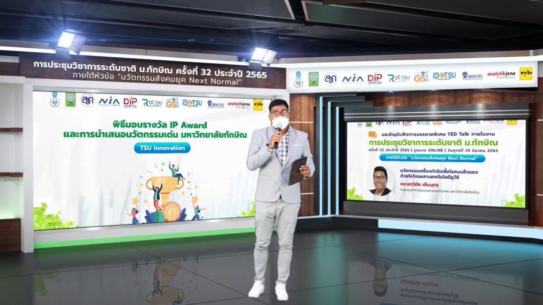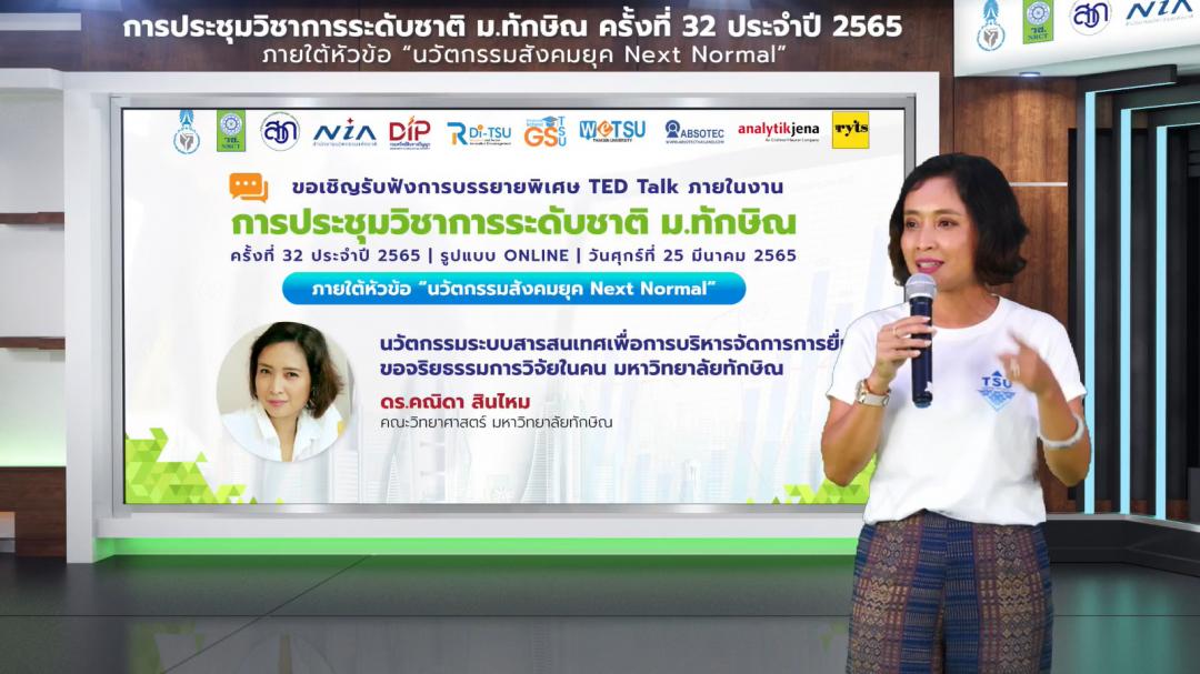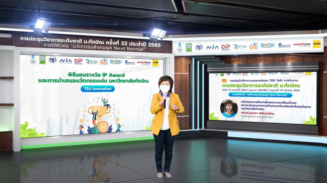 โดยภายในงานมีการมอบโล่เกียรติคุณ IP Award แก่รองศาสตราจารย์ ดร.กนกพร สังขรักษ์ คณะวิทยาศาสตร์ มหาวิทยาลัยทักษิณ ผู้ประดิษฐ์ที่มีการยื่นจดทะเบียนทรัพย์สินทางปัญญาสูงสุดระหว่างปี พ.ศ. 2556-2564 (จำนวน 16เรื่อง) การบรรยายพิเศษ หัวข้อ “ทิศทางนวัตกรรมจากผลงานวิจัยไทยสู่การใช้ประโยชน์ระดับโลก” โดย คุณภเชค จารุมนต์ นักวิชาการพาณิชย์ชำนาญการพิเศษ หัวหน้ากลุ่มส่งเสริมความรู้ทรัพย์สินทางปัญญา กรมทรัพย์สินทางปัญญา กระทรวงพาณิชย์ การบรรยายพิเศษ TED Talk ผลงานนวัตกรรมจากนักวิจัยมหาวิทยาลัยทักษิณ 7 นวัตกรรม ได้แก่ 1.นวัตกรรมระบบการตรวจสอบย้อนกลับที่อาศัยฐานข้อมูลการผลิตข้าวสังข์หยดเมืองพัทลุง โดย ผศ.ดร.สิรยา สิทธิสาร คณะวิทยาศาสตร์ 2.นวัตกรรมเครื่องกำจัดเชื้อโรคบนสิ่งของด้วยโอโซนผสานเทคโนโลยียูวีซี โดย ดร.พรวิชัย เต็มบุตร คณะอุตสาหกรรมเกษตรและชีวภาพ 3.แอพพลิเคชันสำหรับการเตรียมผลิตภัณฑ์แอลกอฮอล์สมุนไพรทำความสะอาดมือในชุมชนเพื่อป้องกันเชื้อไวรัสโควิด-19 โดย ดร.จิราพร ช่อมณี คณะวิทยาศาสตร์ 4.การพัฒนาการผลิตไก่คอล่อนเชิงพาณิชย์ โดย ดร.วิศาล อดทน คณะเทคโนโลยีและการพัฒนาชุมชน 5.ความมั่นคงของชุมชน Community Security:พัฒนาศักยภาพในการประกอบอาชีพจักรสานคลุ้มของวิสาหกิจชุมชน กลุ่มผลิตภัณฑ์จักรสานคลุ้มบ้านทุ่งใน โดย อ.ลัดดา ประสาน คณะมนุษยศาสตร์และสังคมศาสตร์ 6.นวัตกรรมการศึกษาเพื่อลดความเหลื่อมล้ำและยกระดับคุณภาพการศึกษาของโรงเรียนในถิ่นทุรกันดาร มหาวิทยาลัยทักษิณ โดย ผศ.ดร.มณฑนา พิพัฒน์เพ็ญ คณะศึกษาศาสตร์ และ7.นวัตกรรมระบบสารสนเทศเพื่อการบริหารจัดการการยื่นขอจริยธรรมการวิจัยในคน มหาวิทยาลัยทักษิณ โดย ดร.คณิดา สินไหม คณะวิทยาศาสตร์ รวมถึงการประกาศผลการนำเสนอนวัตกรรมเด่น มหาวิทยาลัยทักษิณ “TSU Innovation”จากการนำเสนองานวิจัยภาคบรรยาย จำนวน 140 ผลงาน และภาคโปสเตอร์ จำนวน 150 ผลงาน ในสาขาทางวิชาการประกอบด้วย ผลงานสร้างสรรค์, วิทยาศาสตร์ชีวภาพและเกษตรศาสตร์, วิทยาศาสตร์เคมีและเภสัช, ฟิสิกส์ศึกษา ฟิสิกส์ประยุกต์และวิศวกรรมศาสตร์, คณิตศาสตร์และคอมพิวเตอร์, วิทยาศาสตร์สุขภาพ, การศึกษา, มนุษยศาสตร์, สังคมศาสตร์, บริหารธุรกิจและเศรษฐศาสตร์, นวัตกรรมสังคม