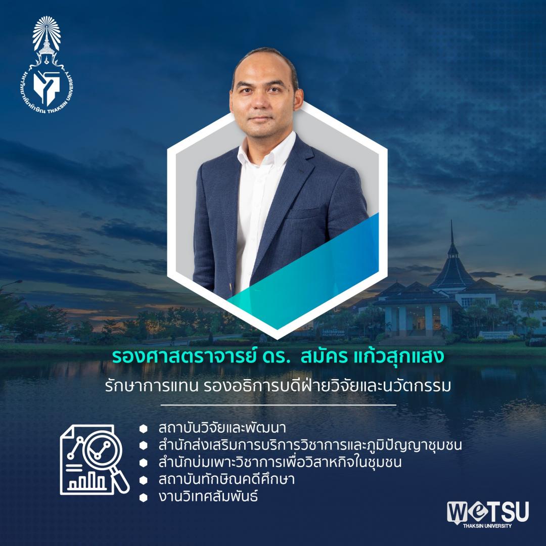 4. รองศาสตราจารย์ ดร. สมัคร แก้วสุกแสง เป็น ผู้รักษาการแทนรองอธิการบดีฝ่ายวิจัยและนวัตกรรม