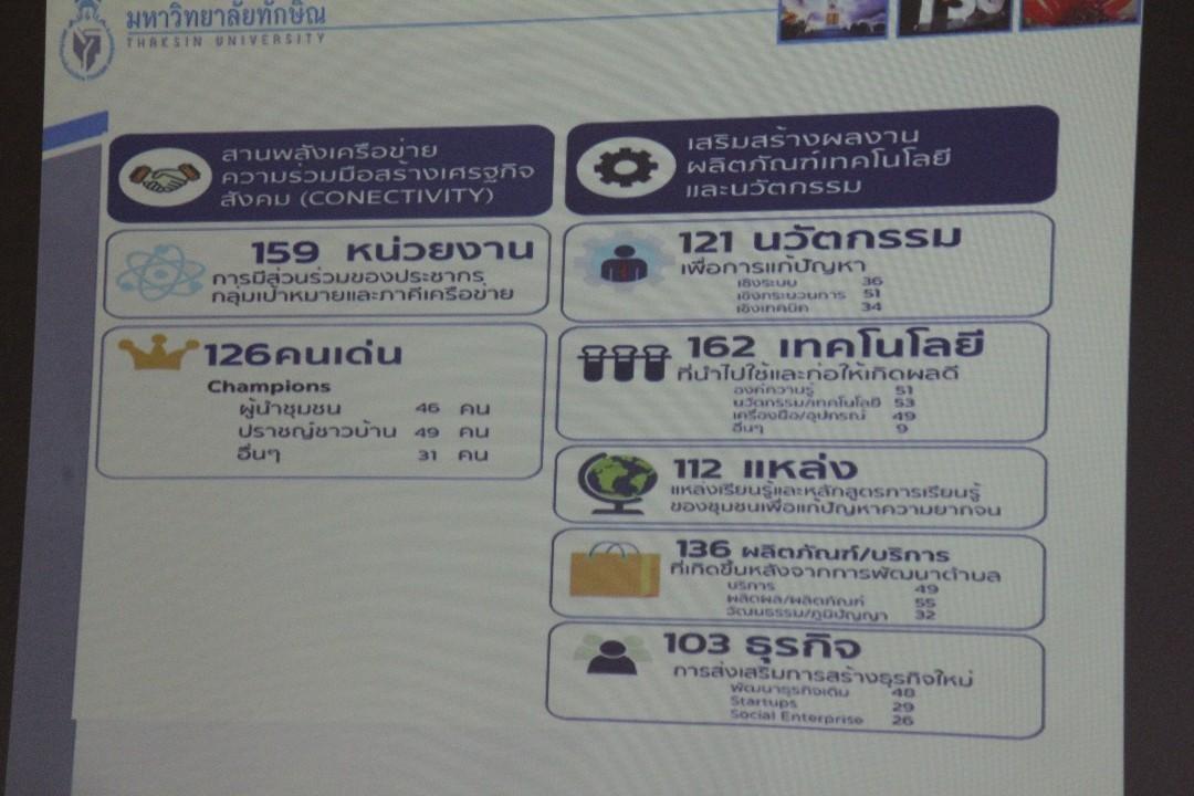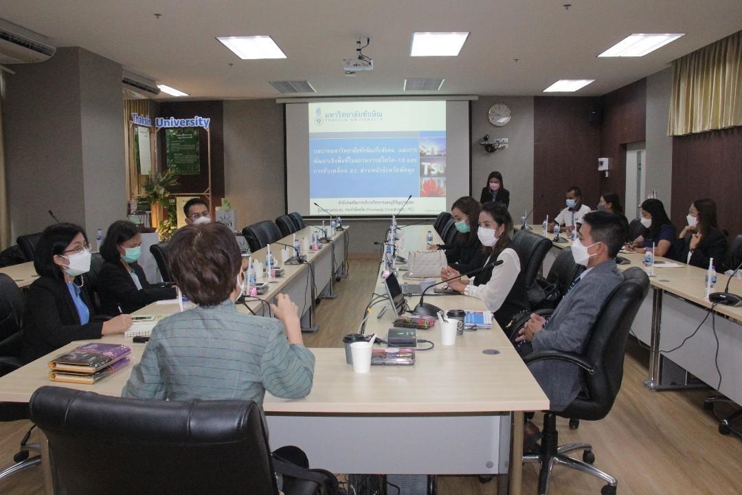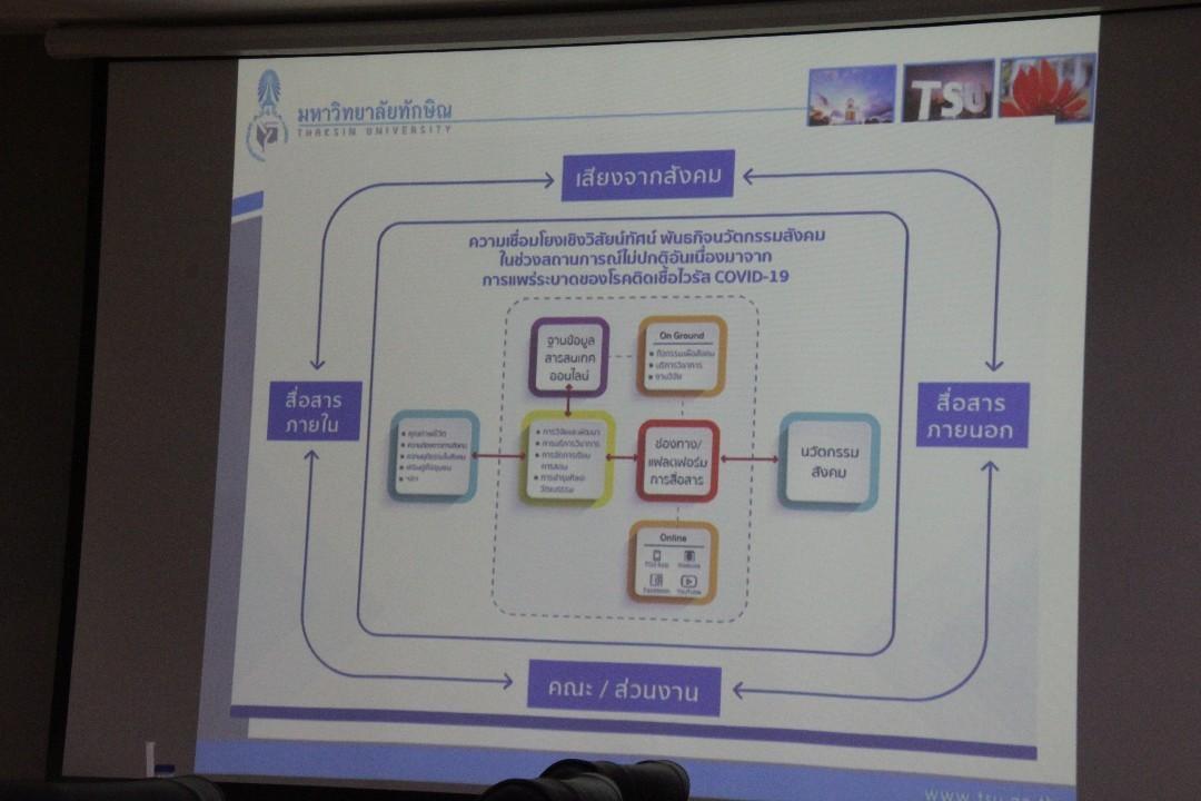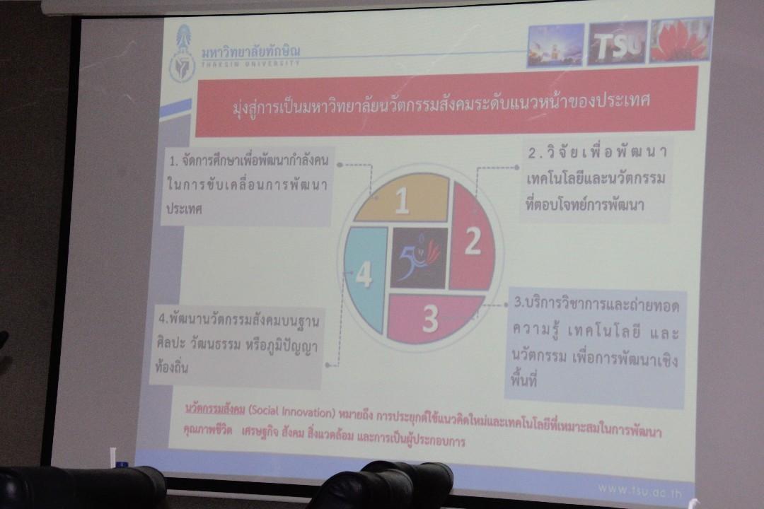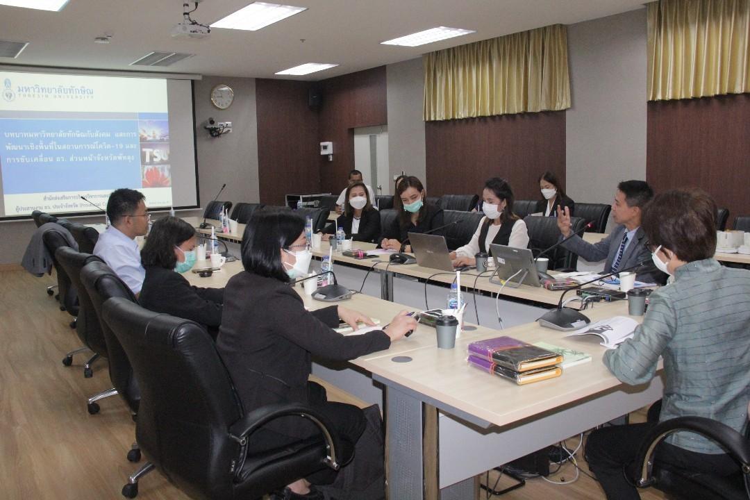 ในการนี้ รองศาสตราจารย์ ดร. ณฐพงศ์ จิตรนิรัตน์ ผู้รักษาการแทนอธิการบดี มหาวิทยาลัยทักษิณ พร้อมด้วยคณะผู้บริหารสำนักส่งเสริมการบริการวิชาการและภูมิปัญญาชุมชน (สสช.) ร่วมให้ข้อมูล อาจารย์ ดร.นิชากรณ์ พันธ์คง รักษาการแทนผู้อำนวยการ สสช. ได้นำเสนอบทบาทมหาวิทยาลัยทักษิณกับสังคมและการพัฒนาเชิงพื้นที่ในสถานการณ์โควิด-19 และการขับเคลื่อน อว.ส่วนหน้าจังหวัดพัทลุง ประเด็นเกี่ยวกับการดำเนินภารกิจเชิงบูรณาการกับหน่วยงานที่เกี่ยวข้องในพื้นที่จังหวัดพัทลุง การยกระดับเศรษฐกิจและสังคมรายตำบลแบบบูรณาการ การจัดทำฐานข้อมูลขนาดใหญ่ของชุมชน (Community Big Data) การพัฒนาพื้นที่จากปัญหาและความต้องการจากชุมชน และการจ้างงานประชาชน บัณฑิตใหม่และนักศึกษาเพื่อฟื้นฟูเศรษฐกิจชุมชน ได้ดำเนินการโครงการต่าง ๆ อย่างหลากหลายและต่อเนื่องตามยุทธศาสตร์มหาวิทยาลัยทักษิณเพื่อขับเคลื่อนชุมชน สอดคล้องกับยุทธศาสตร์ของประเทศในการขับเคลื่อนประเทศด้วย TSU BCG Model อาทิ โครงการจ้างงานประชาชนที่ได้รับผลกระทบจากสถานการณ์การระบาดของโรคติดเชื้อไวรัสโคโรนา 2019 (COVID-19) ระยะ 1 และระยะ 2 โครงการ “นวัตกรชุมชน” มหาวิทยาลัยทักษิณ เป็นโครงการภายใต้โครงการมหาวิทยาลัยสู่ตำบล สร้างรากแก้วให้ประเทศ (TSU-2T) พื้นที่ 65 ตำบลจังหวัดพัทลุงและจังหวัดสงขลา และพื้นที่ 166 ตำบล ของจังหวัดพัทลุง สงขลาและ นครศรีธรรมราช โดยโครงการ TSU2T ได้จัดทำระบบสารสนเทศ TSU2T Smart Ditgital for SMEs เพื่อการจัดทำฐานข้อมูลขนาดใหญ่ของสินค้าเด่นจากการพัฒนาตำบลในโครงการ ซึ่งมีผลิตภัณฑ์ออกสู่ตลาด ซึ่งเป็นการสะท้อนกระบวนการพัฒนาภายใต้โมเดล BCG การจัดตั้งโรงพยาบาลสนามโดยใช้พื้นที่ สำนักส่งเสริมการบริการวิชาการและภูมิปัญญาชุมชน เป็นต้น นอกจากนั้น ผู้ตรวจราชการ อว. ยังได้ร่วมรับฟังและหารือกับคณะผู้บริหารมหาวิทยาลัยทักษิณ ให้คำแนะนำข้อเสนอแนะด้านปัญหาและอุปสรรคในการดำเนินการ พร้อมให้ข้อมูลที่สนับสนุนที่เป็นประโยชน์สำหรับการขับเคลื่อนนโยบายและยุทธศาสตร์ของมหาวิทยาลัยทักษิณ