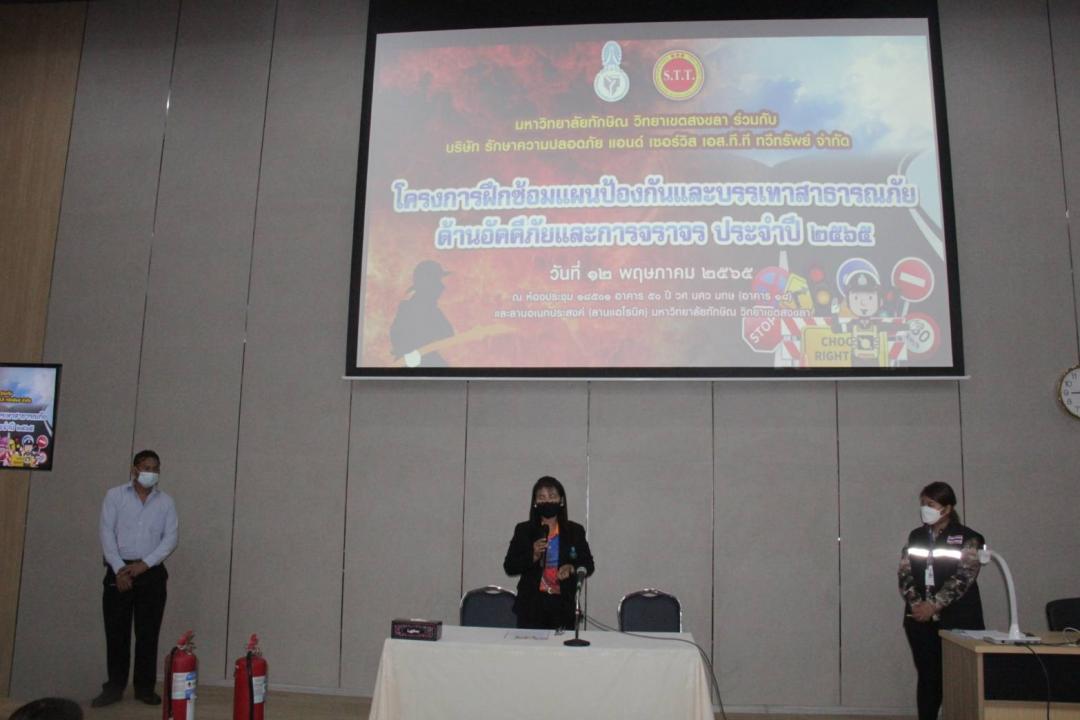 วันที่ 12 พฤษภาคม 2565 ฝ่ายบริหารวิทยาเขตสงขลา มหาวิทยาลัยทักษิณ จัดโครงการฝึกซ้อมแผนป้องกันาและบรรเทาสาธารณภัยด้านอัคคีภัยและการจราจร ประจำปี 2565 โดยความร่วมมือกับบริษัทรักษาความปลอดภัย แอนด์ เซอร์วิสเอส ที ที ทวีทรัพย์ จำกัด โดยมีวัตถุประสงค์เพื่อเตรียมความพร้อมในการรับมือเผชิญเหตุฉุกเฉิน เมื่อเกิดอัคคีภัย และสร้างความรู้ ฝึกทักษะปฏิบัติในการป้องกันอัคคีภัยให้แก่บุคลากร เจ้าหน้าที่รักษาความปลอดภัย และเจ้าหน้าที่ประจำอาคารต่างๆ ภายในมหาวิทยาลัยทักษิณ วิทยาเขตสงขลา โดยภาคเช้าเป็นการบรรยายและฝึกปฏิบัติการใช้อุปกรณ์ดับไฟเบื้องต้น โดยคุณสมบูรณ์ จุลสุรางค์ และทีมวิทยากรของงานป้องกันและบรรเทาสาธารณภัย เทศบาลนครสงขลา ส่วนภาคบ่าย การเรียนรู้ด้านกฎหมายและกฎจราจร โดย พันตํารวจโท จรัญ ชูจิตต์ รองผู้กํากับการสถานีตํารวจภูธรเมืองสงขลา และ ร้อยตํารวจโท จตุพล แก้วแสงอ่อน รองสารวัตร จราจรสถานีตํารวจภูธรเมืองสงขลาถ่ายทอดความรู้ และตอบข้อซักถาม ปิดท้ายด้วยกิจกรรมฝึกซ้อมให้ความช่วยเหลือผู้ประสบภัยและการปฐมพยาบาลเบื้องต้น โดยคณะวิทยากรจากงานป้องกันและบรรเทาสาธารณภัย เทศบาลนครสงขลา สำหรับกิจกรรมในครั้งนี้มีผู้เข้าร่วมฝึกอบรมจากหน่ายงานต่างๆ กว่า 80 คน