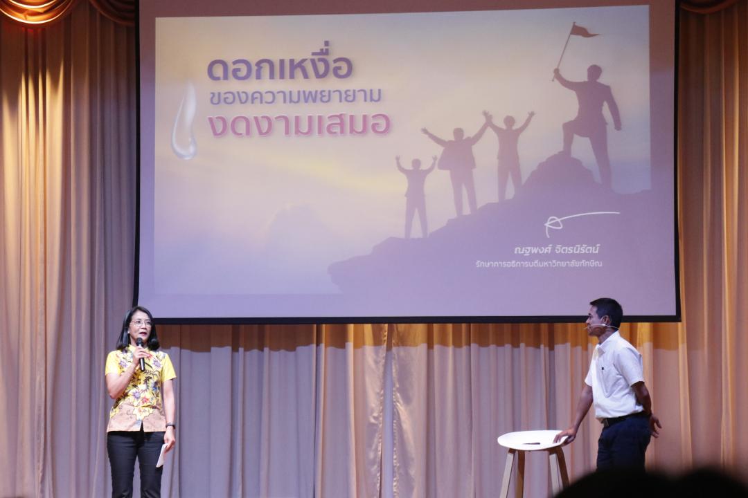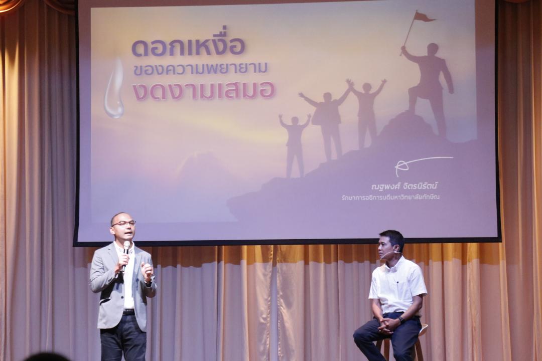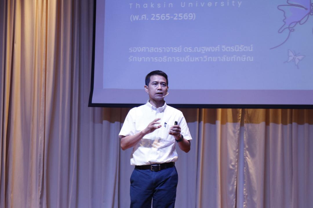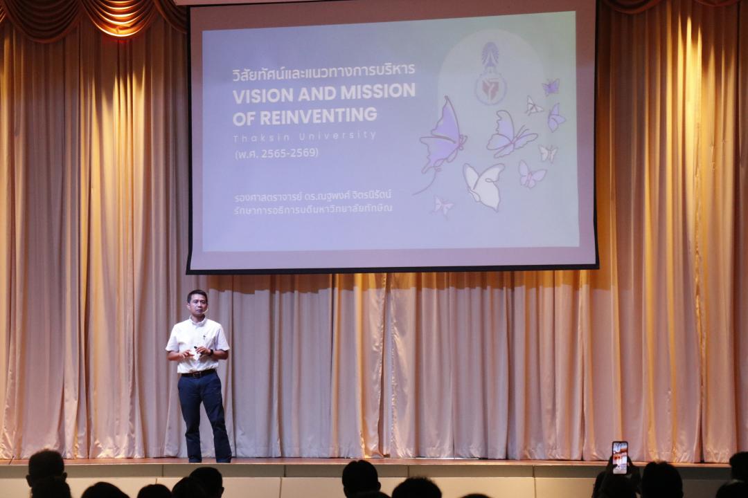 มหาวิทยาลัยทักษิณในขณะนี้มีความท้าทาย 2 เรื่อง คือ เรื่องของการประกาศวิสัยทัศน์มหาวิทยาลัยนวัตกรรมสังคม และเรื่องของการเป็นมหาวิทยาลัยกลุ่ม 2 มหาวิทยาลัยเทคโนโลยีและนวัตกรรม การวางหมุดหมาย หรือภาพฝันขององค์กรที่อยากให้เกิดขึ้น จึงเป็นอีกหนึ่งสิ่งที่สำคัญ องค์กรที่จะพัฒนาแบบก้าวกระโดดได้ต้องให้ความสำคัญกับภาพฝัน ภาพของอนาคต มากกว่าภาพจำ “ถ้าอดีตยาวอนาคตเราจะสั้น ถ้าอดีตสั้นอนาคตเราจะยาว” แต่ไม่ได้หมายความว่า อดีตไม่ใช่เรื่องสำคัญ แต่อดีตนั้นคือบทเรียนสำคัญให้เราขับเคลื่อนองค์กรไปข้างหน้า วันนี้เราต้องคิดก้าวกระโดดให้มากขึ้น เพราะในวันนี้เรากำลังเผชิญกับวิกฤตรอบด้าน หลักในการทำงานจำเป็นต้องคิดให้เร็ว ทำให้ไว ใจต้องกล้า โดยนำข้อมูลมาวิเคราะห์ สังเคราะห์ จินตนาการออกมาเป็นแผนงานแล้วลงมือทำและสร้างตัวชี้วัดที่ชัดเจน เพื่อไปสู่การเปลี่ยนแปลงในทิศทางใหม่ของมหาวิทยาลัยทักษิณ