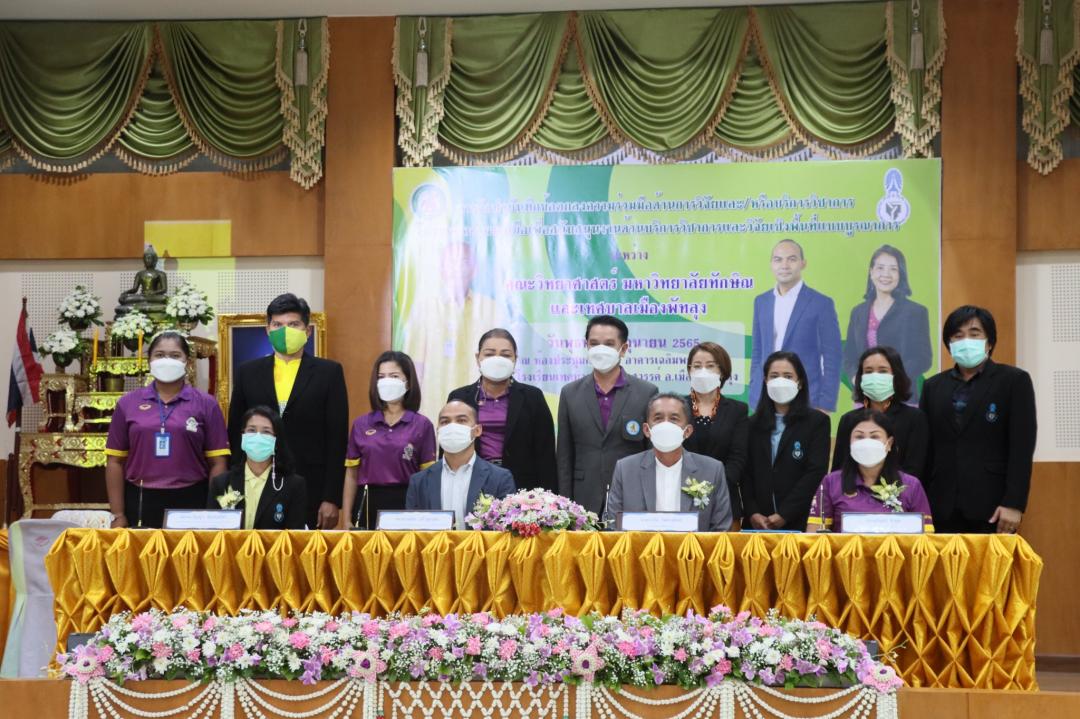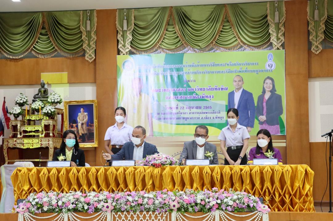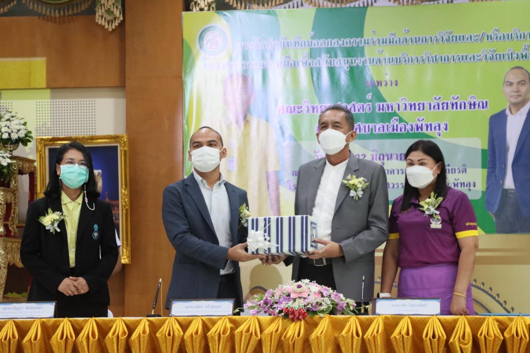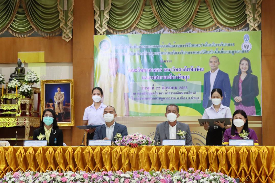 วันที่ 22 มิถุนายน 2565 เวลา 09.00 น. มหาวิทยาลัยทักษิณ ร่วมกับ เทศบาลเมืองพัทลุง จัดทำบันทึกข้อตกลงความร่วมมือด้านการวิจัยและ /หรือบริการวิชาการ โครงการความร่วมมือเพื่อสนับสนุนงานด้านบริการวิชาการและวิจัยเชิงพื้นที่แบบบูรณาการระหว่าง คณะวิทยาศาสตร์ มหาวิทยาลัยทักษิณ และเทศบาลเมืองพัทลุง โดยมี นายวาทิต ไพศาลศิลป์ นายกเทศมนตรีเมืองพัทลุง นางจุรินทร์ ขำผุด รองปลัดเทศบาลเมืองพัทลุง รองศาสตราจารย์ ดร.สมัคร แก้วสุกแสง ผู้รักษาการแทนรองอธิการบดีฝ่ายวิจัยและนวัตกรรม และ ผู้ช่วยศาสตราจารย์ ดร.ธัญญา พันธ์ฤทธิ์ดำ คณบดีคณะวิทยาศาสตร์และผู้รักษาการแทนรองอธิการบดีฝ่ายพัฒนาระบบนิเวศและโครงสร้างพื้นฐานพัทลุง ร่วมลงนามบันทึกข้อตกลงความร่วมมือโครงการดังกล่าว ณ ห้องประชุมศรีมาลา อาคารเฉลิมพระเกียรติ โรงเรียนเทศบาลบ้านคูหาสวรรค์
