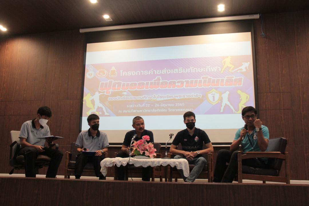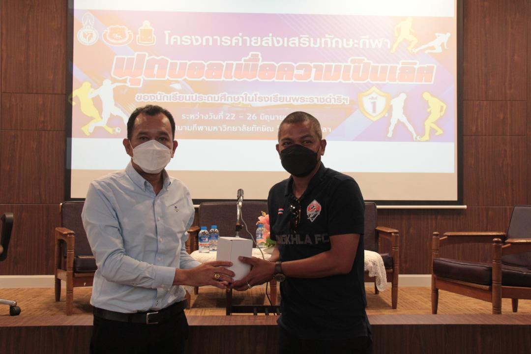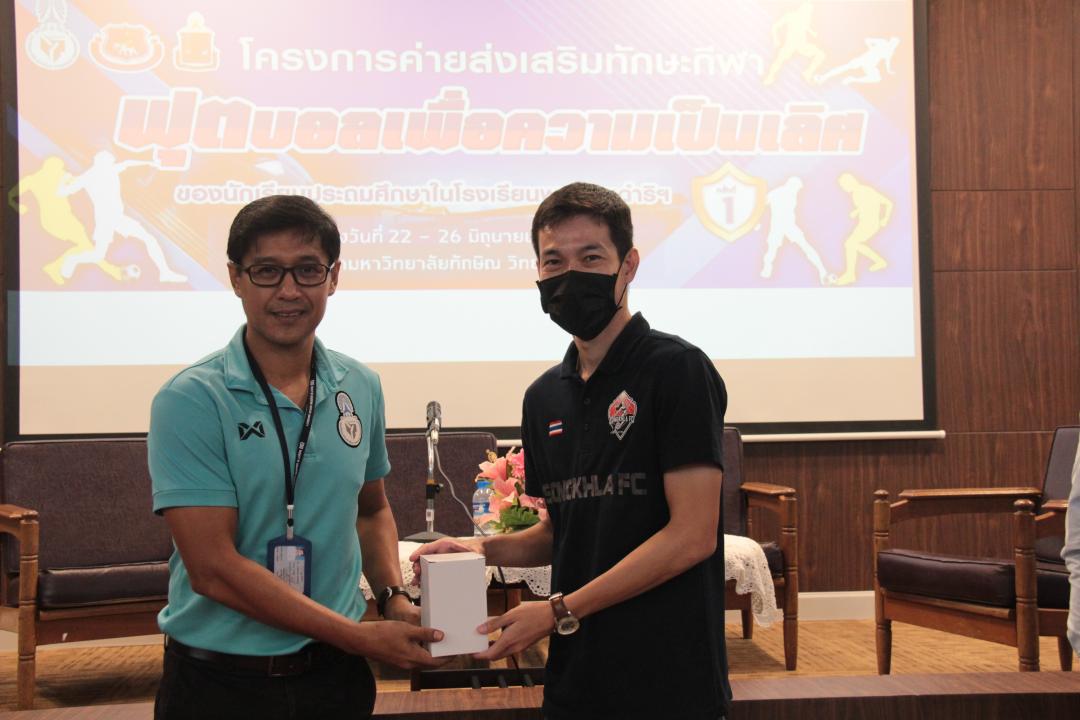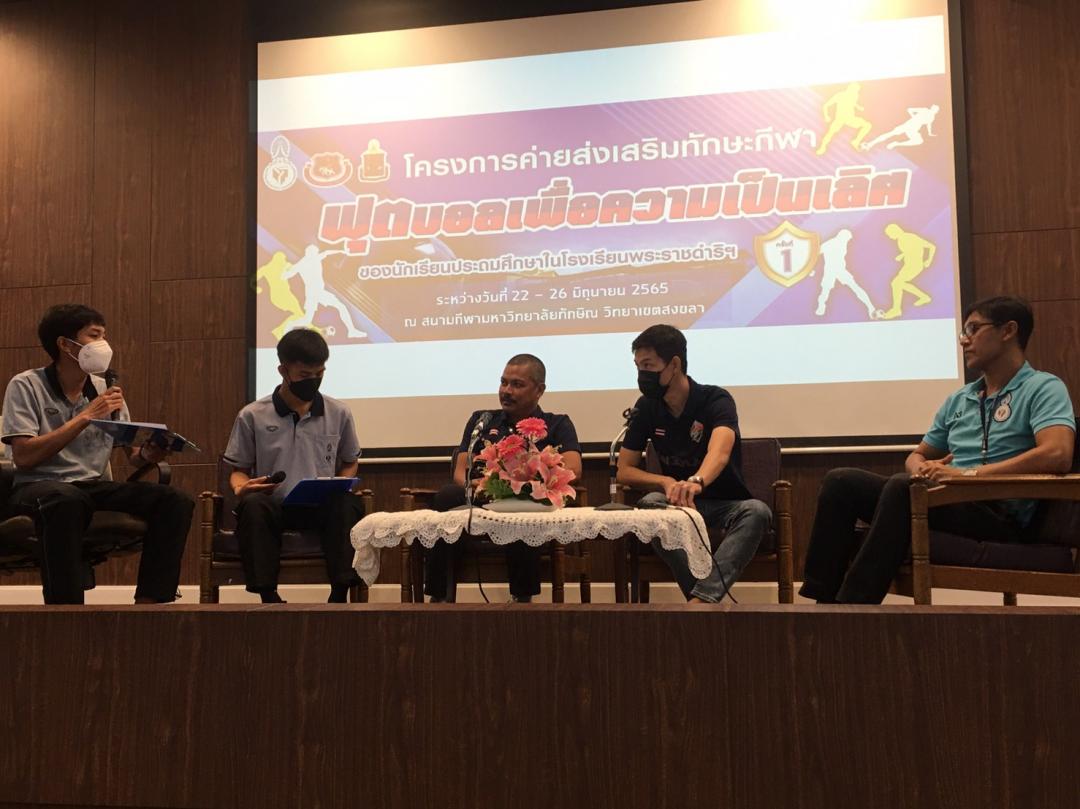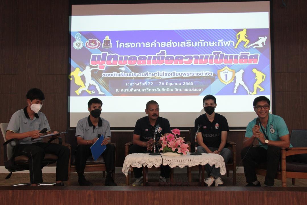 โดยเมื่อวันที่ 22 มิถุนายน 2565 ได้จัดพิธีเปิดค่ายโดยอาจารย์ ดร. นำโชค บัวดวงรักษาการแทนผู้ช่วยอธิการบดีฝ่ายกิจการนิสิตและพันธกิจสัมพันธ์ เป็นประธานเปิดค่ายอบรมทักษะกีฬาฟุตบอลฯ และได้รับเกียรติจากนายจักรธร สุริแสง นายกเทศมนตรีเมืองเขารูปช้าง และผู้บังคับบัญชากองกำกับการตำรวจตระเวนชายแดนที่ 43 ค่ายรามคำแหง คณะครูจากโรงเรียนในพระราชดำริและโรงเรียนขาดแคลนในพื้นที่การศึกษา 4 จังหวัดภาคใต้ เข้าร่วมในพิธีเปิดค่ายฯ ณ ห้องประชุมแสงสุริยา ชั้น 1 อาคารปฏิบัติการวิชาชีพครู คณะศึกษาศาสตร์ มหาวิทยาลัยทักษิณ วิทยาเขตสงขลา นอกจากนี้ยังมีการเสวนาโดย “โค้ชอู๊ด” นายสระราวุฒิ ตรีพันธ์ กุนซือมากประสบการณ์ของทีมฟุตบอล ‘สงขลา เอฟซี’ และ ร้อยตรีอภิภู สุนทรพนาเวศ หรือ “บาส” อดีตนักกีฬาฟุตบอลทีมชาติไทยรุ่นอายุไม่เกิน 23 ปี ในการแข่งขันซีเกมส์ ในปี พ.ศ. 2550 และ พ.ศ. 2552 ปัจจุบันสังกัดทีมสโมสรฟุตบอลสงขลา และอาจารย์ ดร.เทเวศน์ จันทร์หอม อดีตนักฟุตบอลทีมชาติไทย ซี่งมีนักเรียนที่เข้าร่วมการอบรมทั้งหมด 20 คน และมีนิสิตสาขาวิชาพลศึกษาและสุขศึกษาเข้าร่วมฝึกและดูแลนักเรียนอย่างใกล้ชิด โดยได้รับการกำกับดูแลจากวิทยากร 2 ท่าน ได้แก่ อาจารย์ ดร.เทเวศน์ จันทร์หอม และอาจารย์คัชชา ศิริรัตนพันธ์ สำหรับการอบรมภาคทฤษฎี เรื่องกฎ ระเบียบของการฝึกซ้อม และกฏ กติกา การแข่งขันฟุตบอล และการฝึกด้านสมรรถภาพ ความเร็วความคล่องแคล่วว่องไว การฝึกซ้อมเทคนิคการเลี้ยงฟุตบอล การเตะฟุตบอล และทักษะการเลี้ยงหลบคู่ต่อสู้ รวมถึงการส่งลูกเลียดให้เพื่อนร่วมทีม