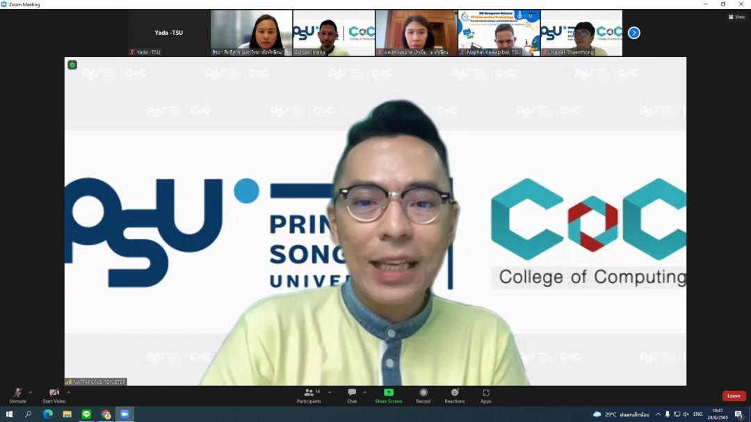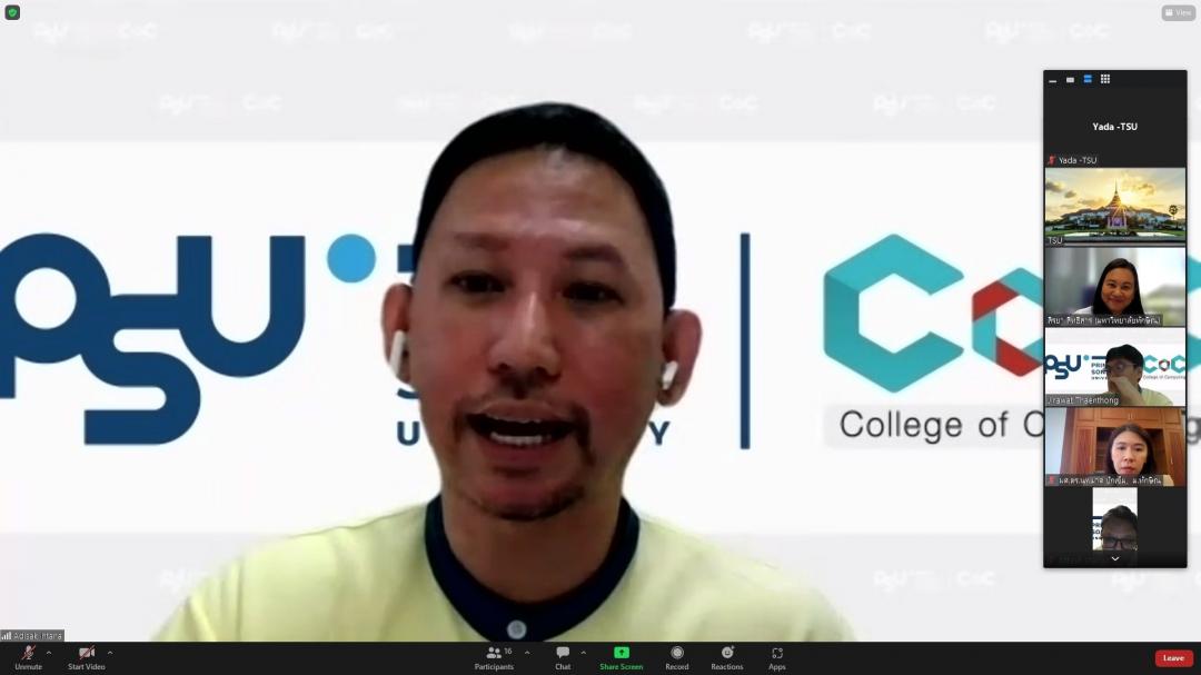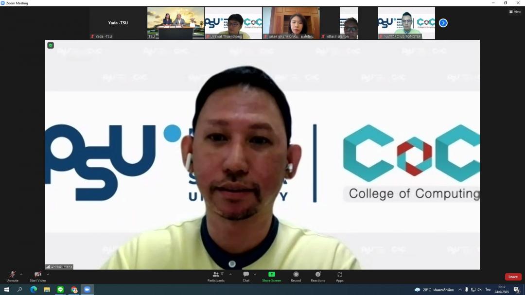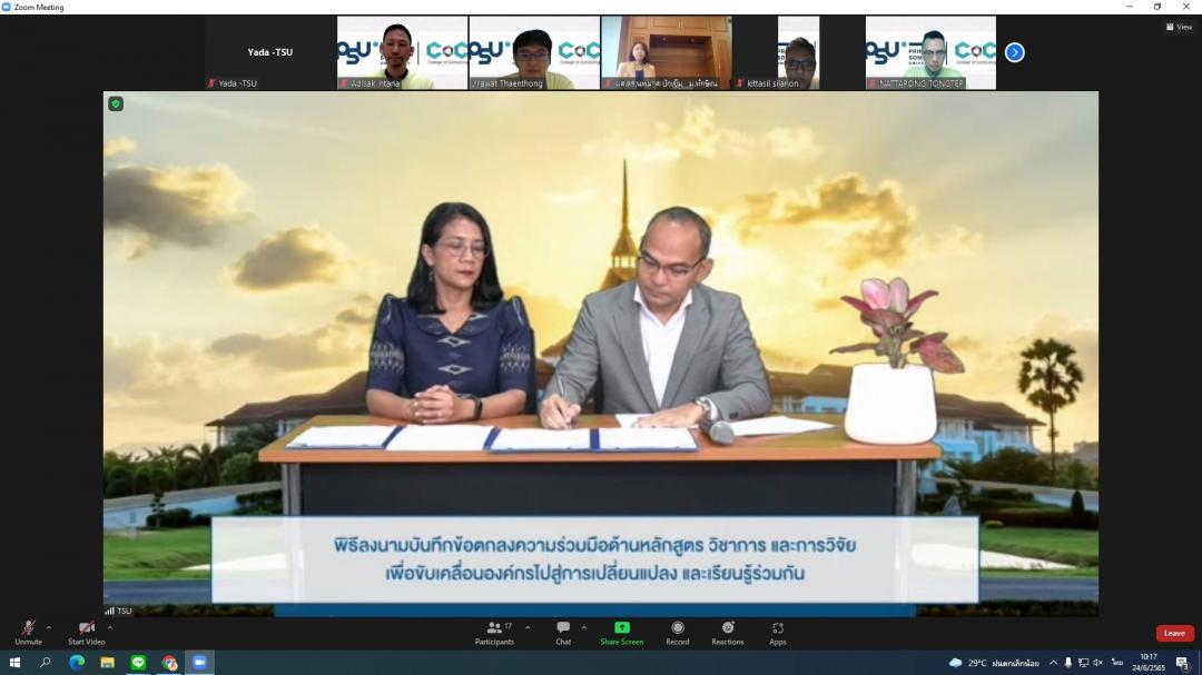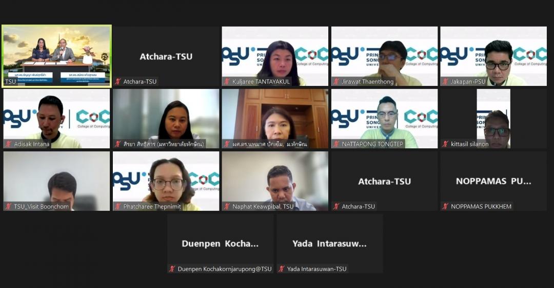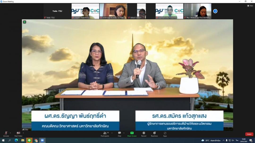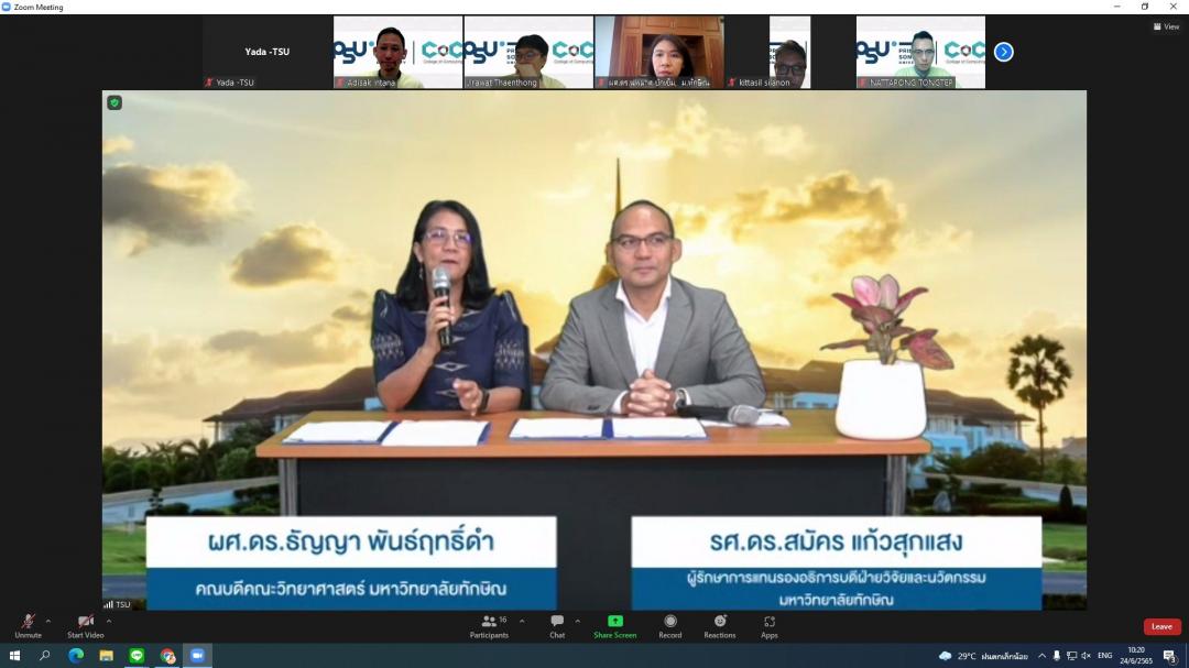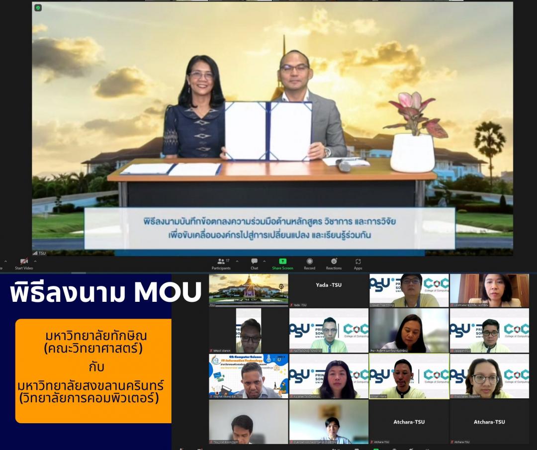 วันที่ 24 มิถุนายน 2565 มหาวิทยาลัยทักษิณ (คณะวิทยาศาสตร์) โดย รศ.ดร.สมัคร แก้วสุกแสง ผู้รักษาการแทนรองอธิการบดีฝ่ายวิจัยและนวัตกรรม มหาวิทยาลัยทักษิณ ผศ.ดร.ธัญญา พันธ์ฤทธิ์ดำ คณบดีคณะวิทยาศาสตร์ และผู้รักษาการแทนรองอธิการบดีฝ่ายพัฒนาระบบนิเวศและโครงสร้างพื้นฐานพัทลุง ลงนามในบันทึกข้อตกลงความมือ (MOU) ด้านหลักสูตร วิชาการ และการวิจัย กับ มหาวิทยาลัยสงขลานครินทร์ ภูเก็ต (วิทยาลัยการคอมพิวเตอร์) โดย อาจารย์ ดร.อดิศักดิ์ อินทนา รองคณบดีฝ่ายวิชาการ อาจารย์ ดร.กุลจรี ตันตยกุล ผู้ช่วยคณบดีฝ่ายพัฒนาหลักสูตรและนวัตกรรมการเรียนรู้ การลงนามบันทึกข้อตกลงความร่วมมือด้านหลักสูตร วิชาการ และการวิจัย เพื่อการขับเคลื่อนองค์กรไปสู่การแลกเปลี่ยนและเรียนรู้ร่วมกัน ระหว่างคณะวิทยาศาสตร์ มหาวิทยาลัยทักษิณ และ วิทยาลัยการคอมพิวเตอร์ มหาวิทยาลัยสงขลานครินทร์ จัดขึ้น ด้วยรูปแบบออนไลน์ ผ่านโปรแกรม Zoom